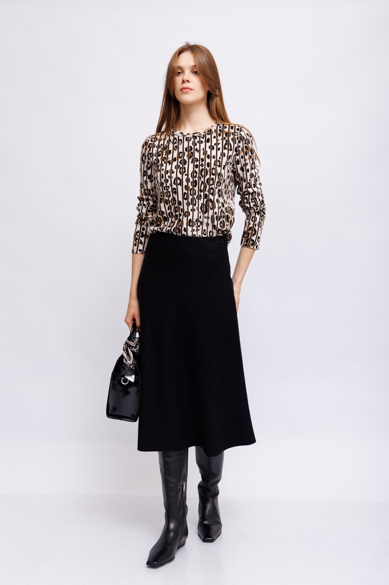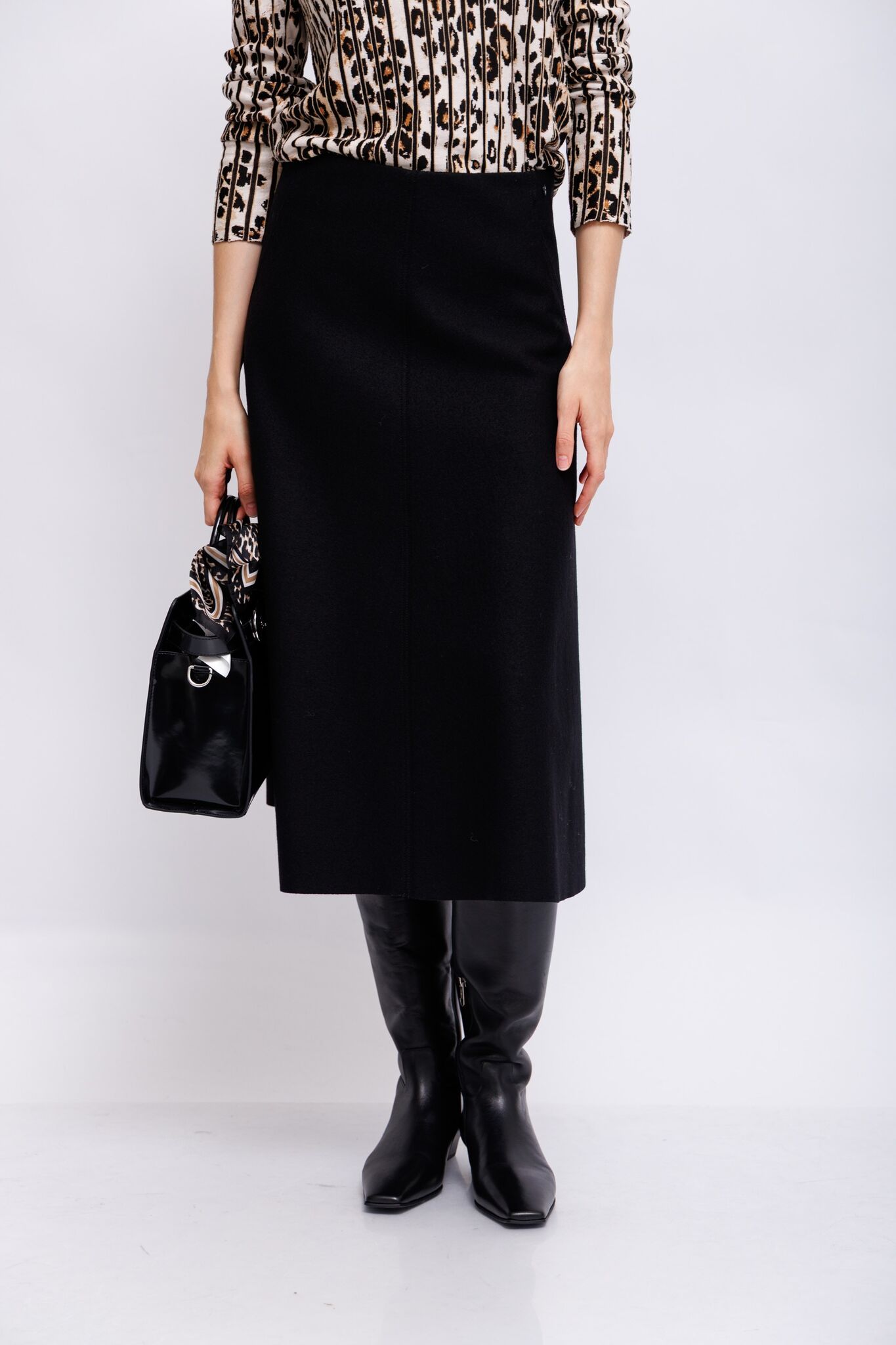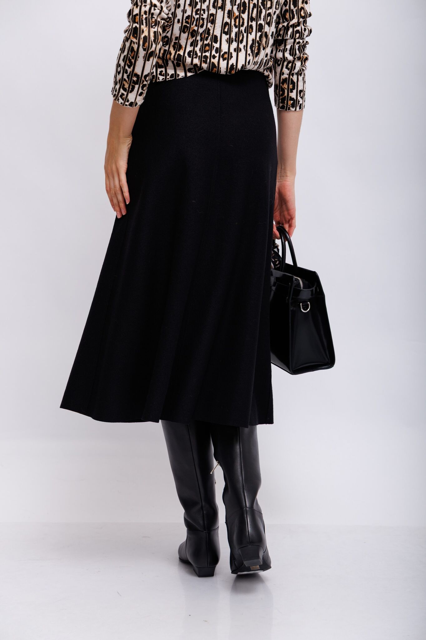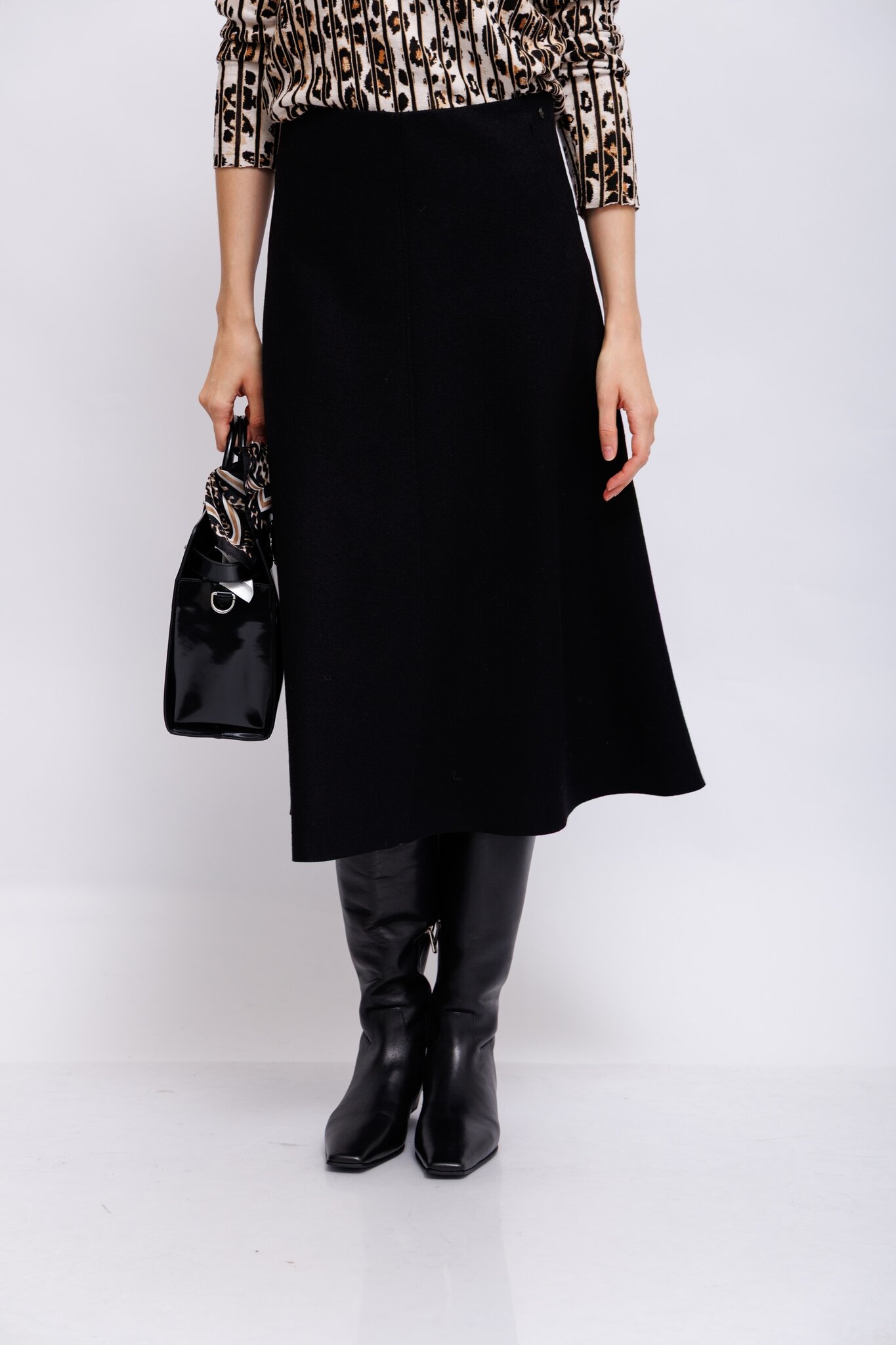 Длины миди из вареной чистой шерсти. Этот предмет одежды расклешен и имеет внутренний пояс. Подкладка из джерси придает ему гармоничный контур. Круто смотрится с высокими каблуками в стиле семидесятых. Юбка связана в Германии: она связана и отделана с использованием новейших технологий в Германии. Отдельные части сшиваются на европейских партнерских предприятиях.