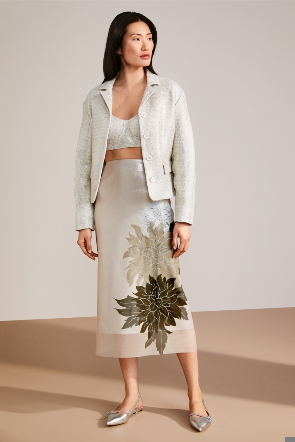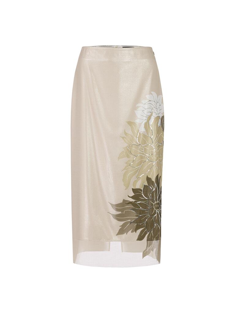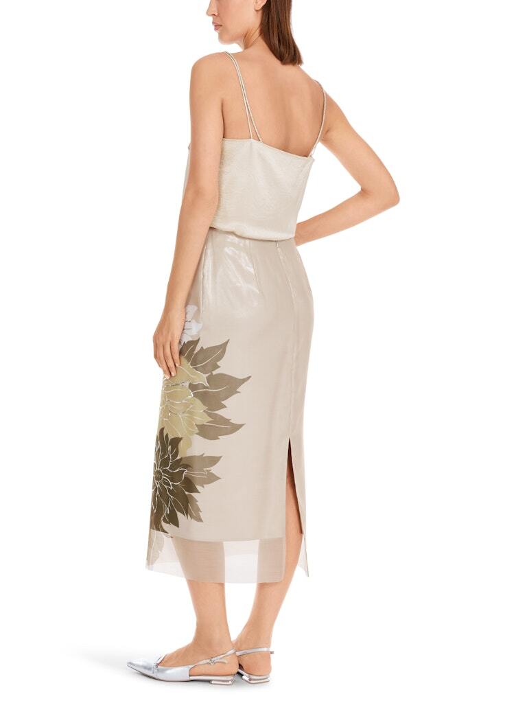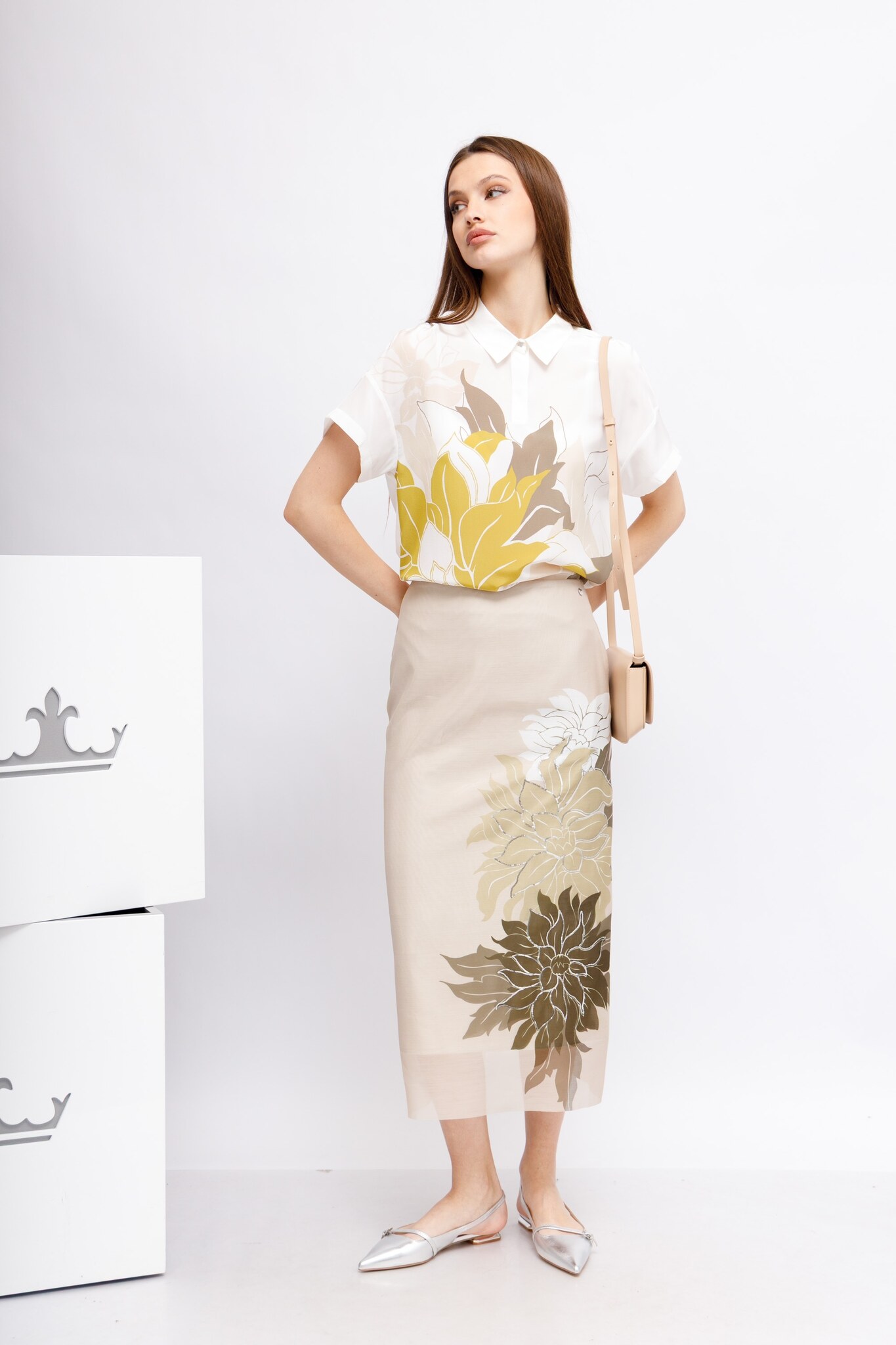 В сочетании цвета глубоководной жемчужины, пудрового шалфея и светло-бежевого. Изготовленная из блестящей ткани с размещенным цветочным узором, эта юбка является интересным объектом внимания. Силуэт в форме карандаша. С разрезом сзади эта юбка длиной до икры очень удобна в носке. Эта модель без пояса и застегивается сзади на молнию.
