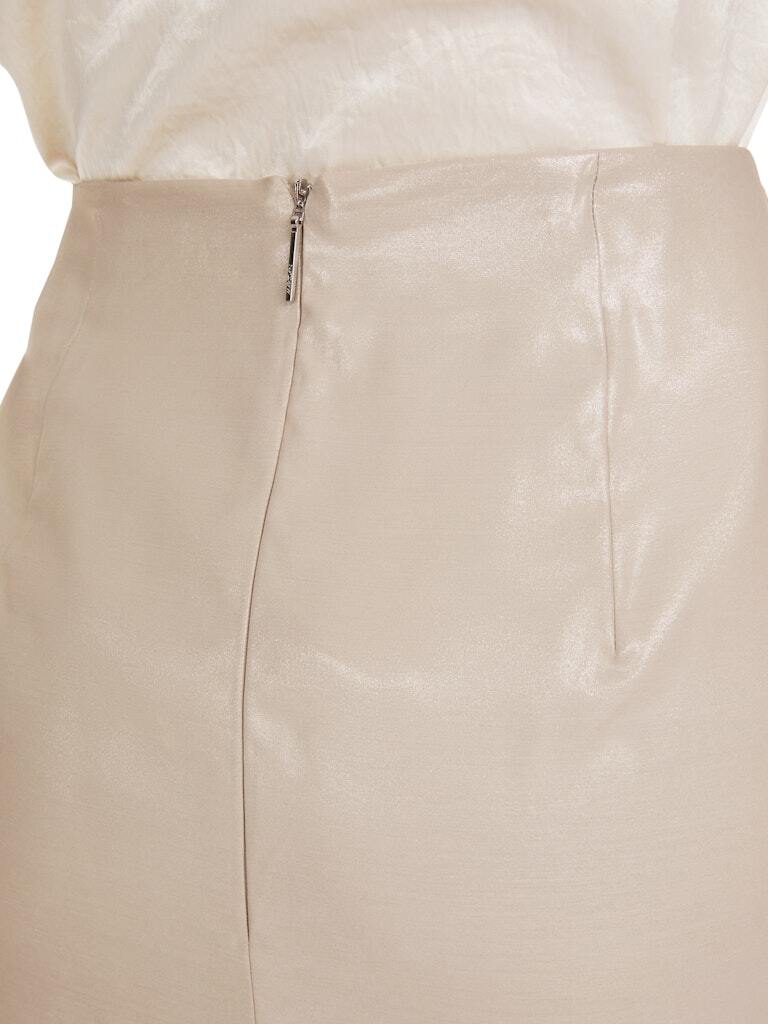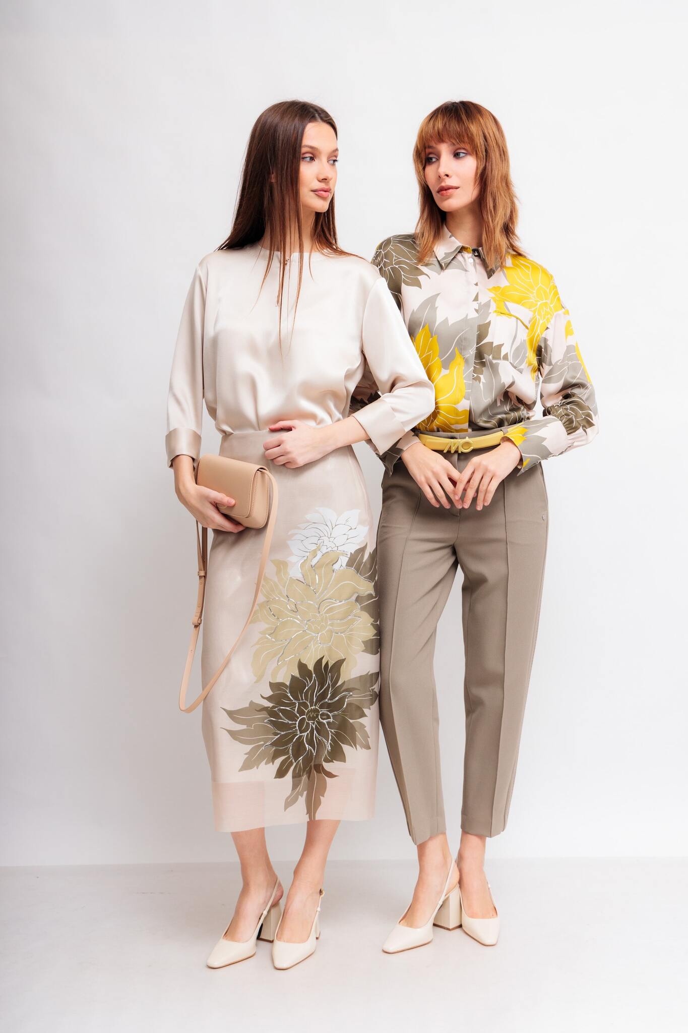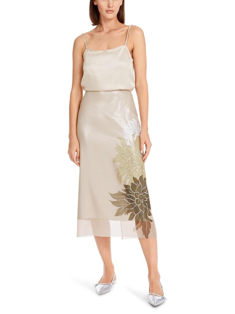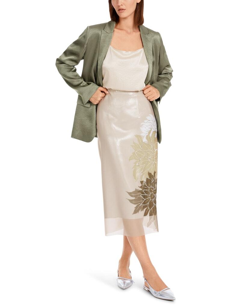 В сочетании цвета глубоководной жемчужины, пудрового шалфея и светло-бежевого. Изготовленная из блестящей ткани с размещенным цветочным узором, эта юбка является интересным объектом внимания. Силуэт в форме карандаша. С разрезом сзади эта юбка длиной до икры очень удобна в носке. Эта модель без пояса и застегивается сзади на молнию.