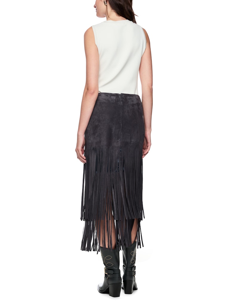 В графитовом цвете; с длинной бахромой в стиле ковбойской юбки. Прямой крой и внутренняя подкладка обеспечивают комфорт, а изящная застежка-молния сзади гарантирует элегантную посадку. Современная юбка в стиле вестерн – идеально подходит для стильных выходов. Изделие имеет знак экологичности «Rethink Together».
