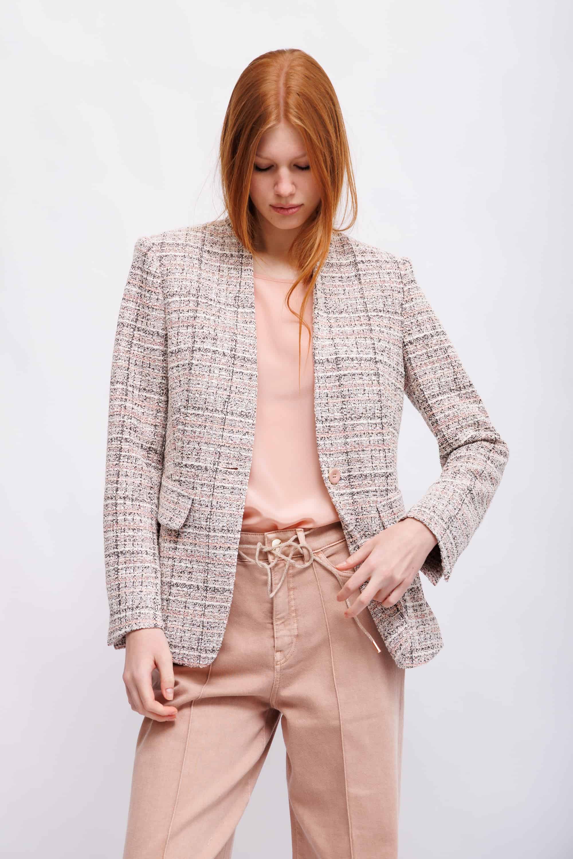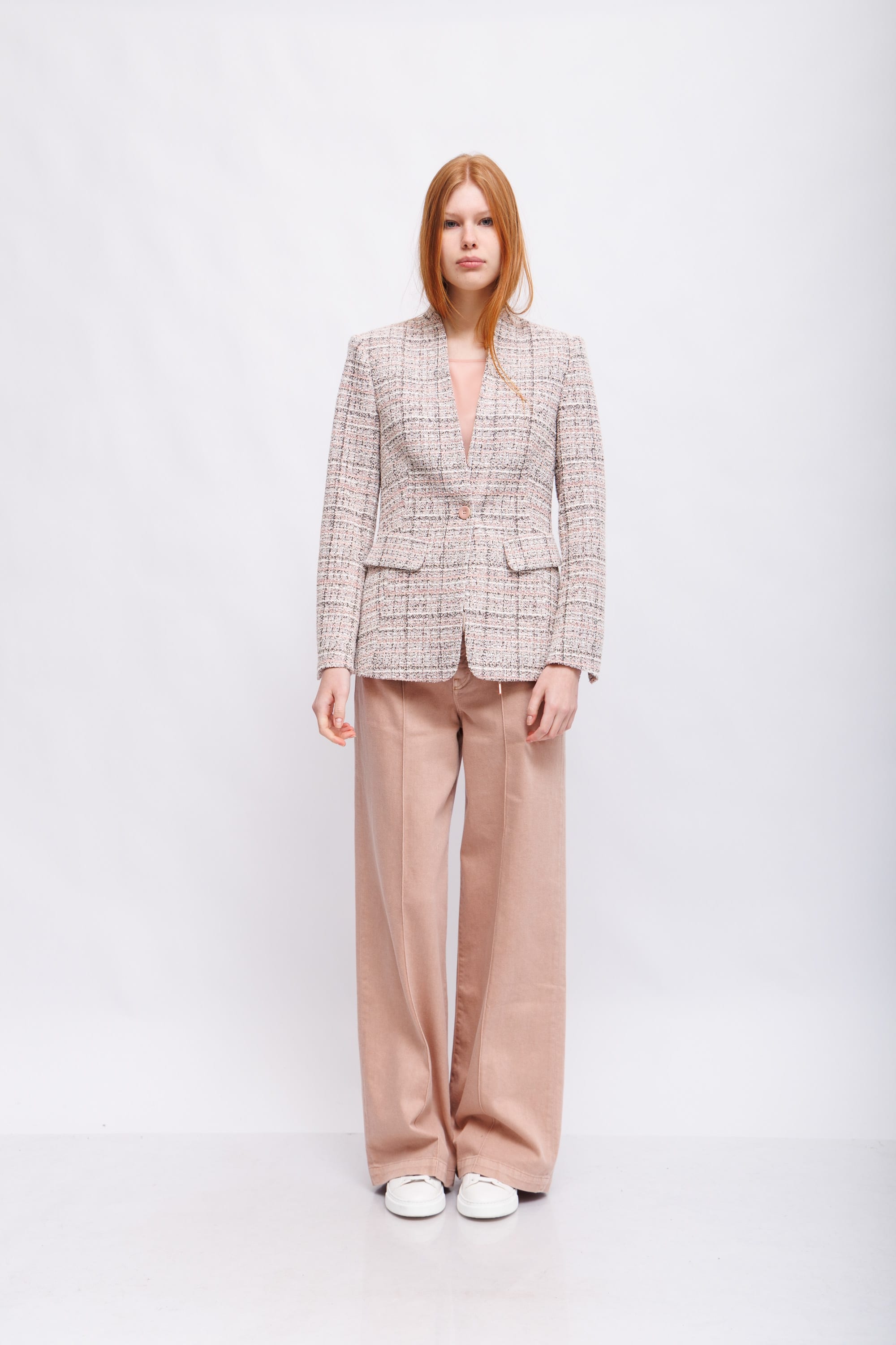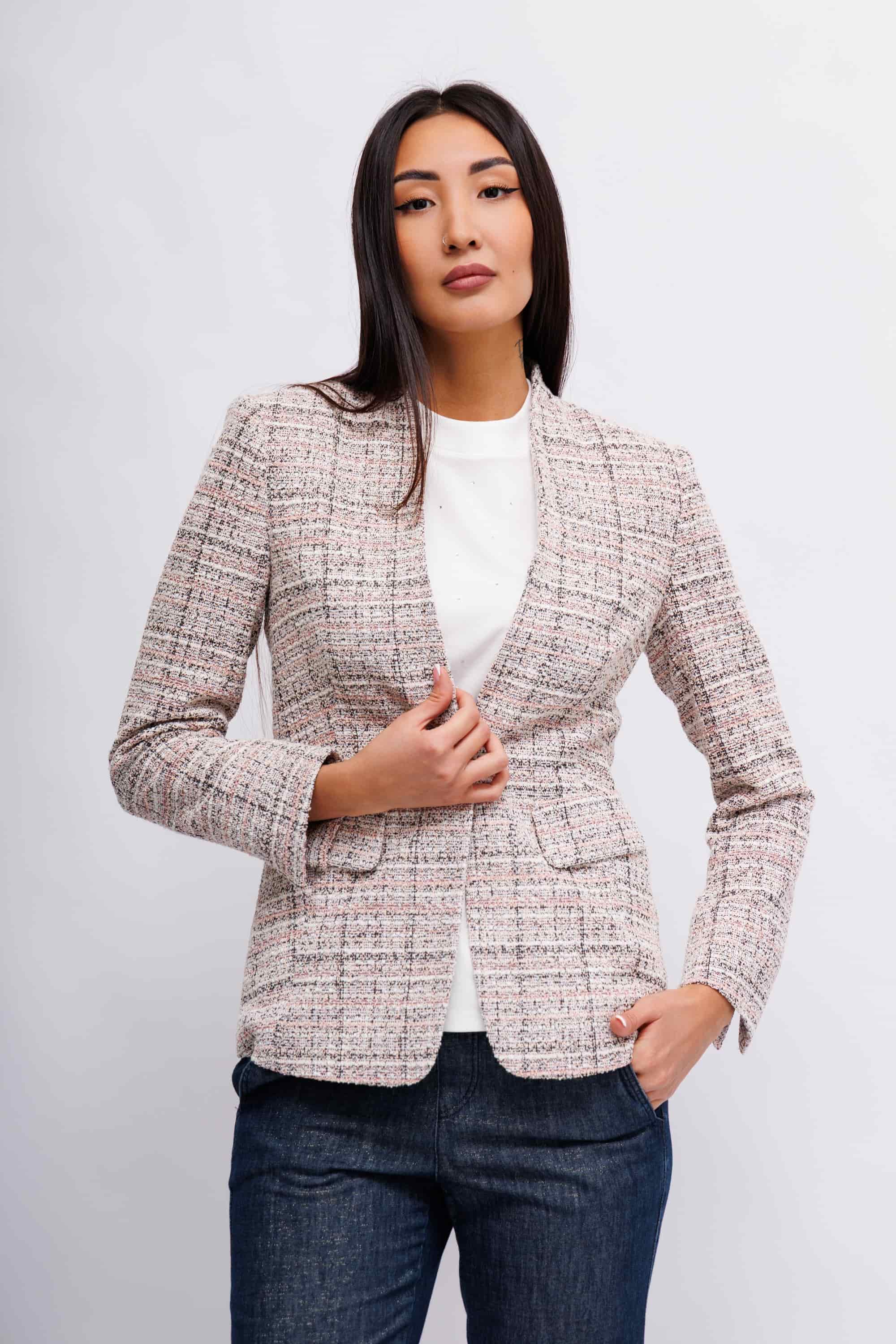 имеет более приталенный крой и небольшой воротник-стойку без лацканов. Застегивается на пуговицу. Изготовлен из высококачественной смесовой ткани с добавлением шерсти, мягкий на ощупь и подчеркивает женственный силуэт. Идеально сочетается с соответствующими брюками для создания завершенного, стильного образа.