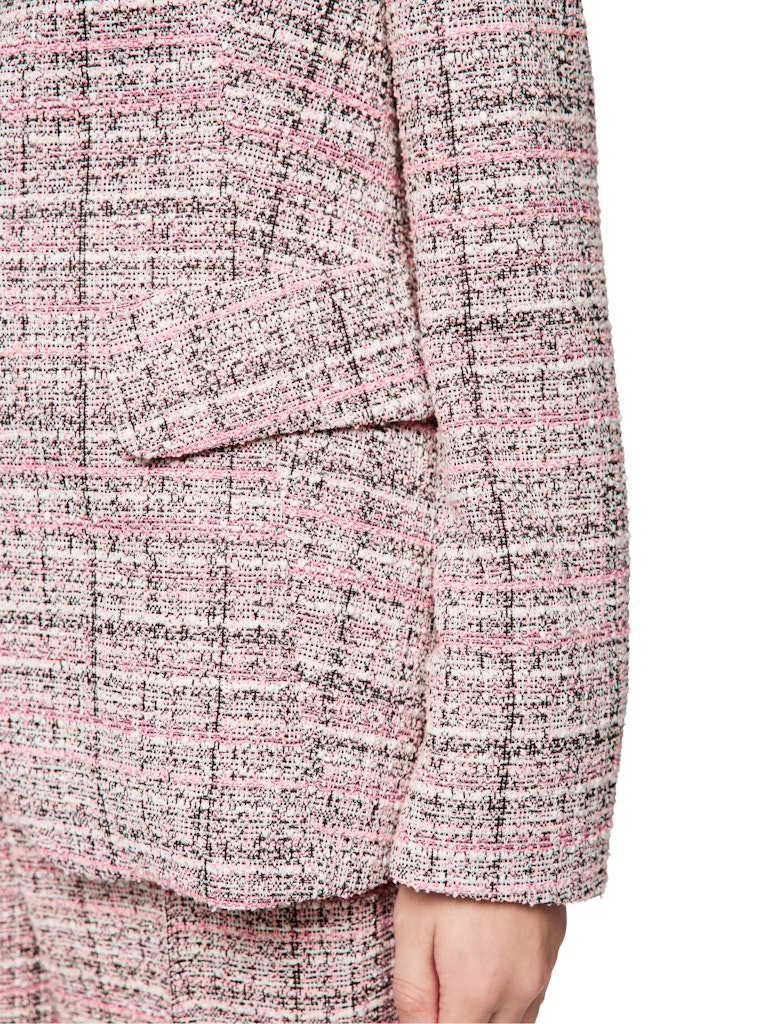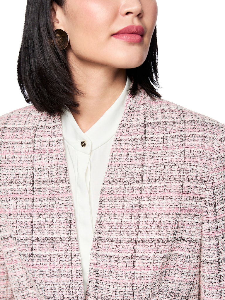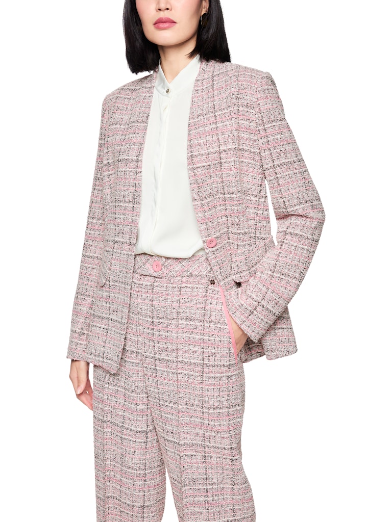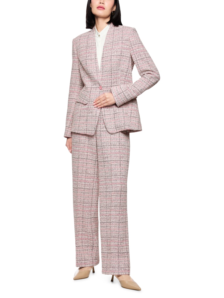 имеет более приталенный крой и небольшой воротник-стойку без лацканов. Застегивается на пуговицу. Изготовлен из высококачественной смесовой ткани с добавлением шерсти, мягкий на ощупь и подчеркивает женственный силуэт. Идеально сочетается с соответствующими брюками для создания завершенного, стильного образа.