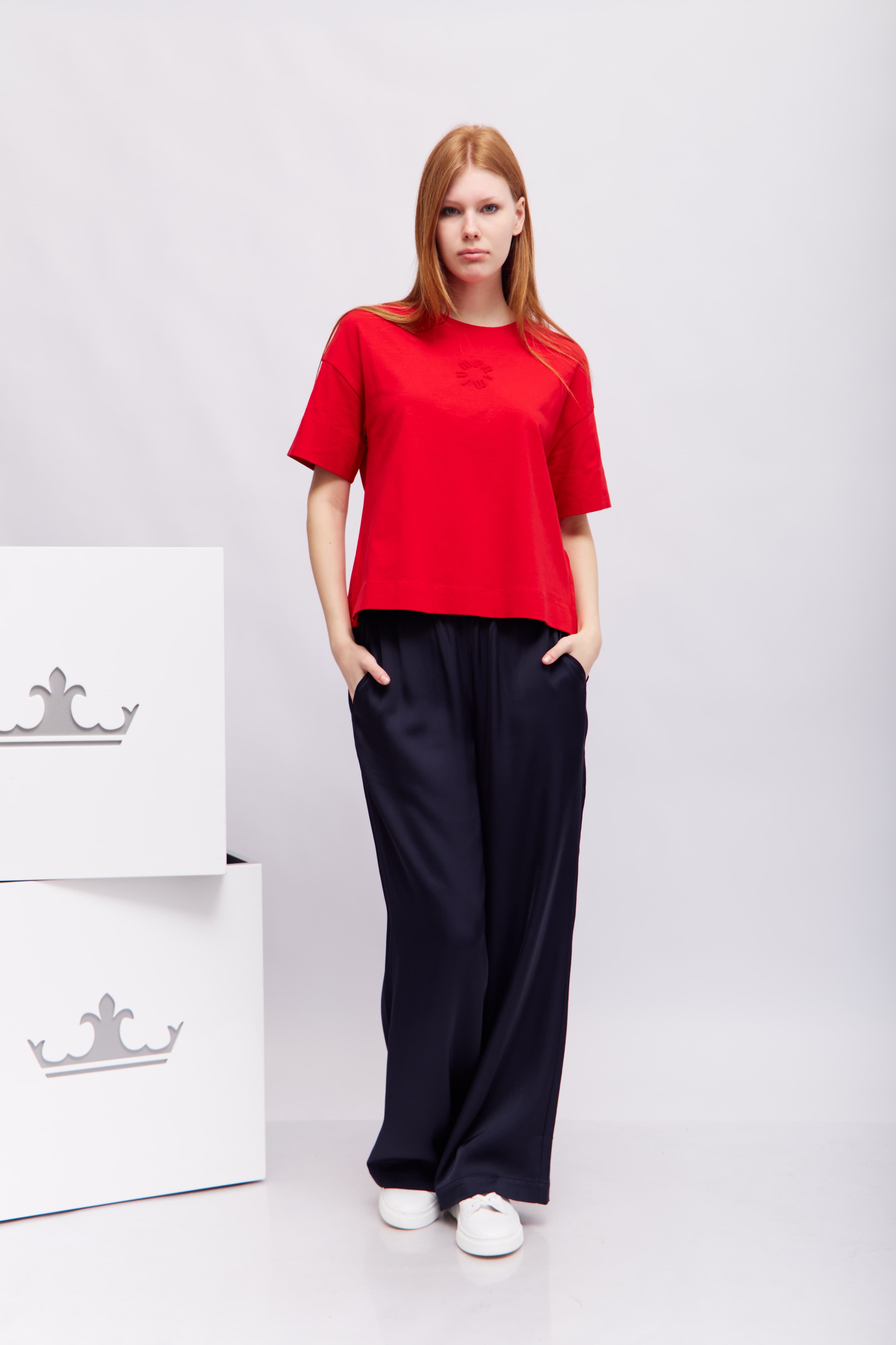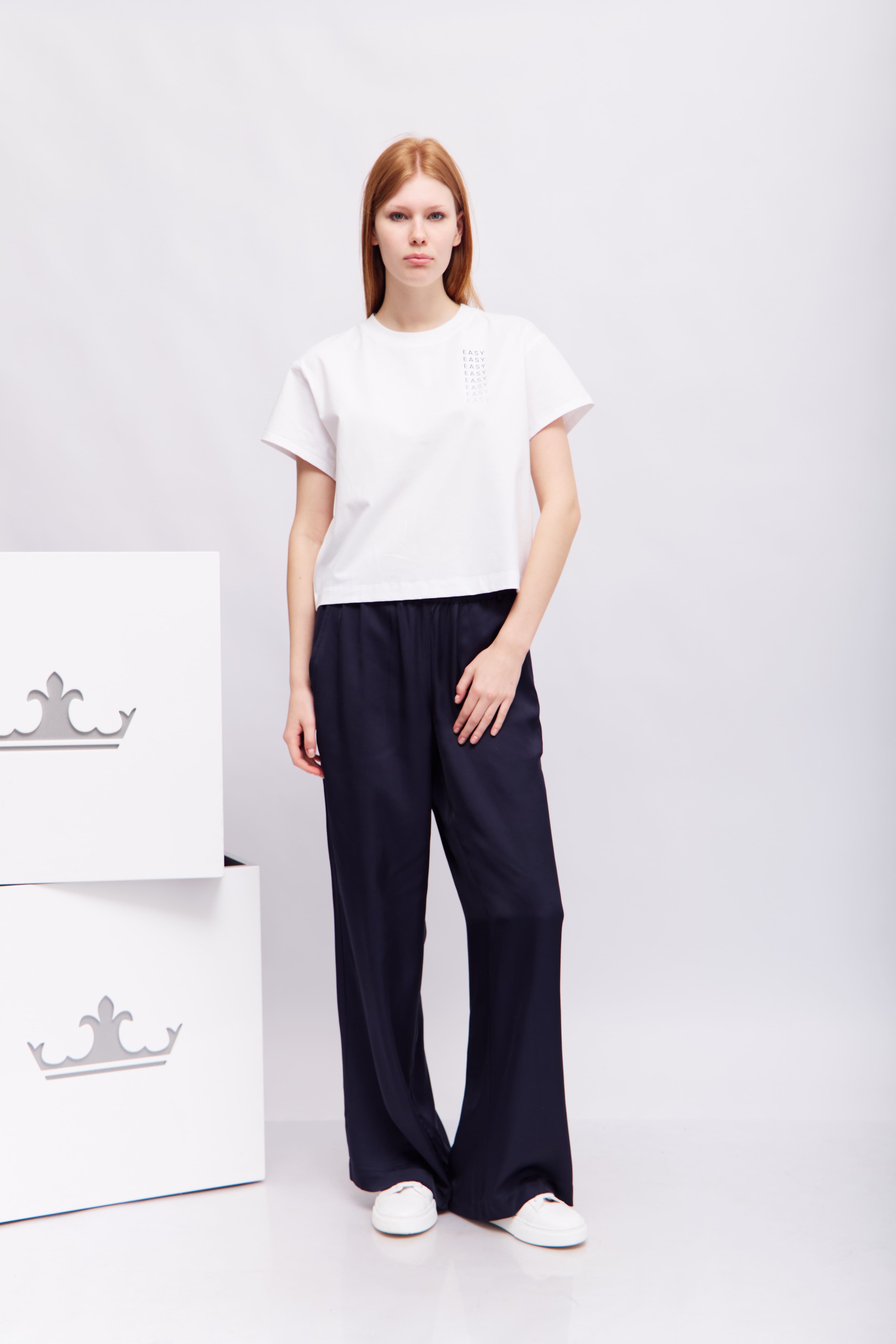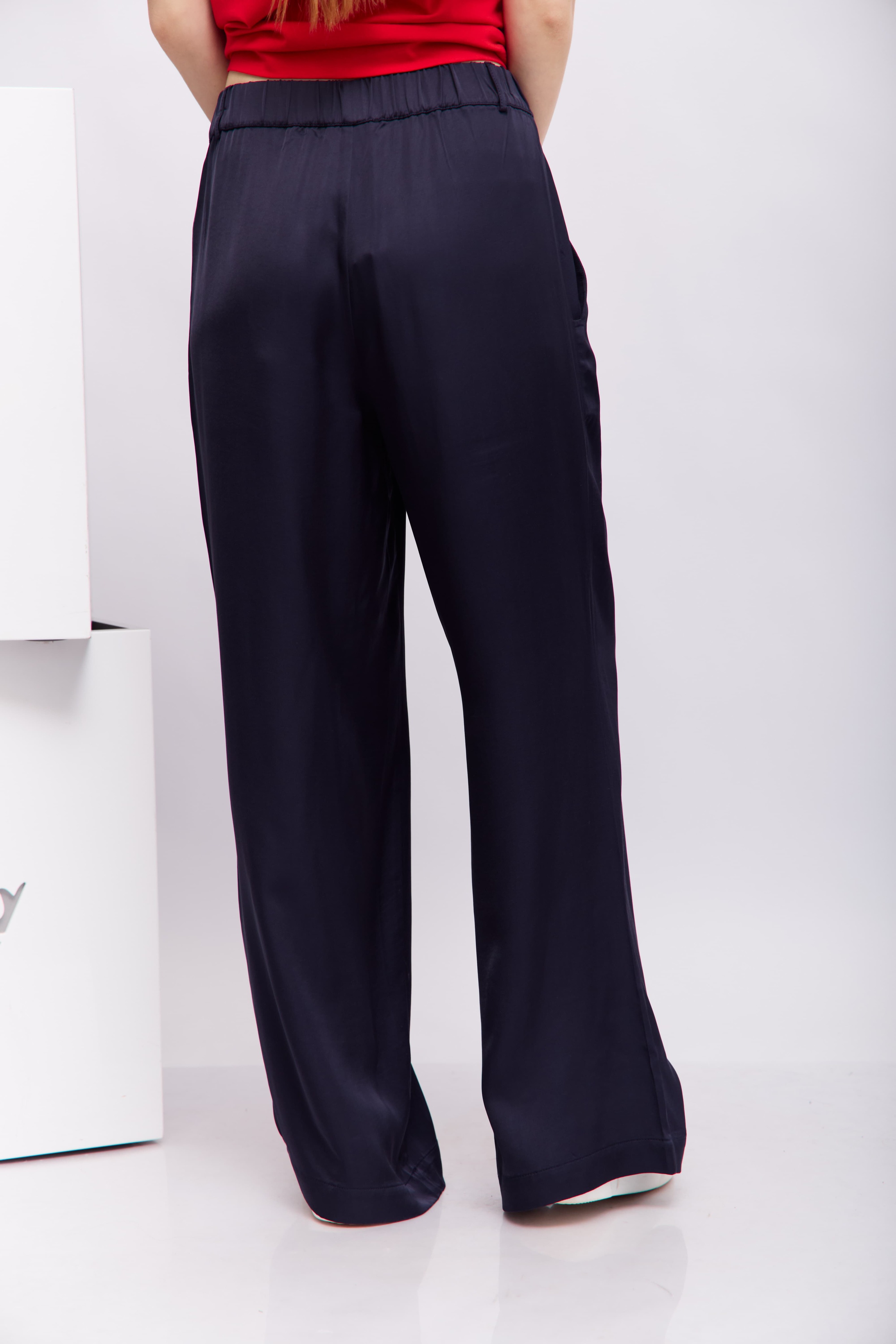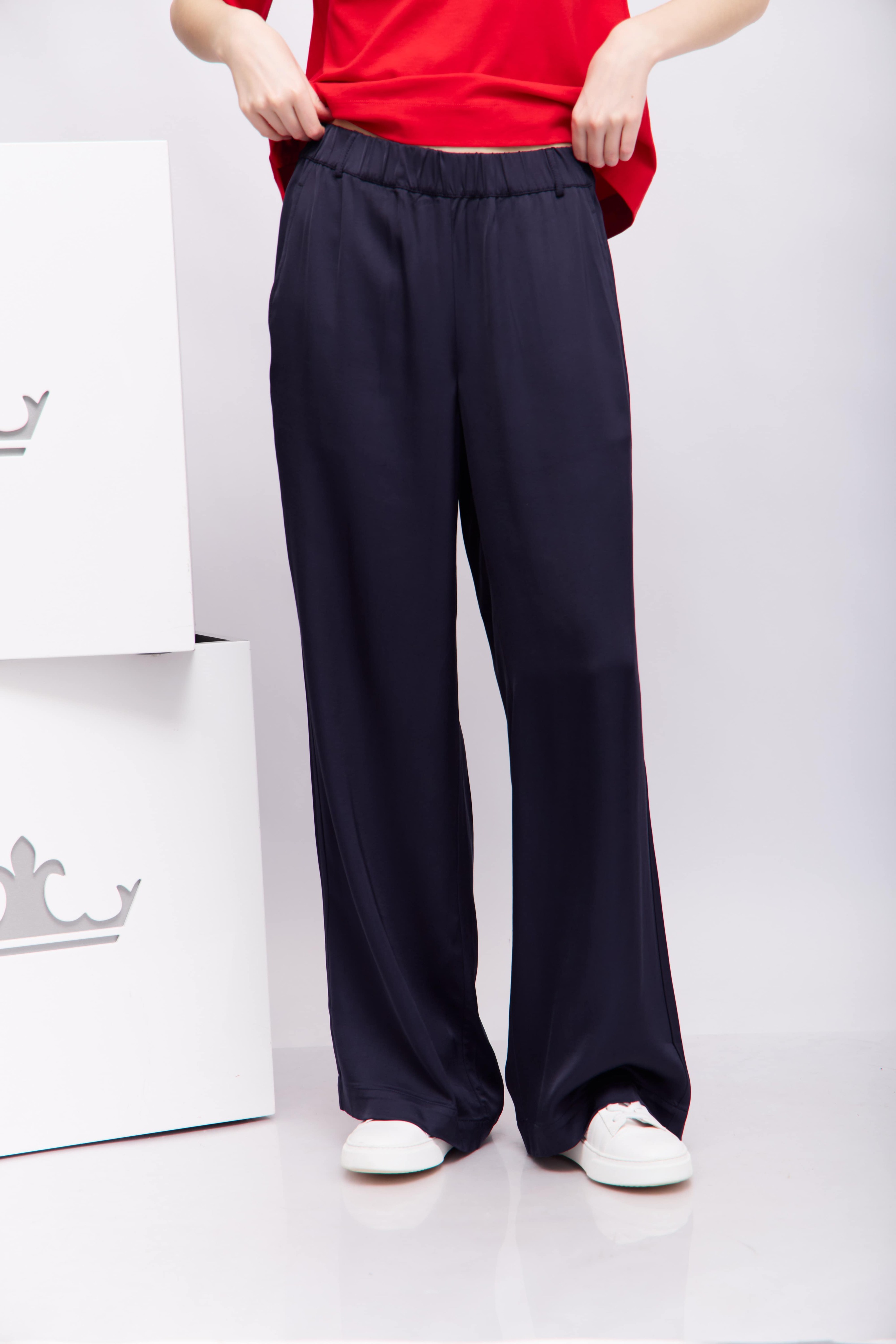 Брюки синие струящиесяЭластичный пояс Косые боковые карманыШирокий крой