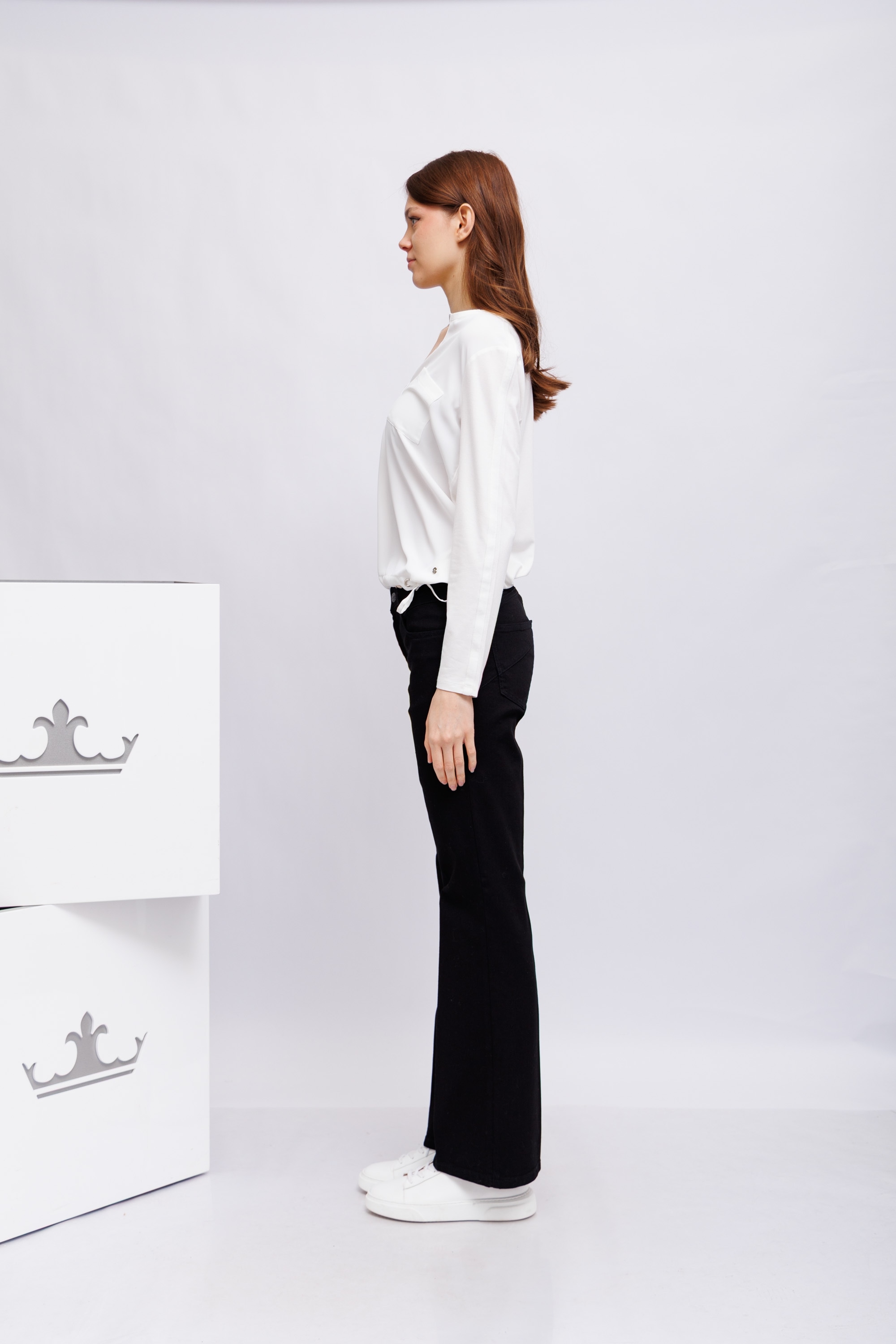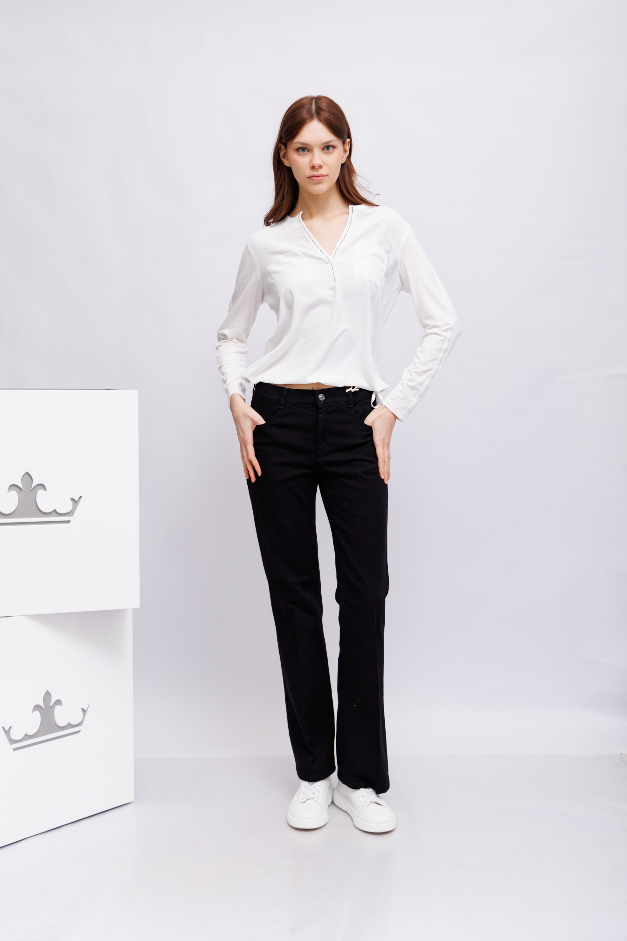 сочетает в себе изысканный атласный вид спереди и комфортную эластичность. Круглый вырез горловины с разрезом и сверкающими стразами добавляет элегантности классическому крою. Накладные нагрудные карманы, полоска вдоль рукавов и кулиска по подолу добавляют стильные акценты – идеально для женственных образов с изюминкой