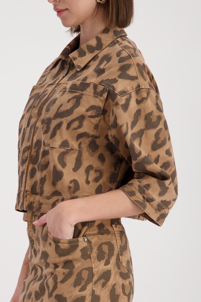 Эта стильная укороченная куртка из высококачественного хлопка с леопардовым принтом и рукавами ¾ сочетает в себе прочный материал и элегантные детали.
