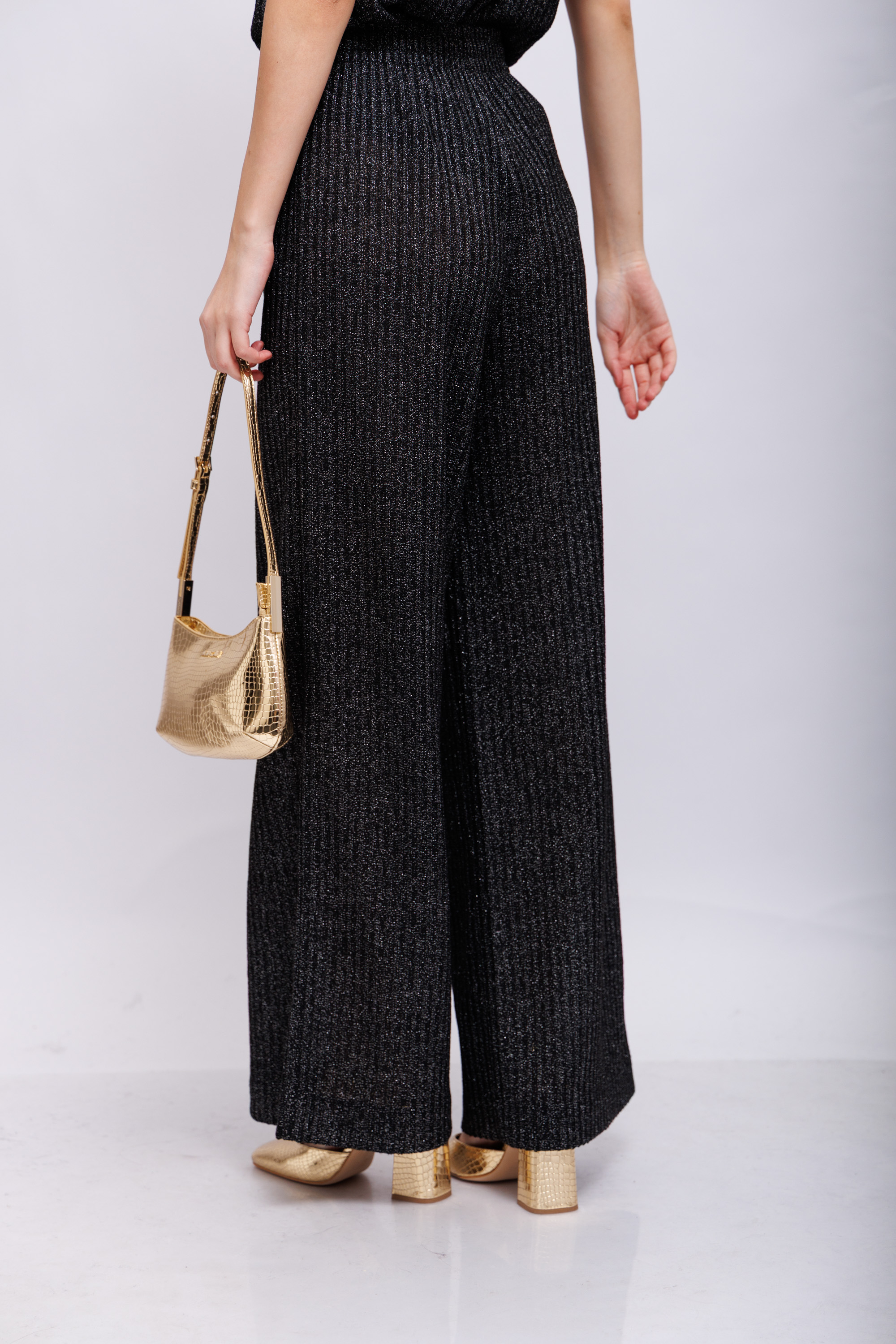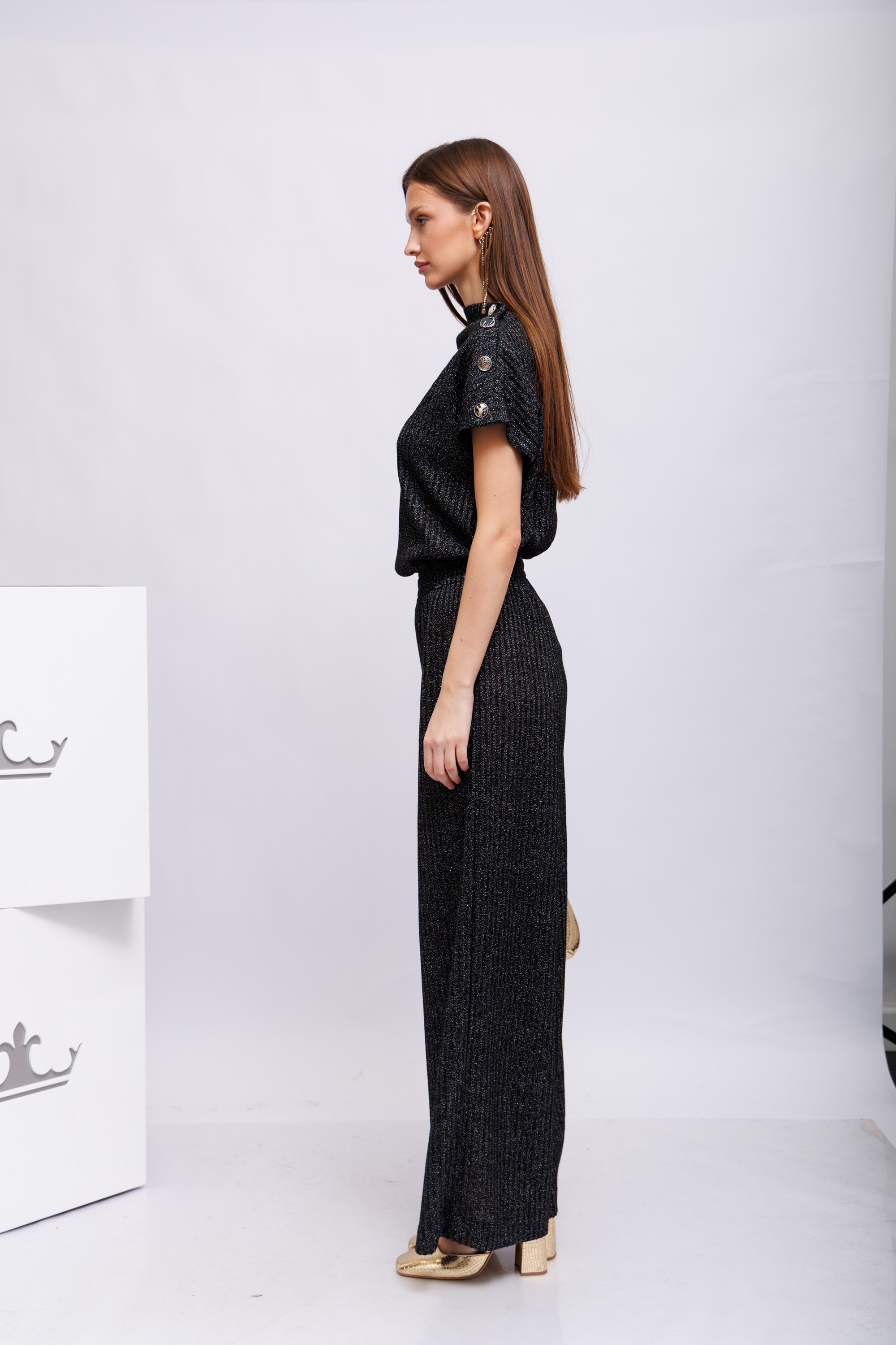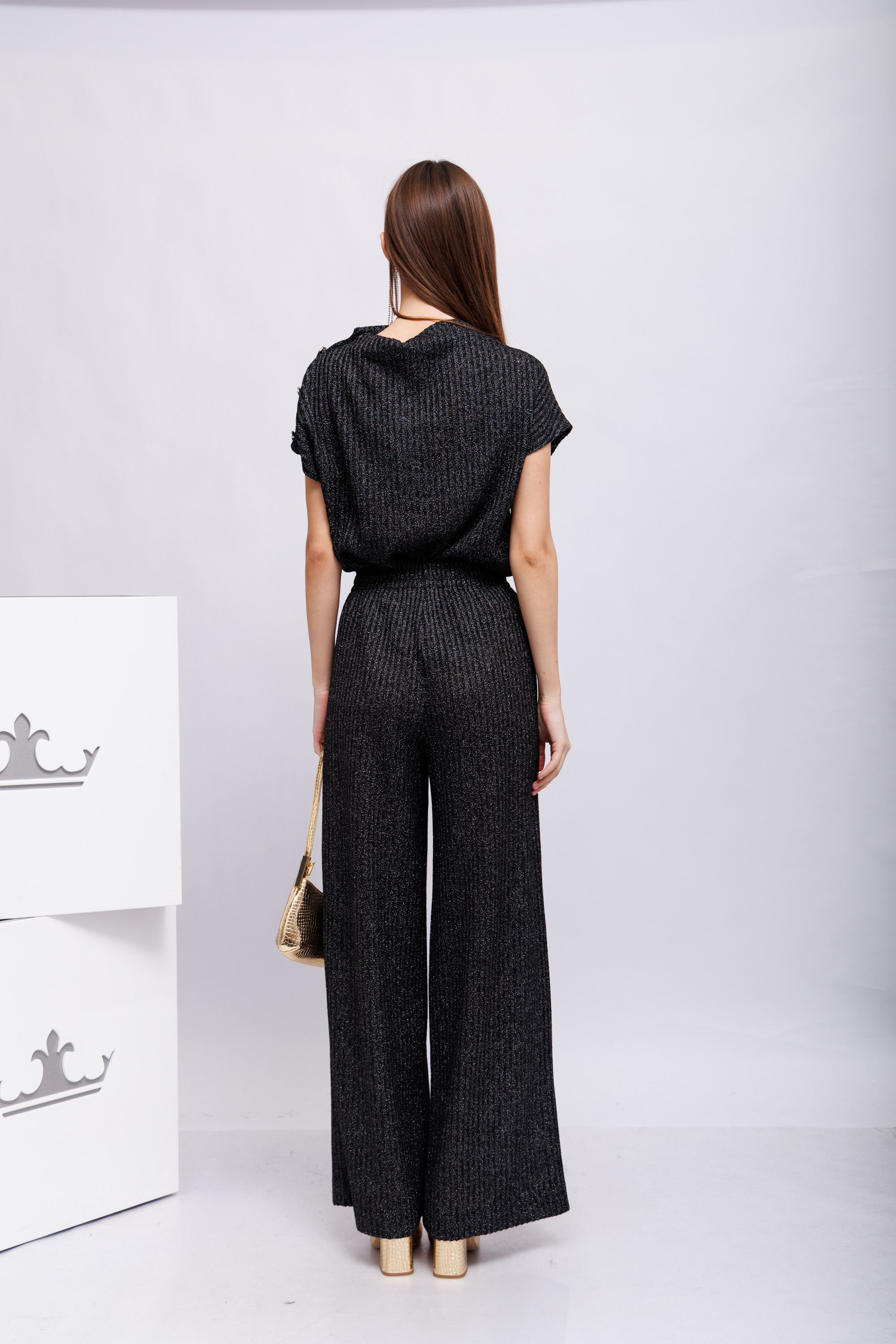Элегантный трикотажный костюм вертикальной вязки("лапша") антрацитового цвета с люрексом