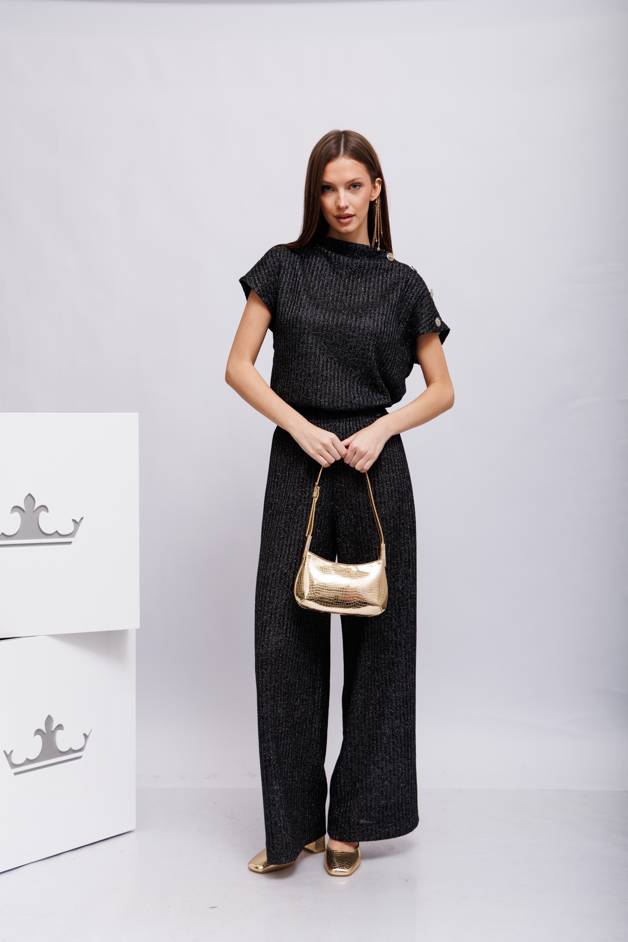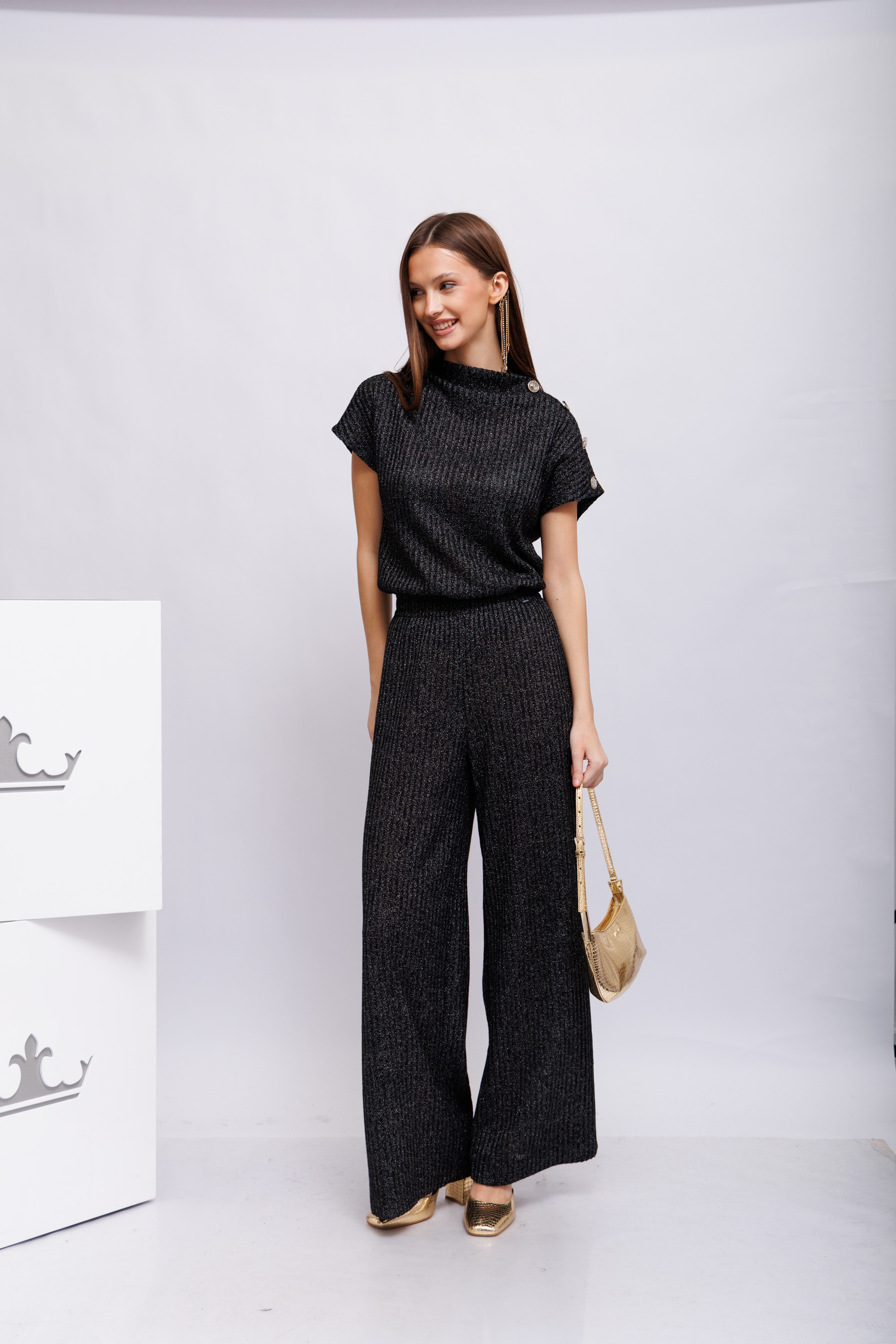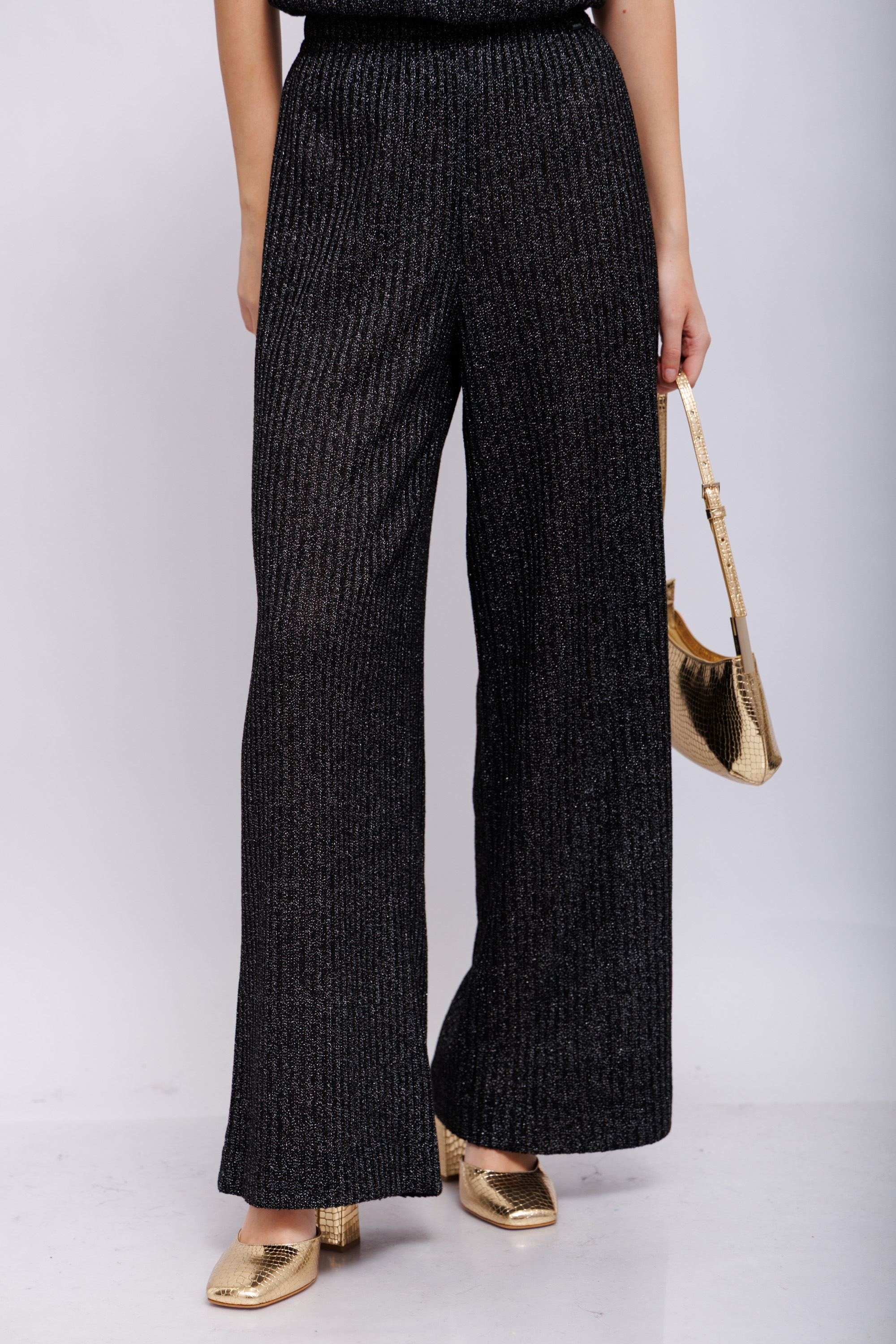 Элегантный трикотажный костюм вертикальной вязки("лапша") антрацитового цвета с люрексом