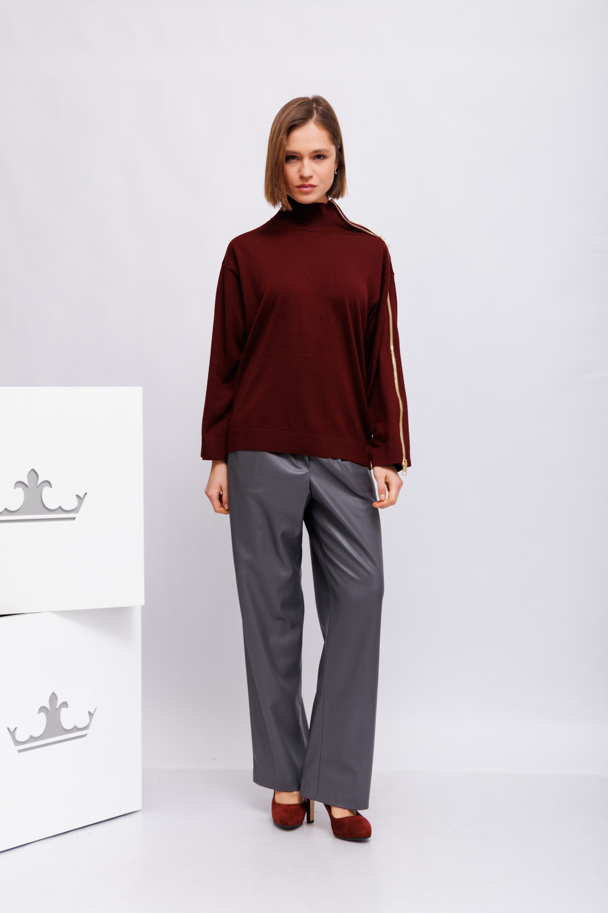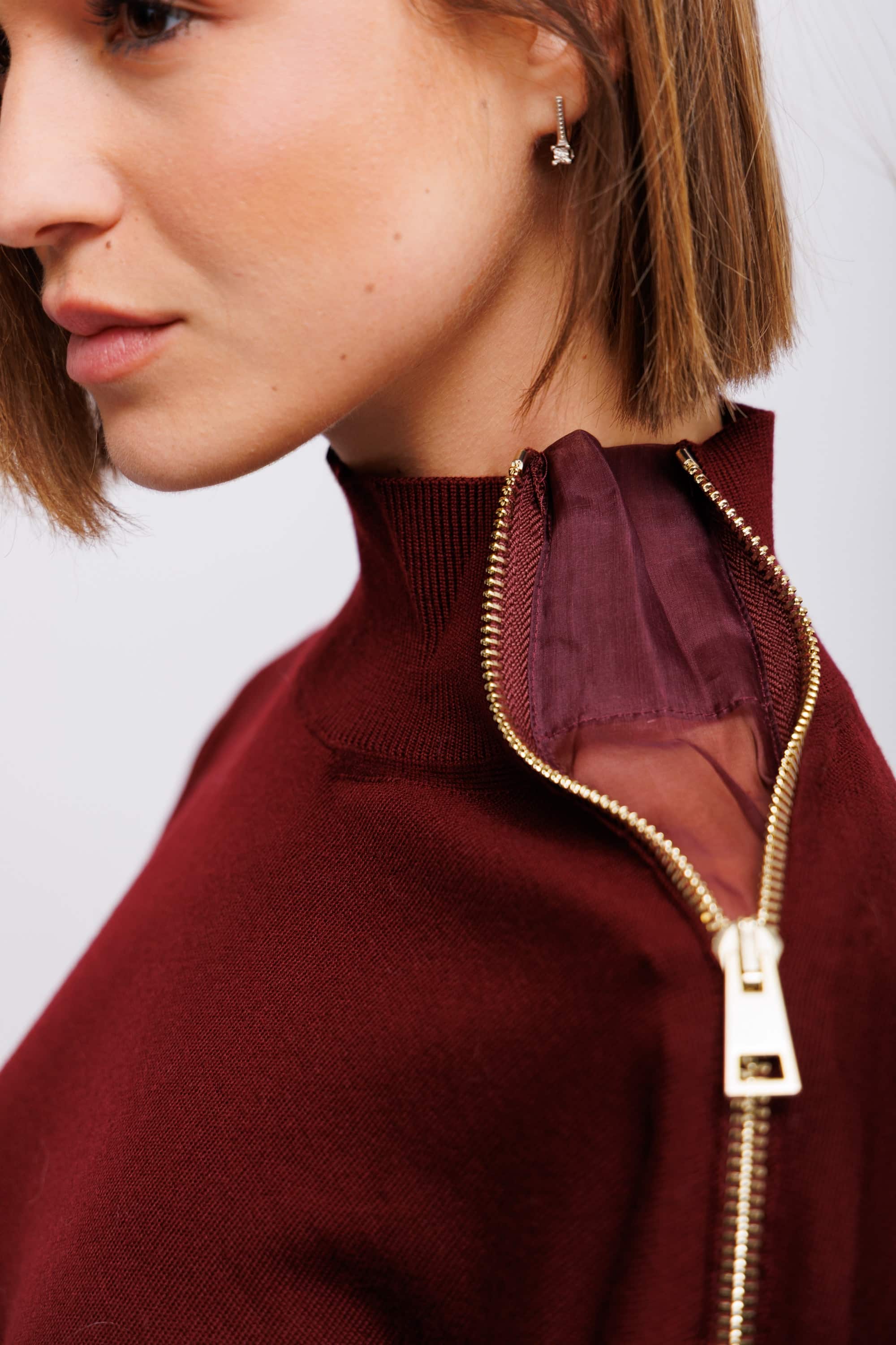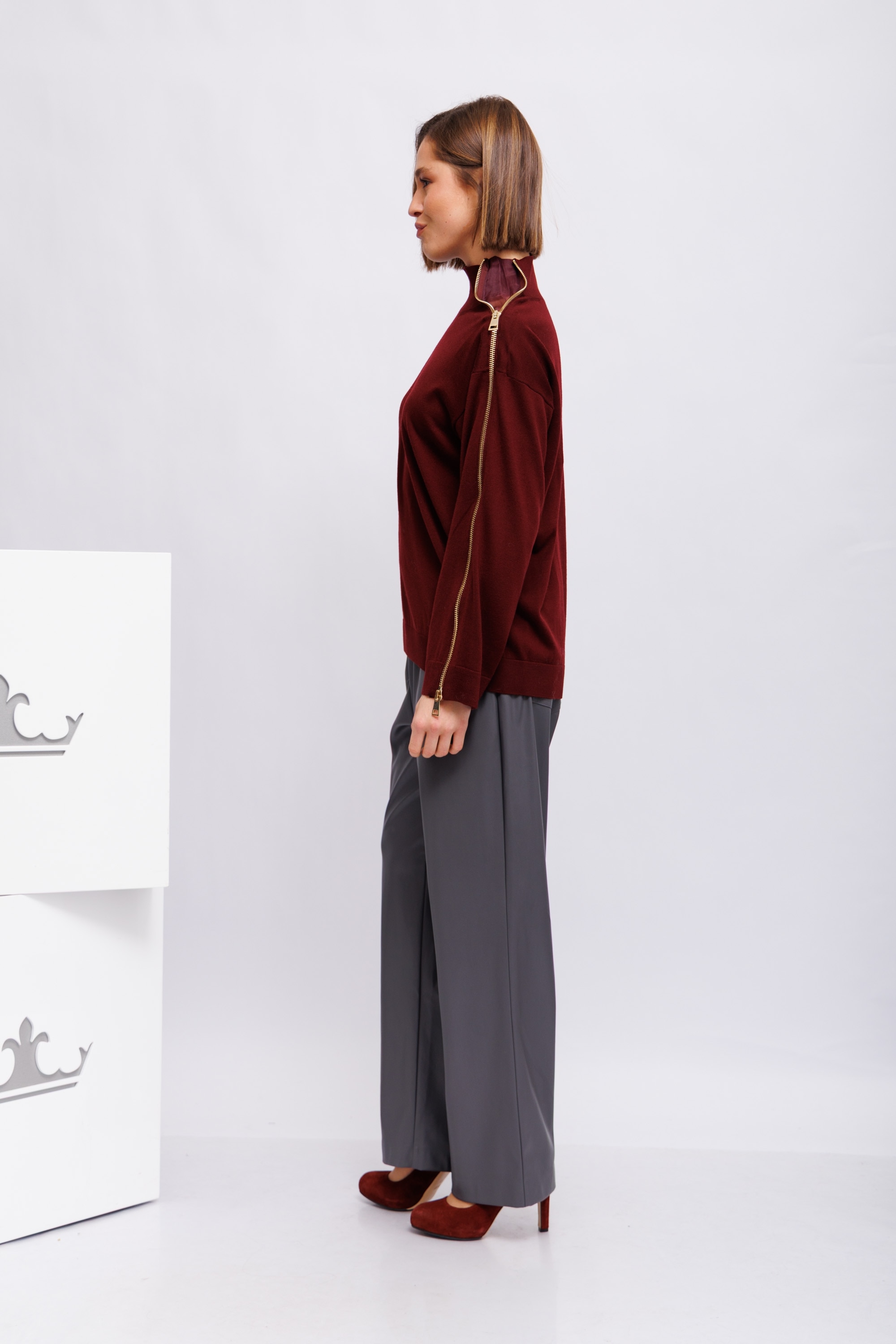 Свитер цвета бургундиВорот-стойкаДлинные рукава с молниями, скрывающими полупрозрачные шёлковые вставкиКрой удлинённый свободныйМанжеты и низ изделия-эластичный ребристый трикотаж