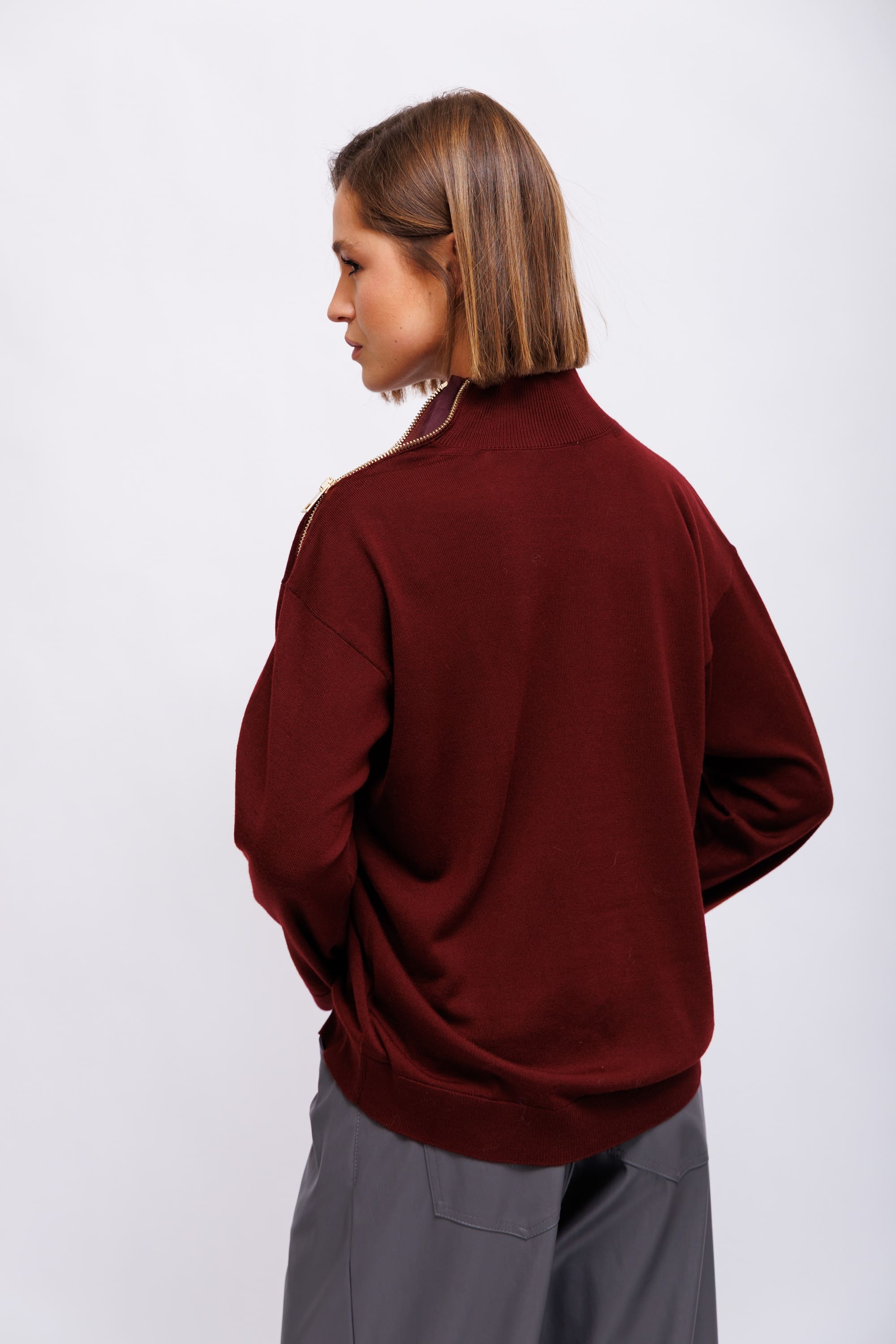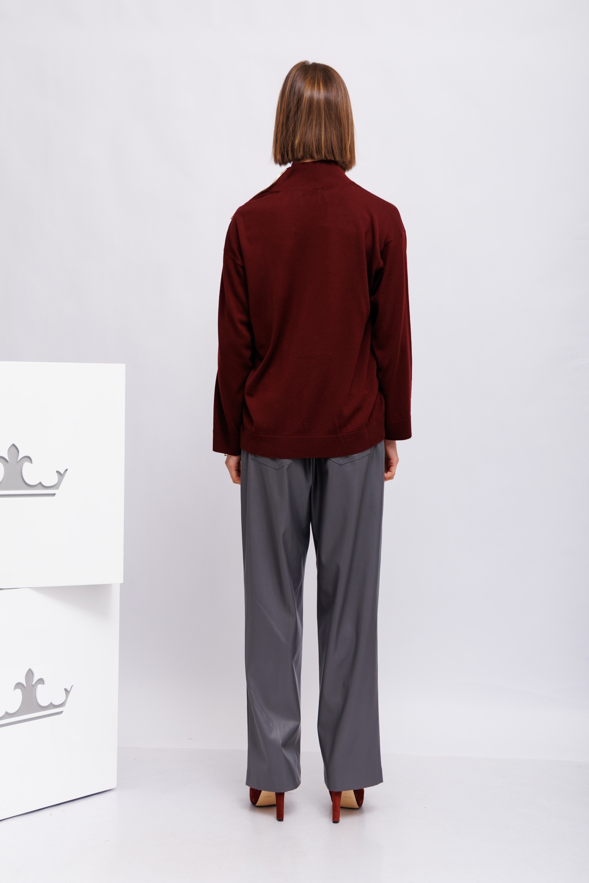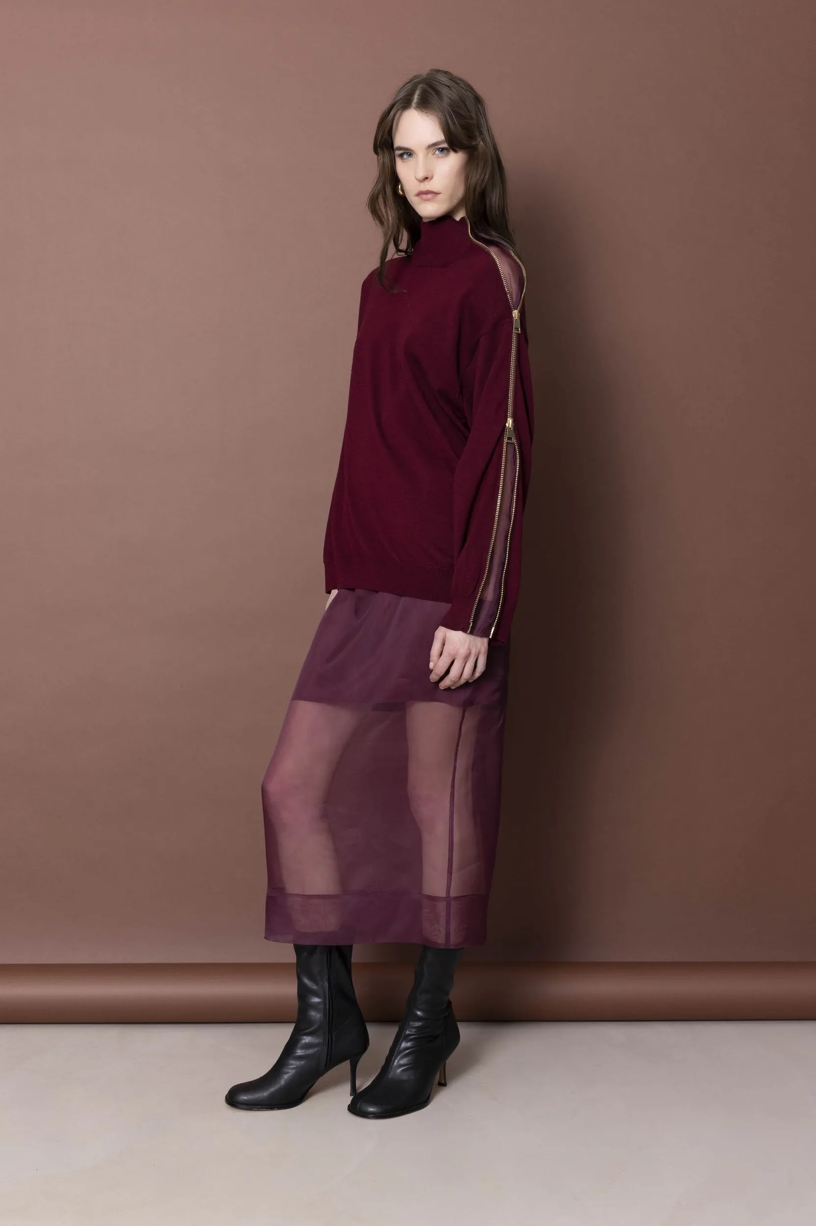 Свитер цвета бургундиВорот-стойкаДлинные рукава с молниями, скрывающими полупрозрачные шёлковые вставкиКрой удлинённый свободныйМанжеты и низ изделия-эластичный ребристый трикотаж