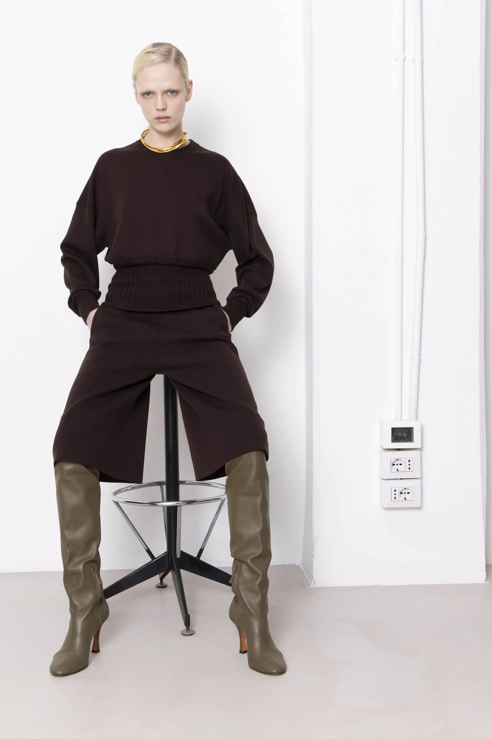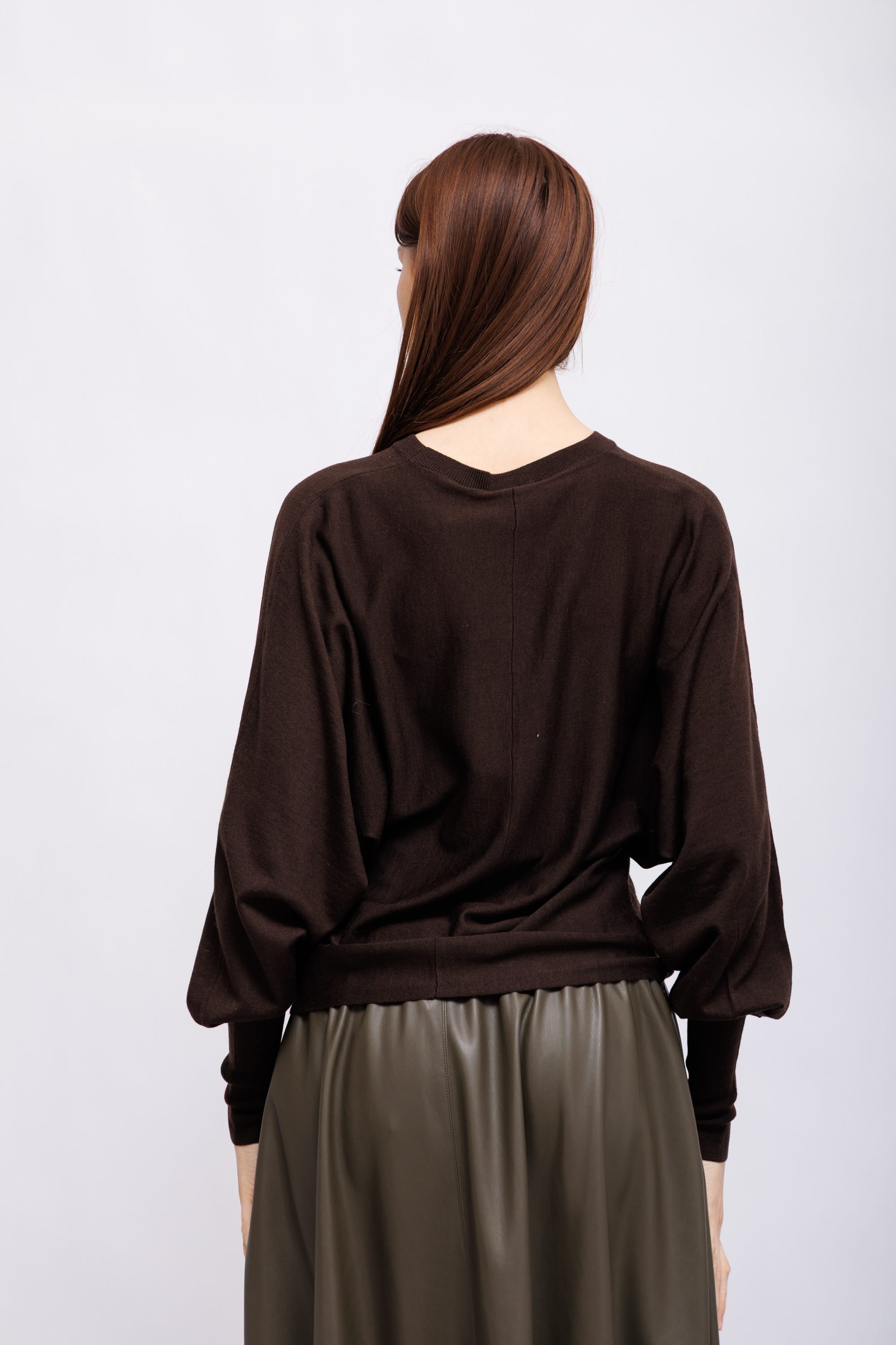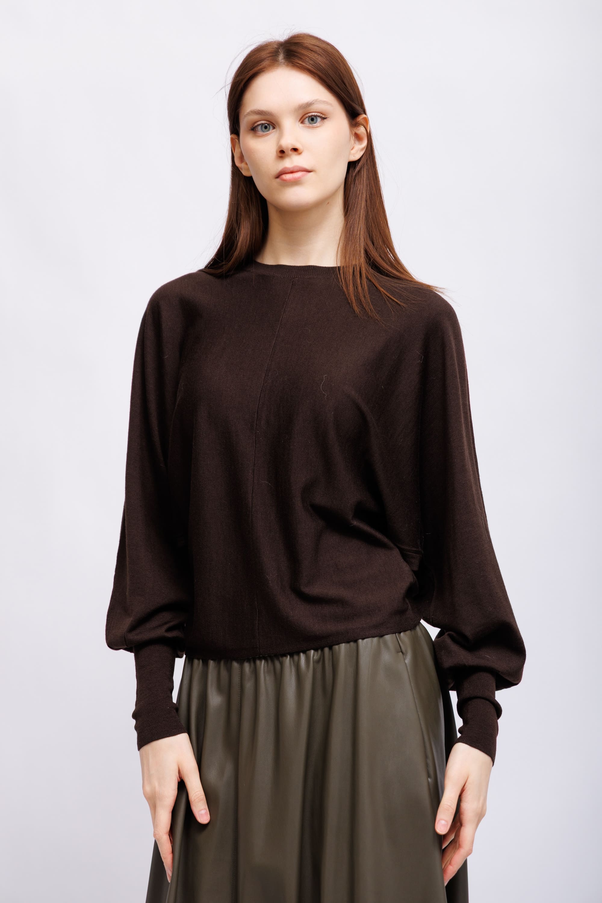 Джемпер шоколадного цвета из тонкой шерстиКруглый вырезДлинные рукава с напуском благодаря высоким манжетам
