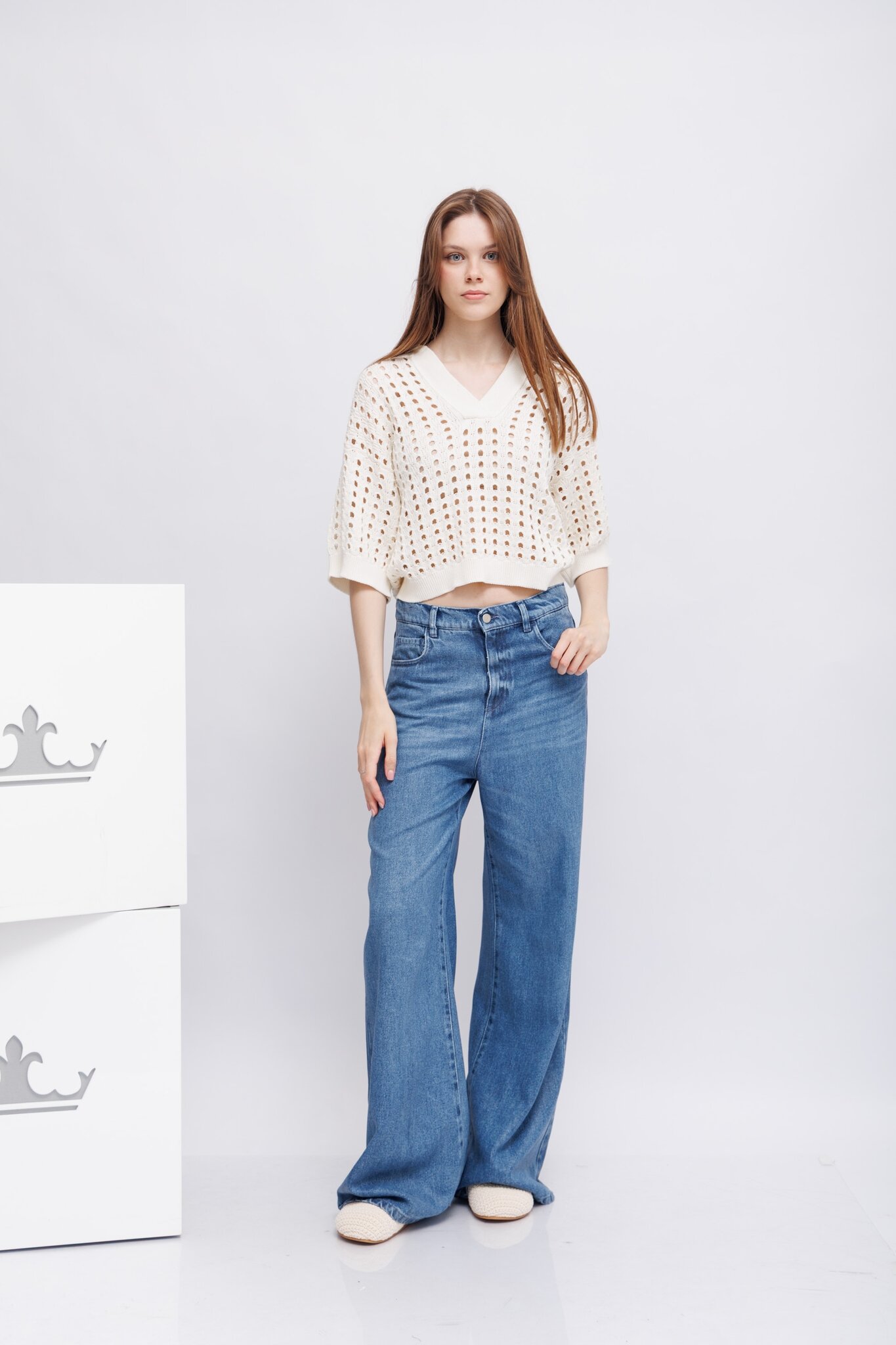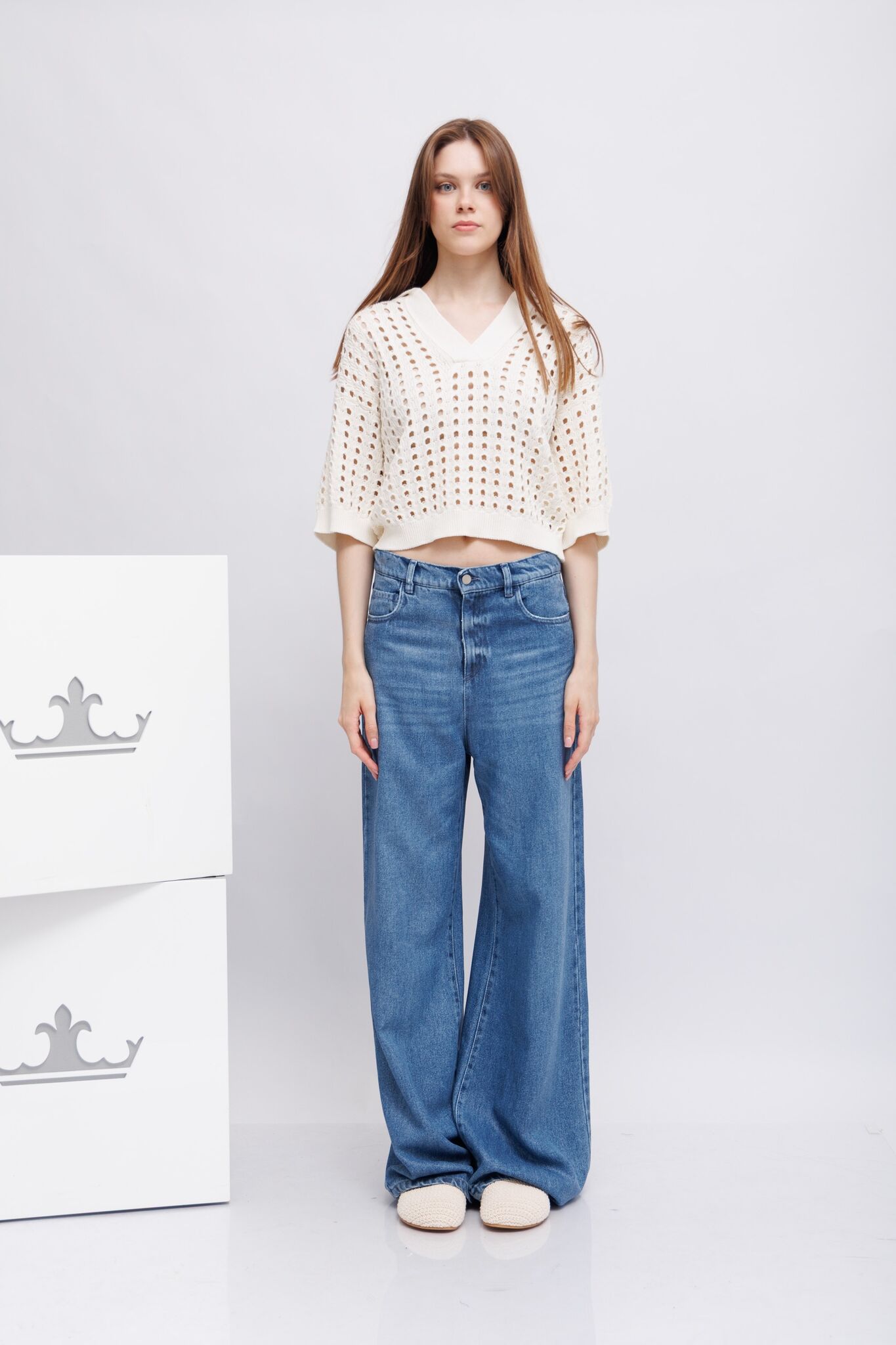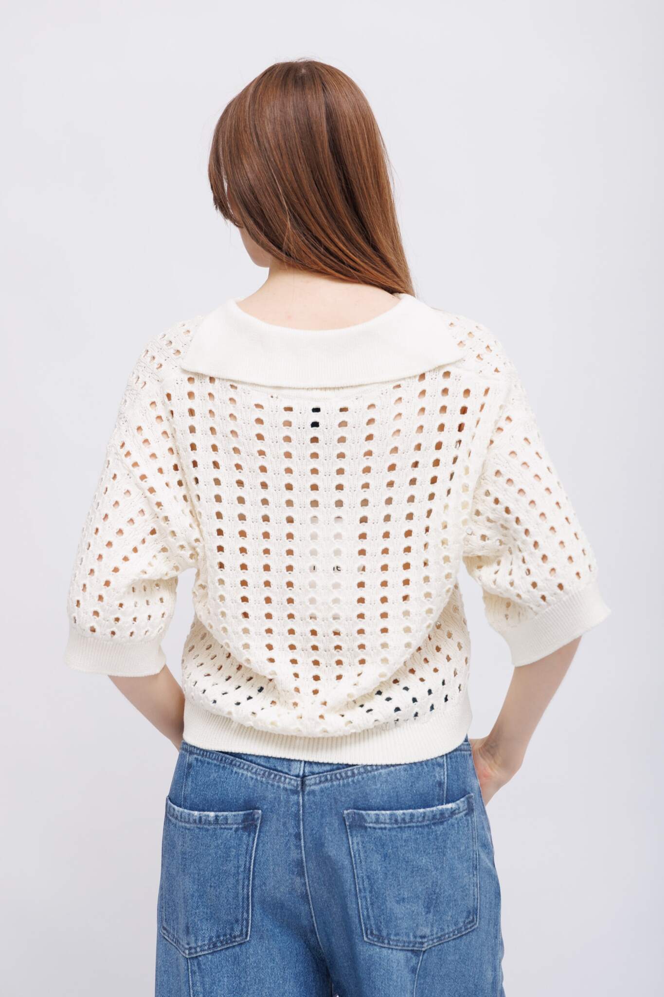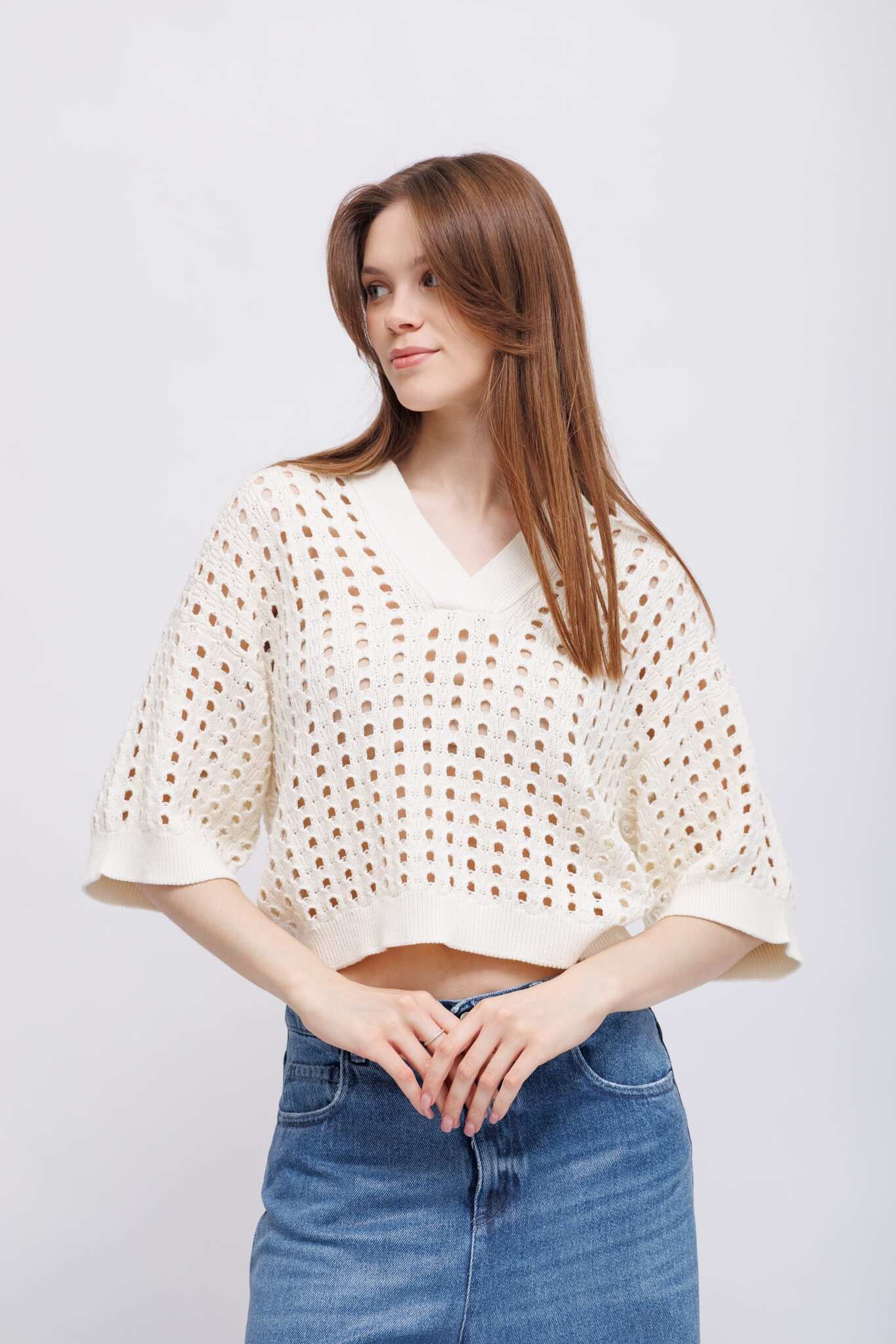 Поло молочного цветаАжурная вязкаСлегка укороченный кройВорот отложной без застежекМанжеты рукавов и низ изделия -трикотажная резинка