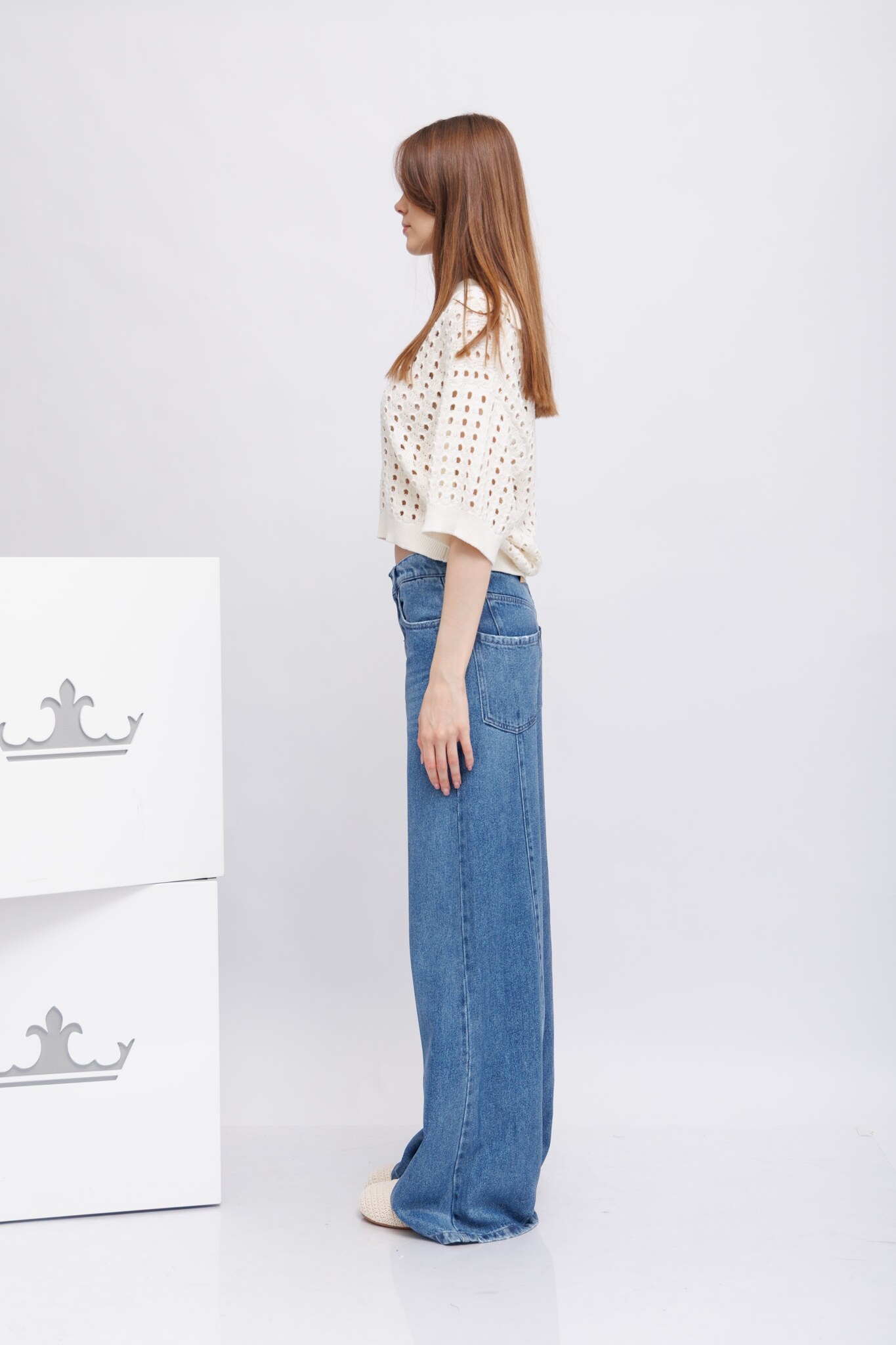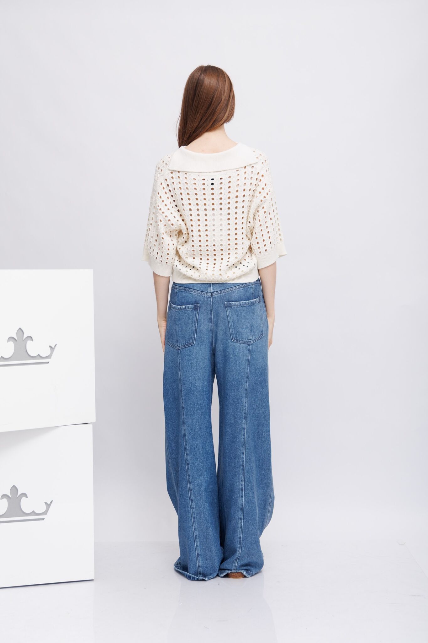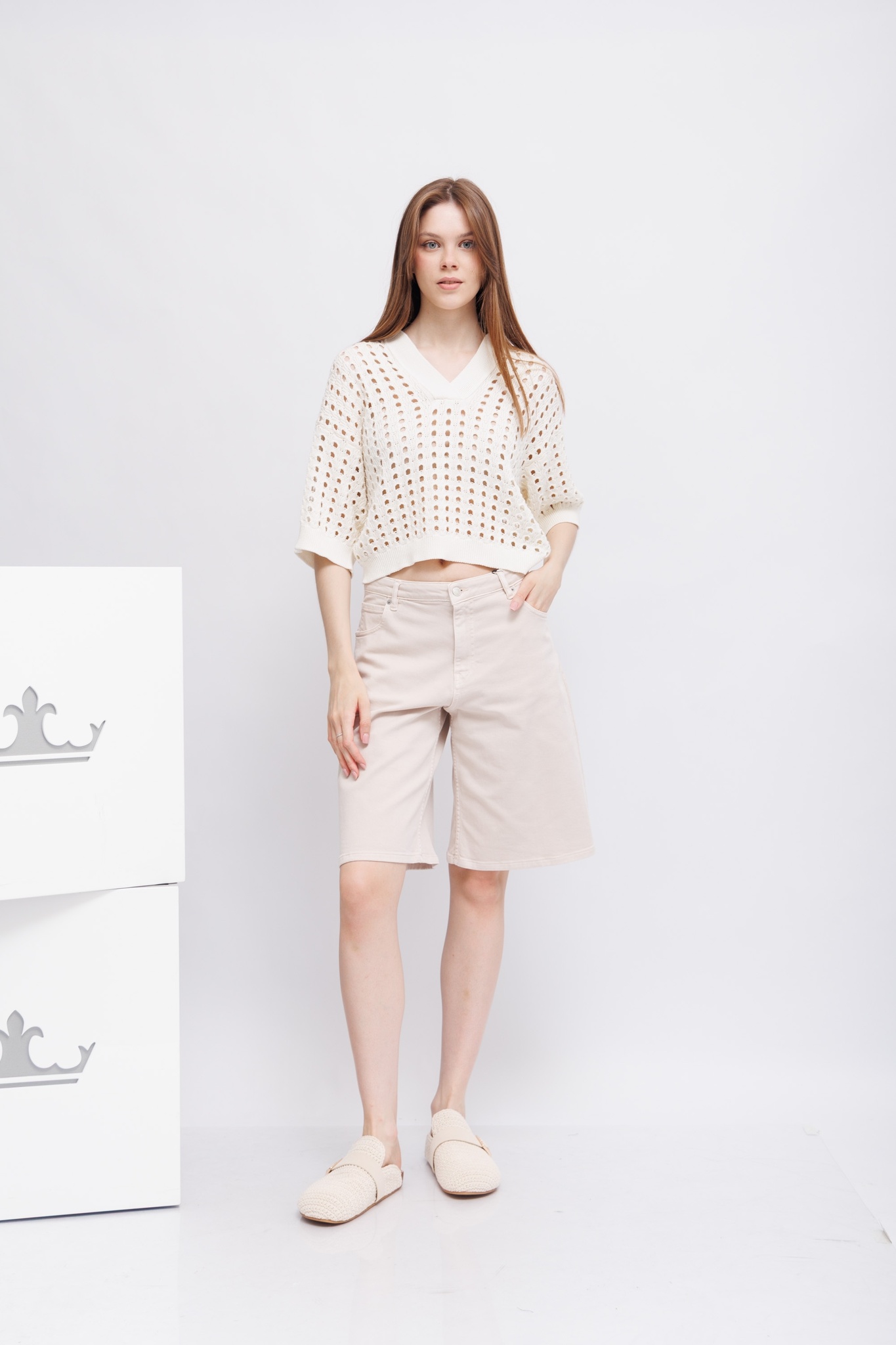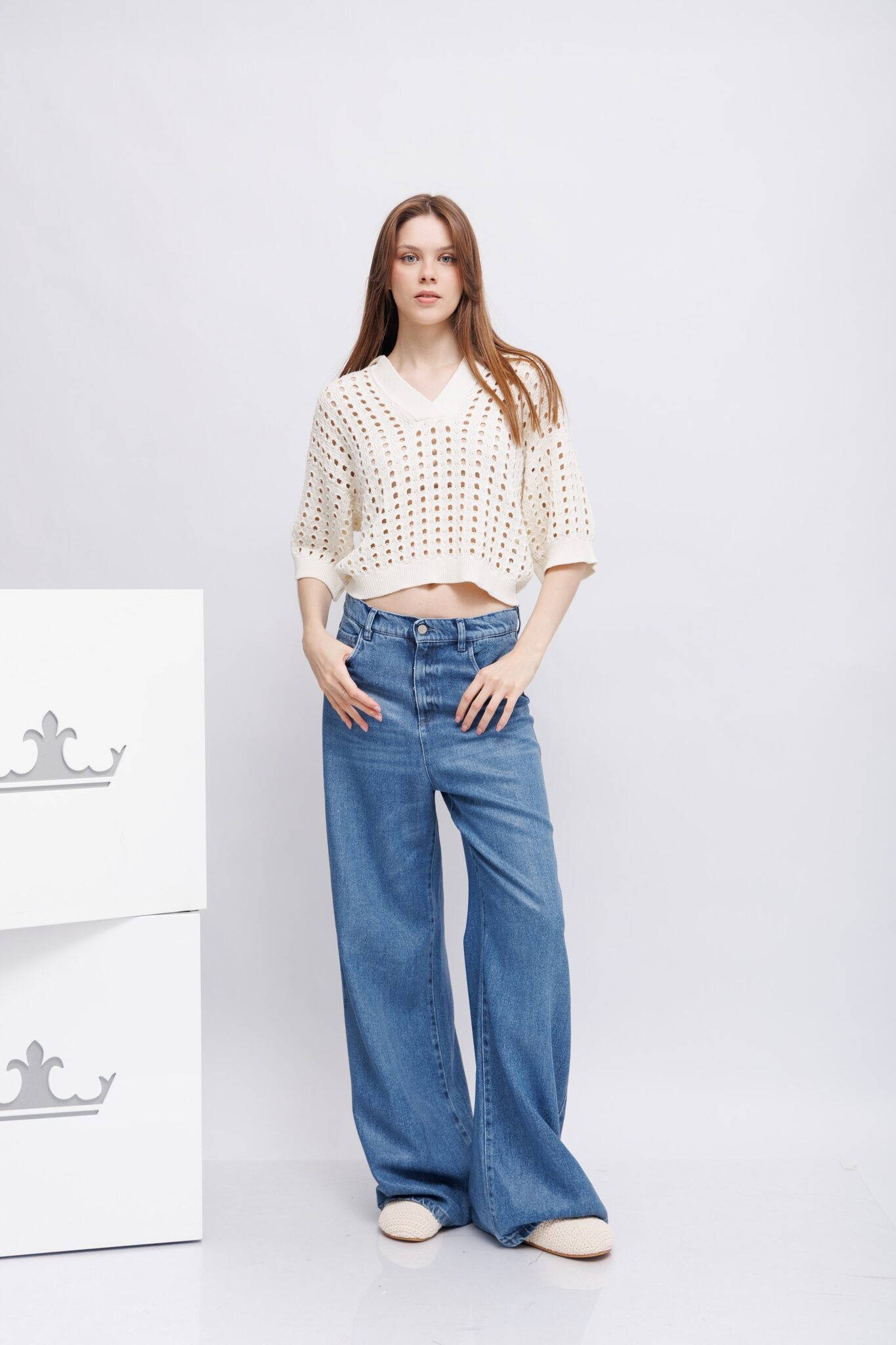 Поло молочного цветаАжурная вязкаСлегка укороченный кройВорот отложной без застежекМанжеты рукавов и низ изделия -трикотажная резинка