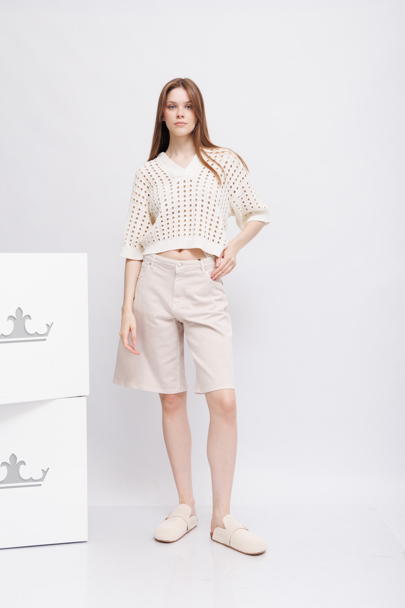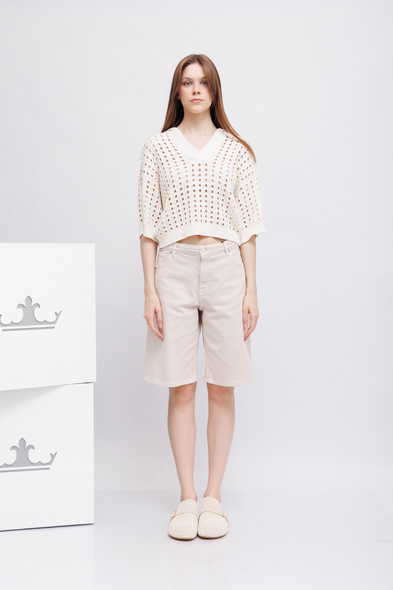 Джинсовые шортыБежевый цветМодель "Пять карманов"Сзади - лейбл с логотипом и кокеткаДлина до коленСвободный крой