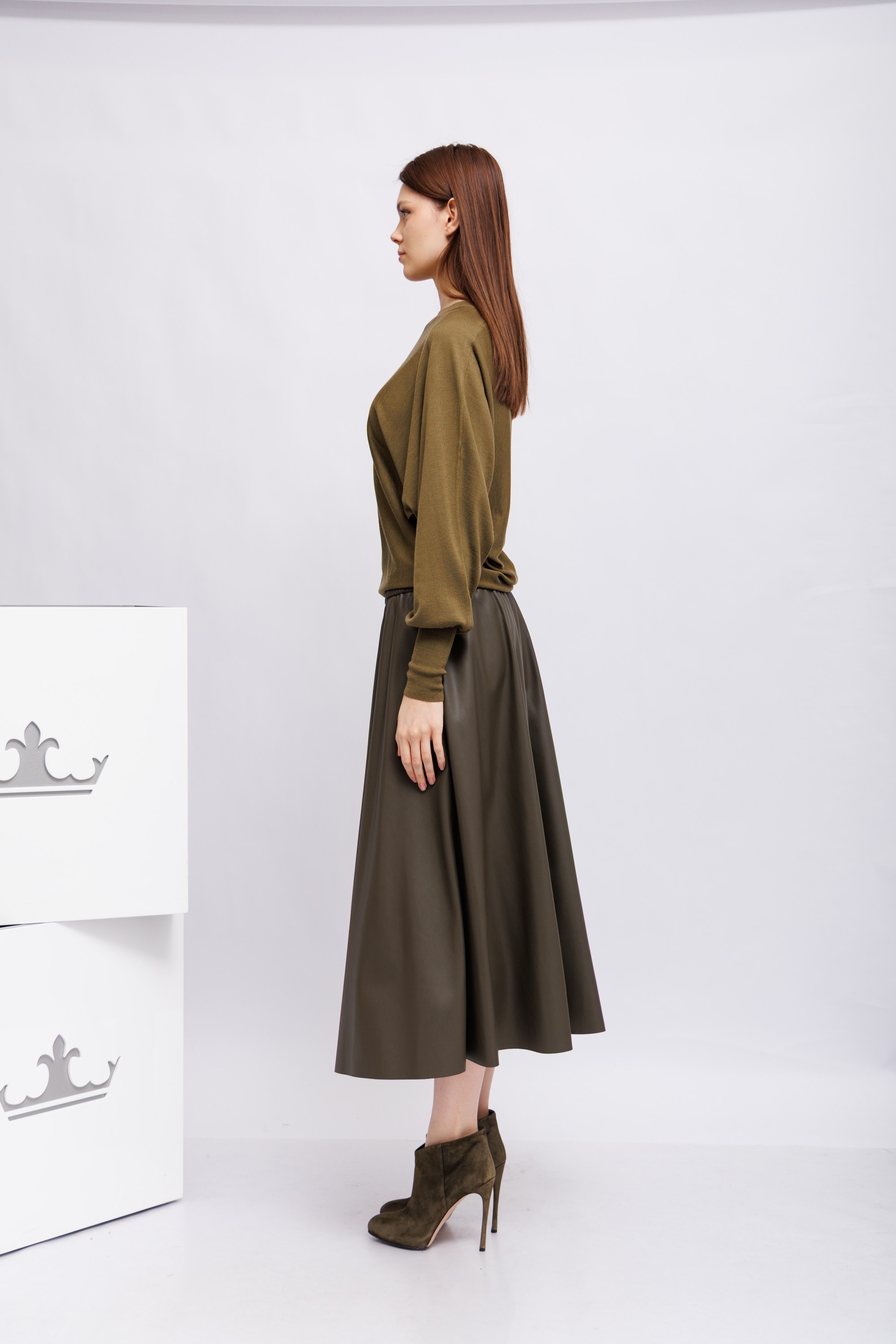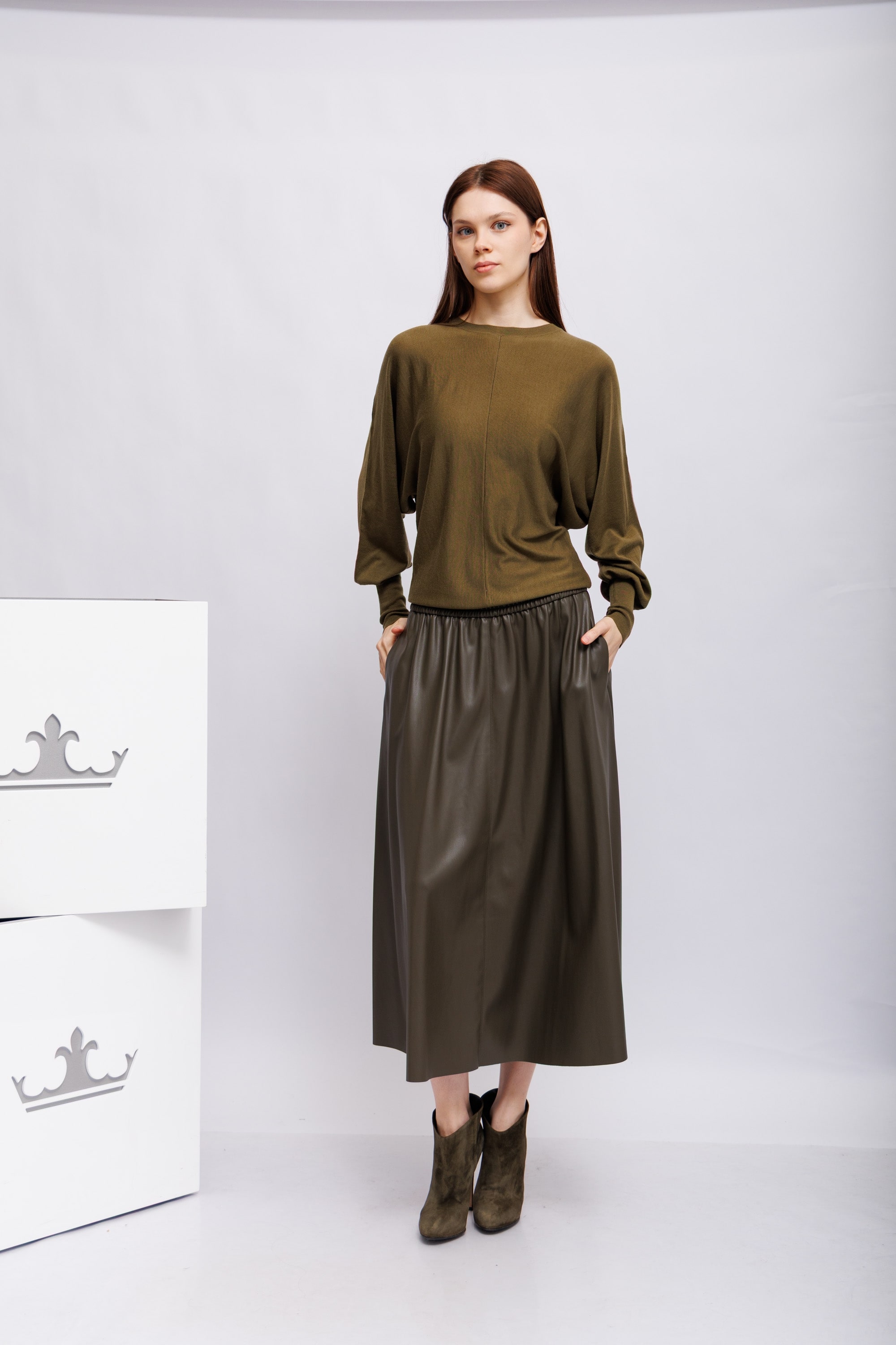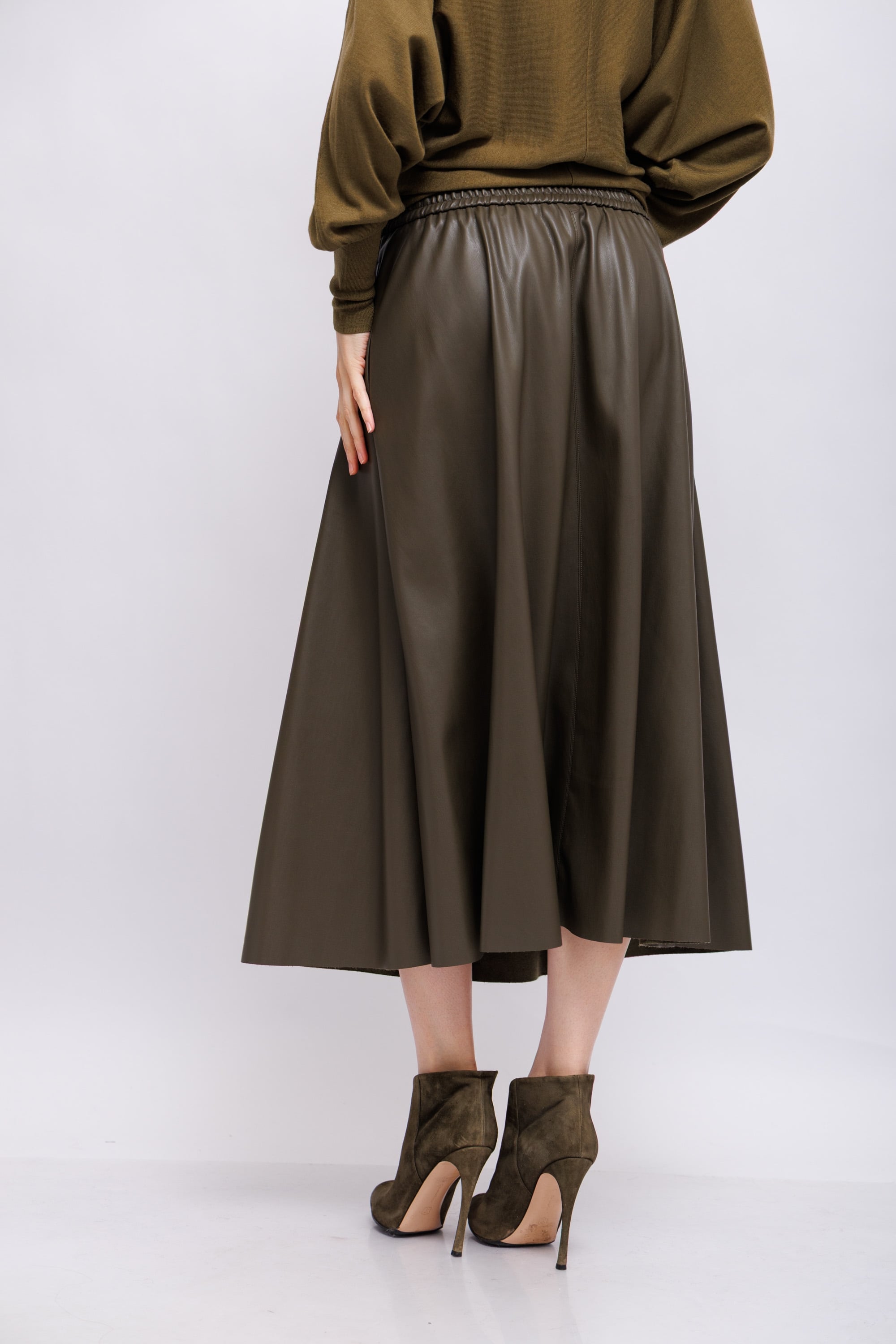 Юбка из экокожиОливковый цветРасклешённый кройБоковые карманыЭластичный пояс
