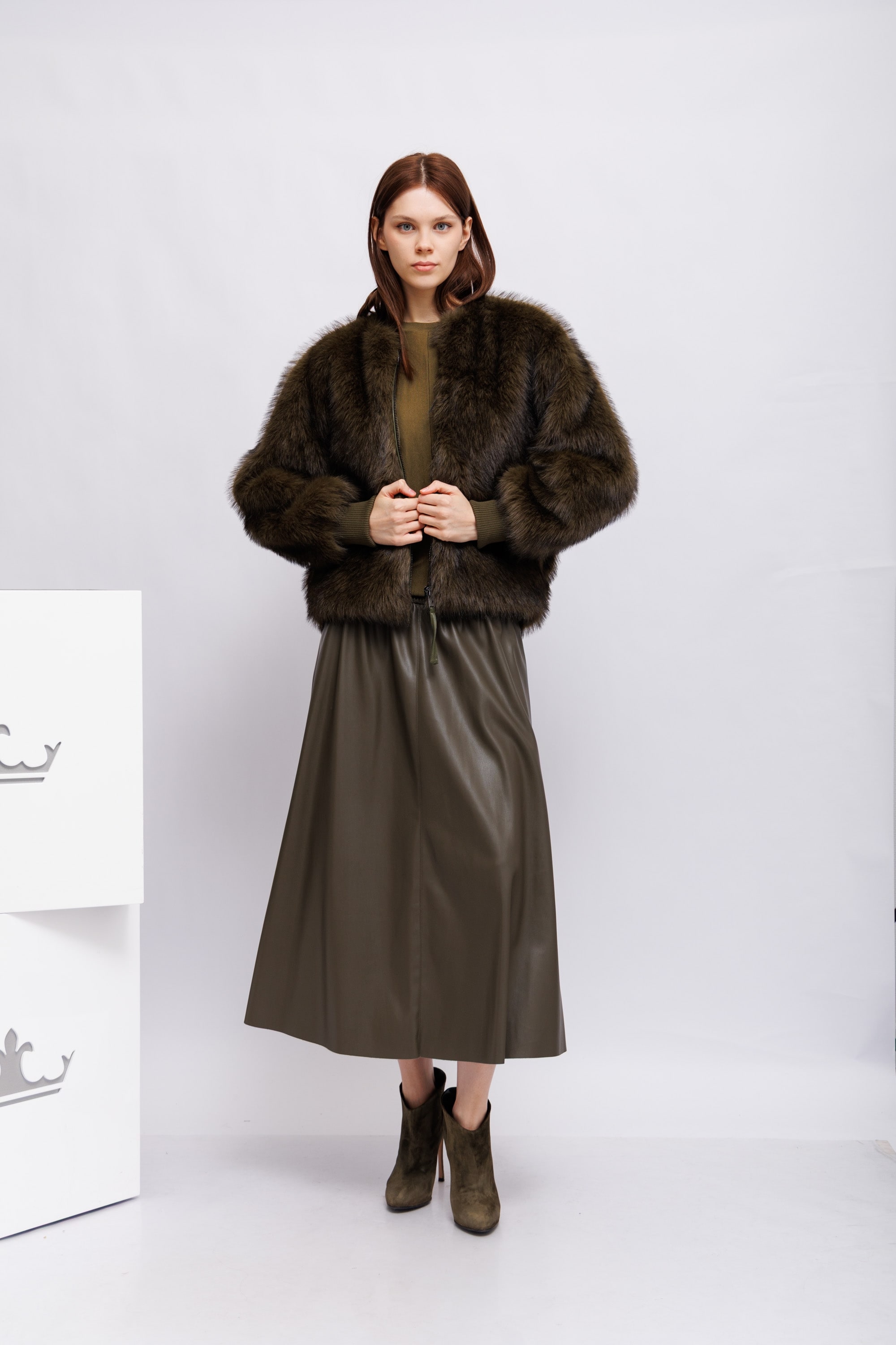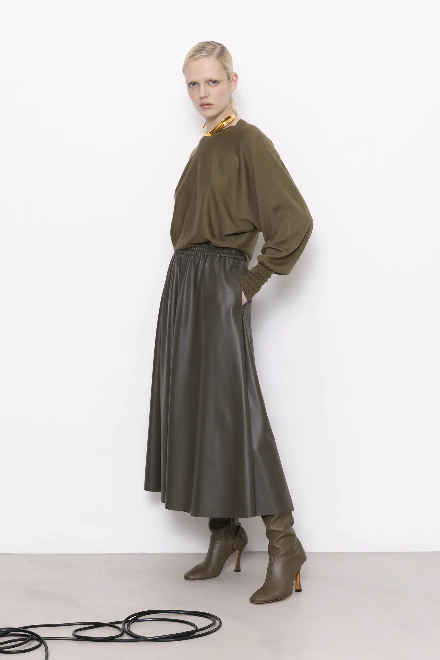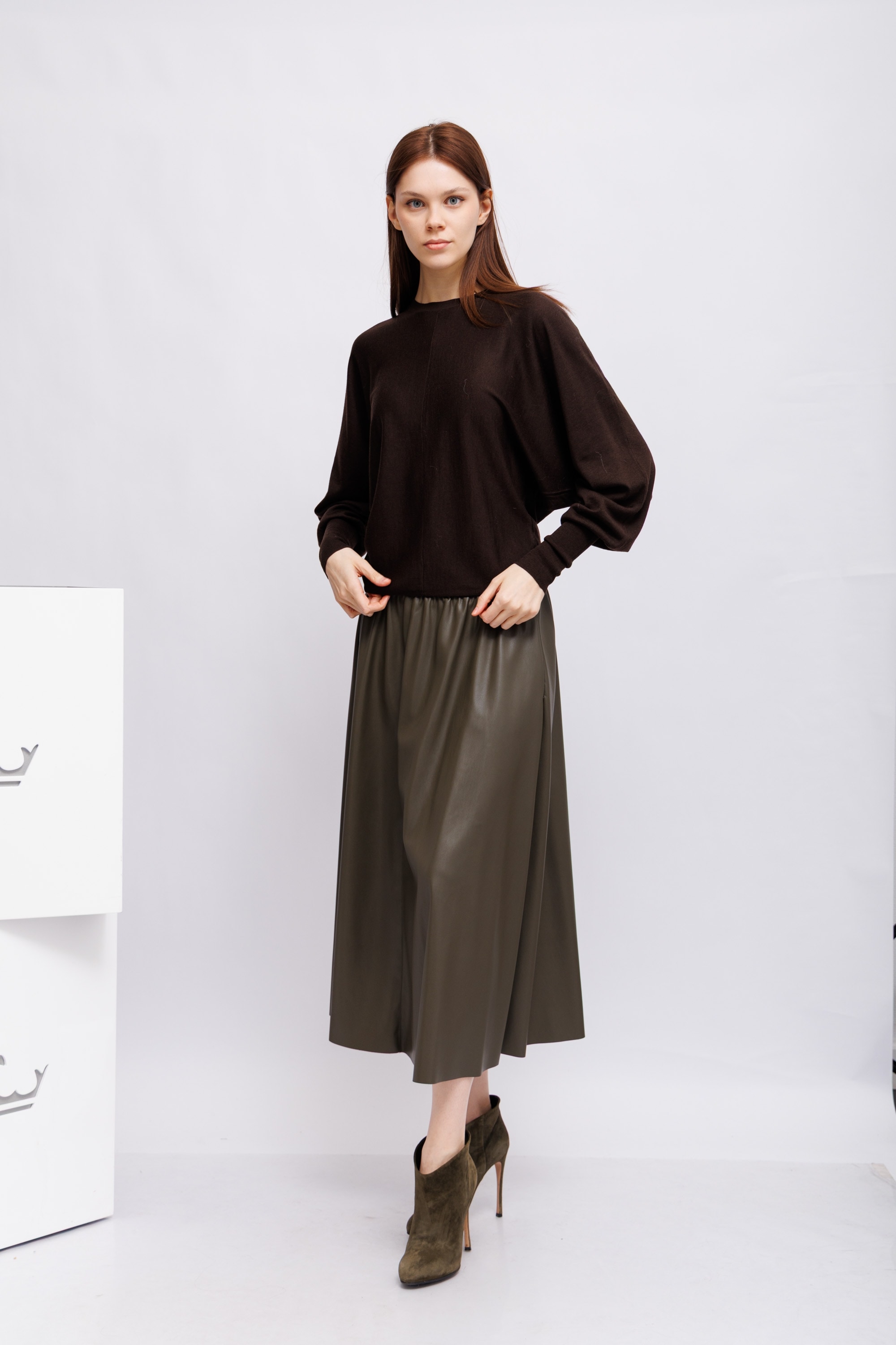 Юбка из экокожиОливковый цветРасклешённый кройБоковые карманыЭластичный пояс