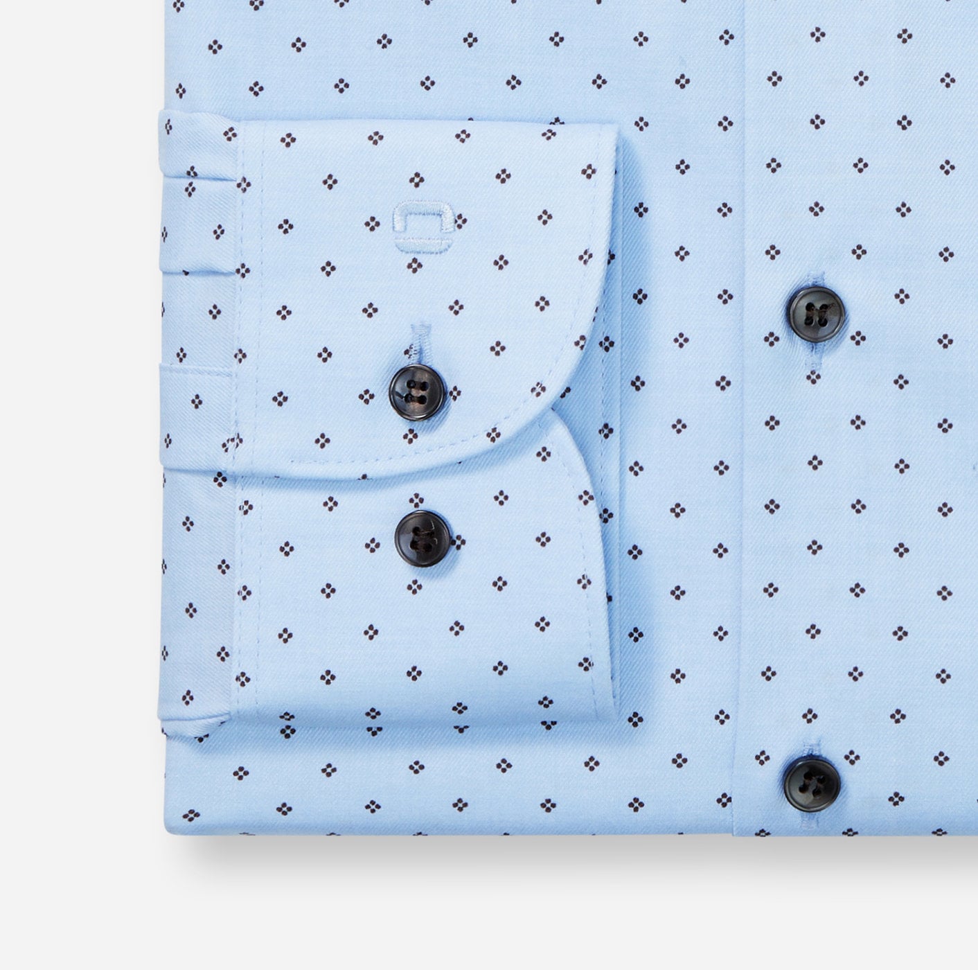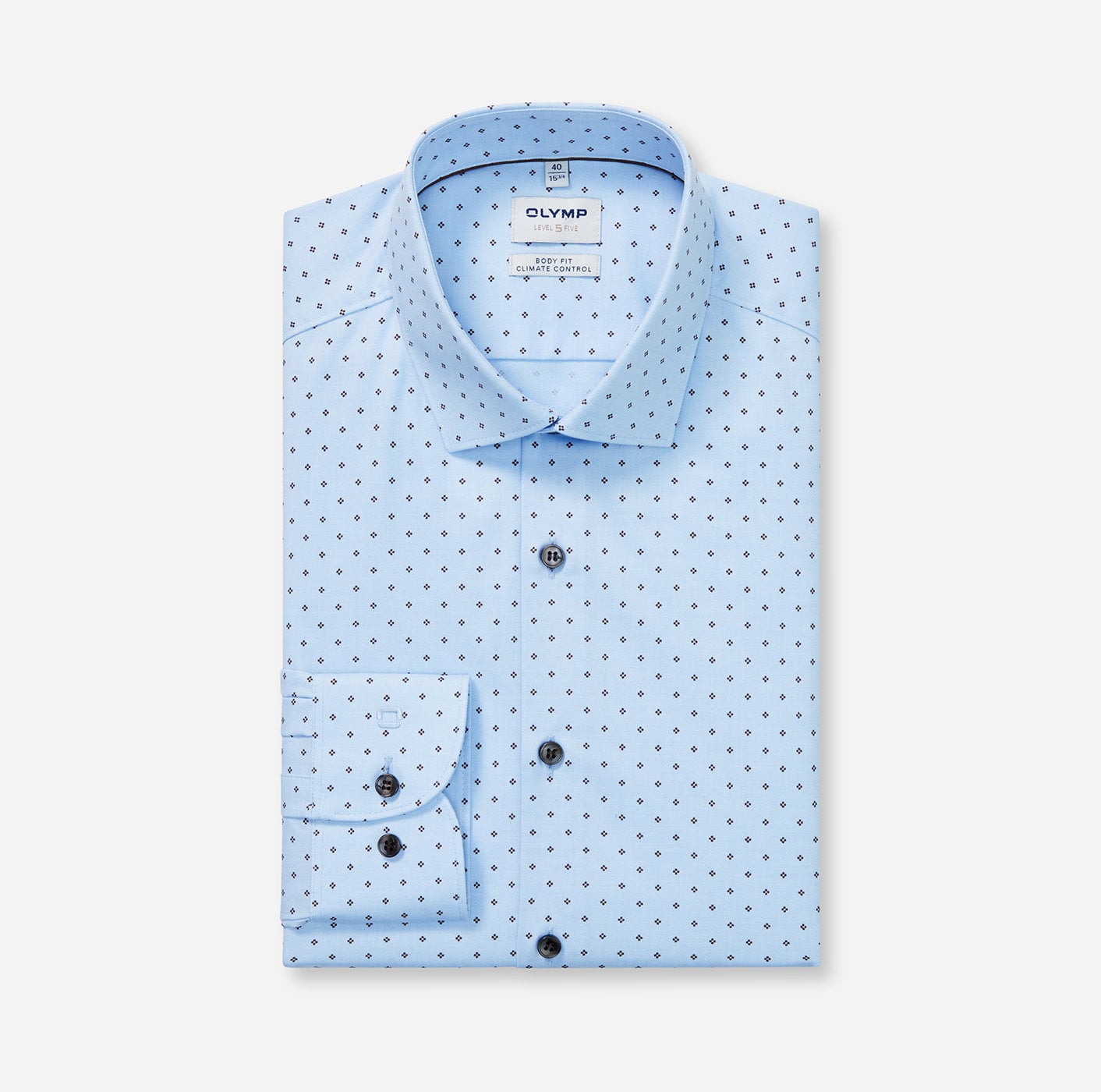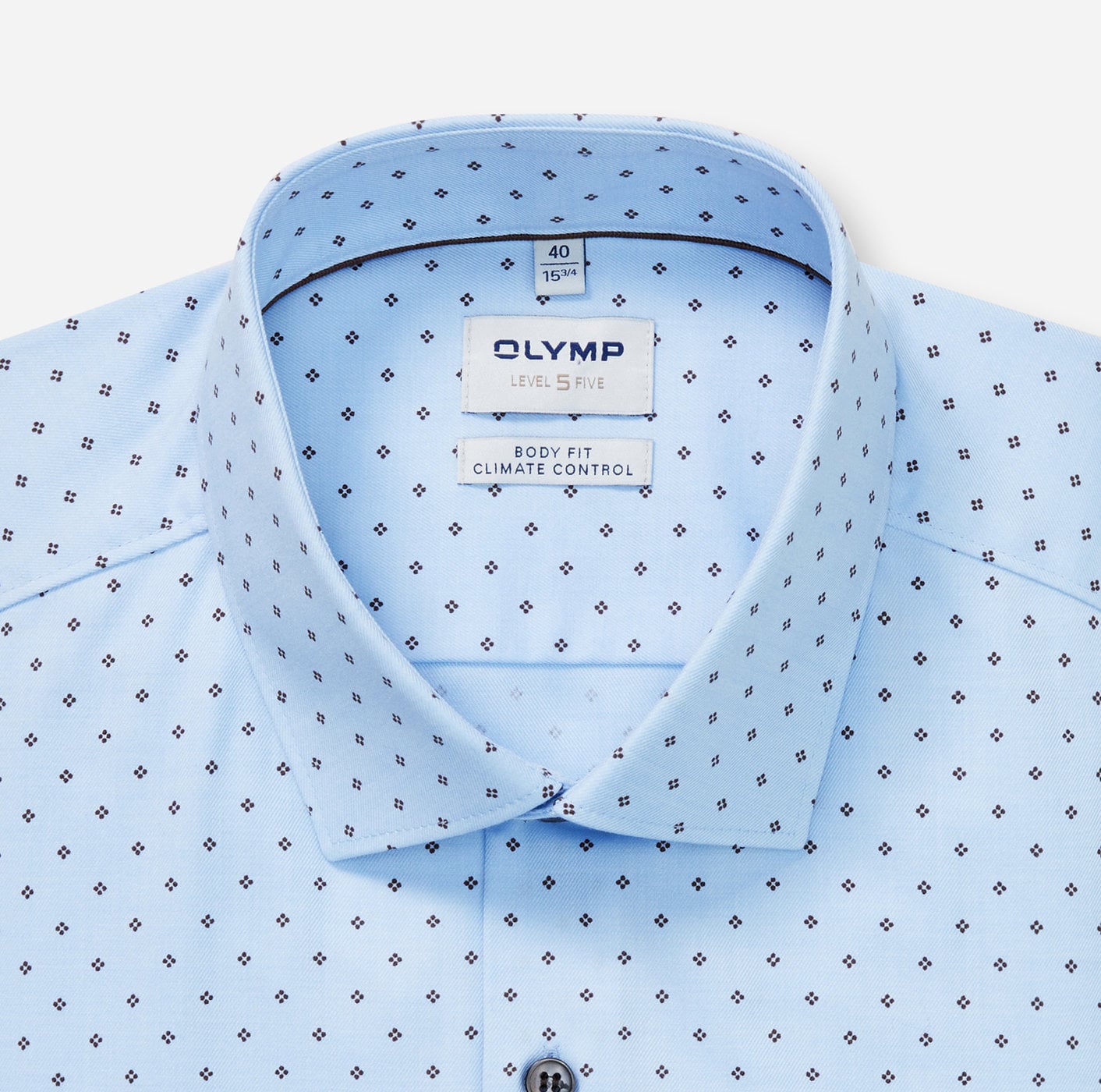 Инновационная высокотехнологичная пряжа и динамичный дизайн. Линия OLYMP Level Five впечатляет своей функциональностью и стилем. Смесь волокон Climate Control проста в уходе, воздухопроницаема, эластична, быстро сохнет и регулирует температуру и влажность. Классическая деловая сорочка голубого цвета с минималистичным дизайном, современным воротом Kent и контрастными пуговицами.