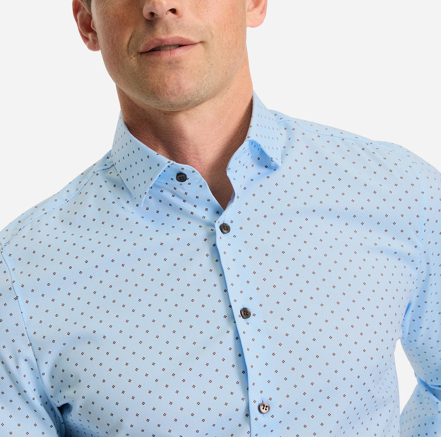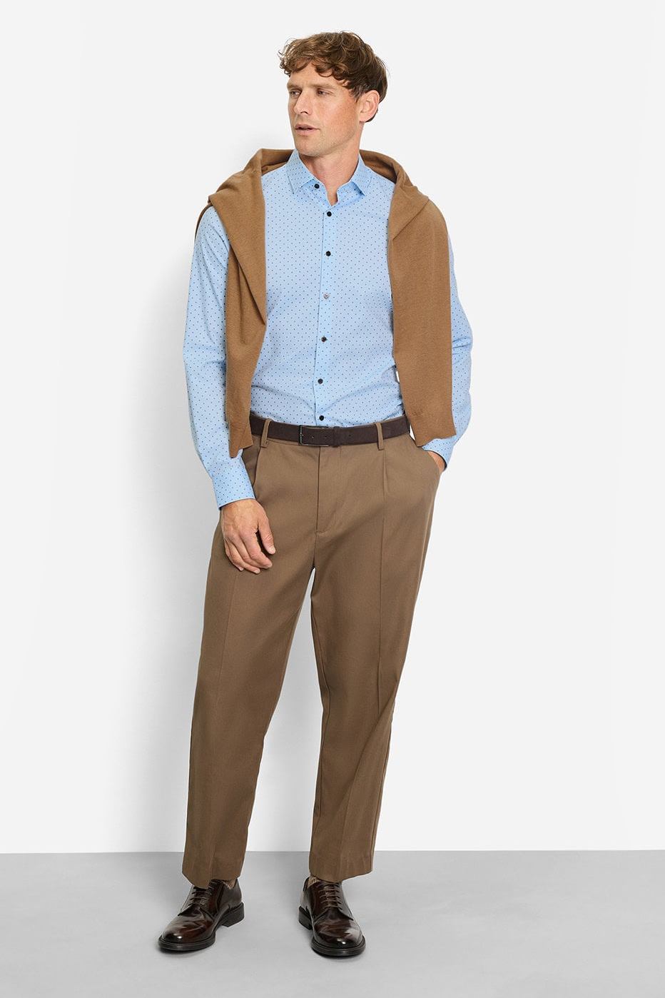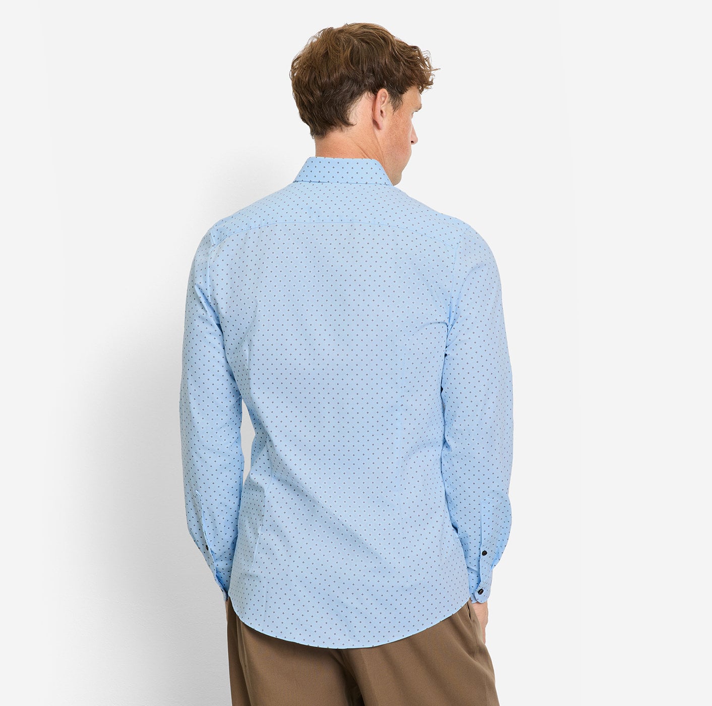 Инновационная высокотехнологичная пряжа и динамичный дизайн. Линия OLYMP Level Five впечатляет своей функциональностью и стилем. Смесь волокон Climate Control проста в уходе, воздухопроницаема, эластична, быстро сохнет и регулирует температуру и влажность. Классическая деловая сорочка голубого цвета с минималистичным дизайном, современным воротом Kent и контрастными пуговицами.