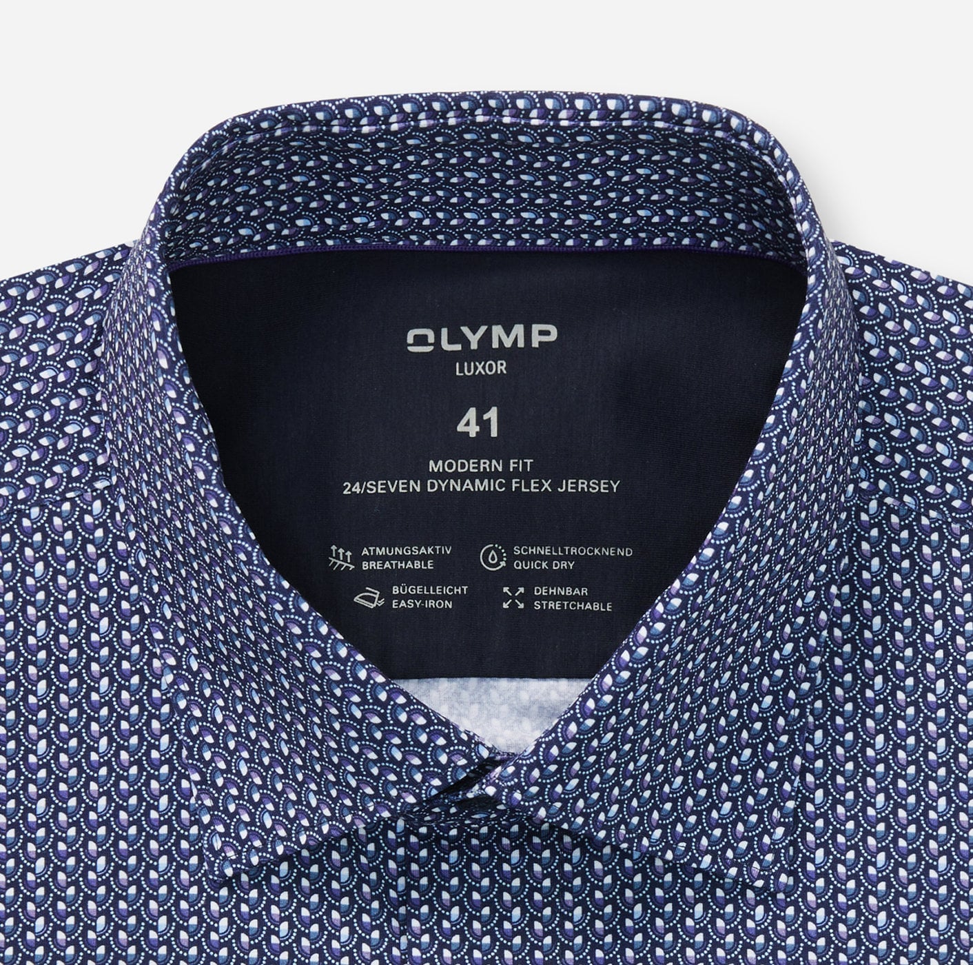 Стильный белый принт на темно-синем фоне, привлекательный силуэт. Так выглядит инновационная футболка OLYMP Luxor 24/Seven из ткани Dynamic Flex Jersey. Мягкая хлопковая и эластановая ткань подчеркивает спортивную элегантность и индивидуальность. Гармонично дополнена стильным воротом New Kent. Дышащая, быстросохнущая, легко гладится.