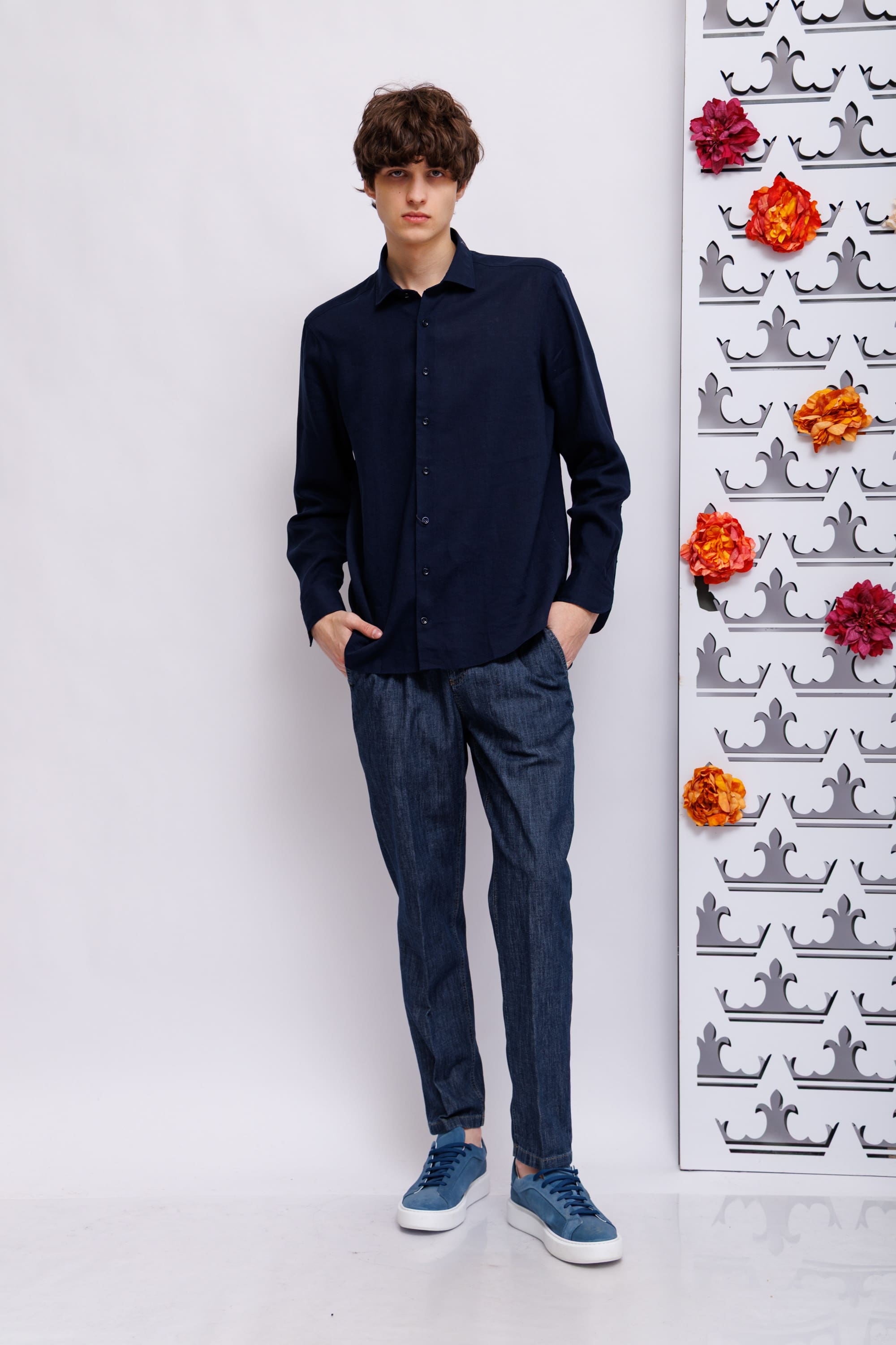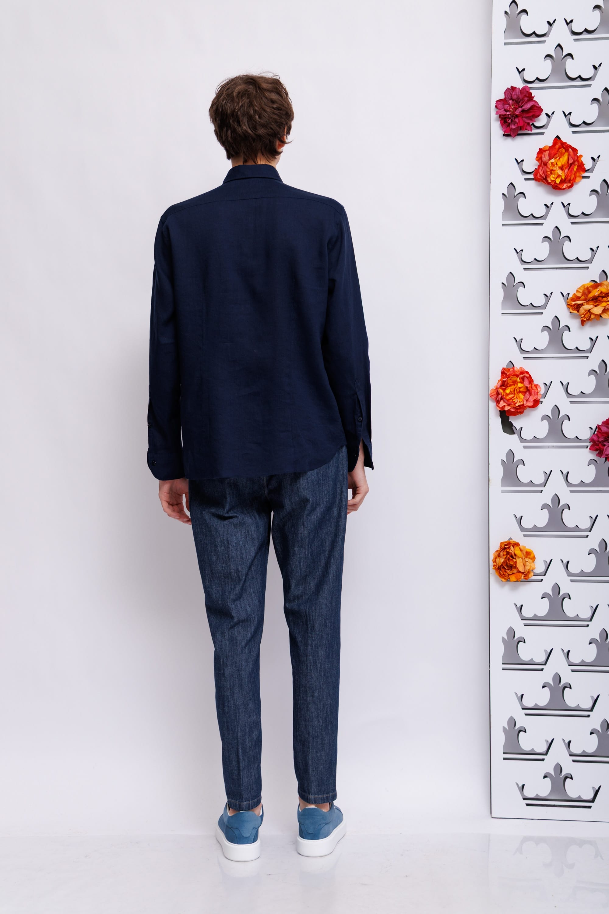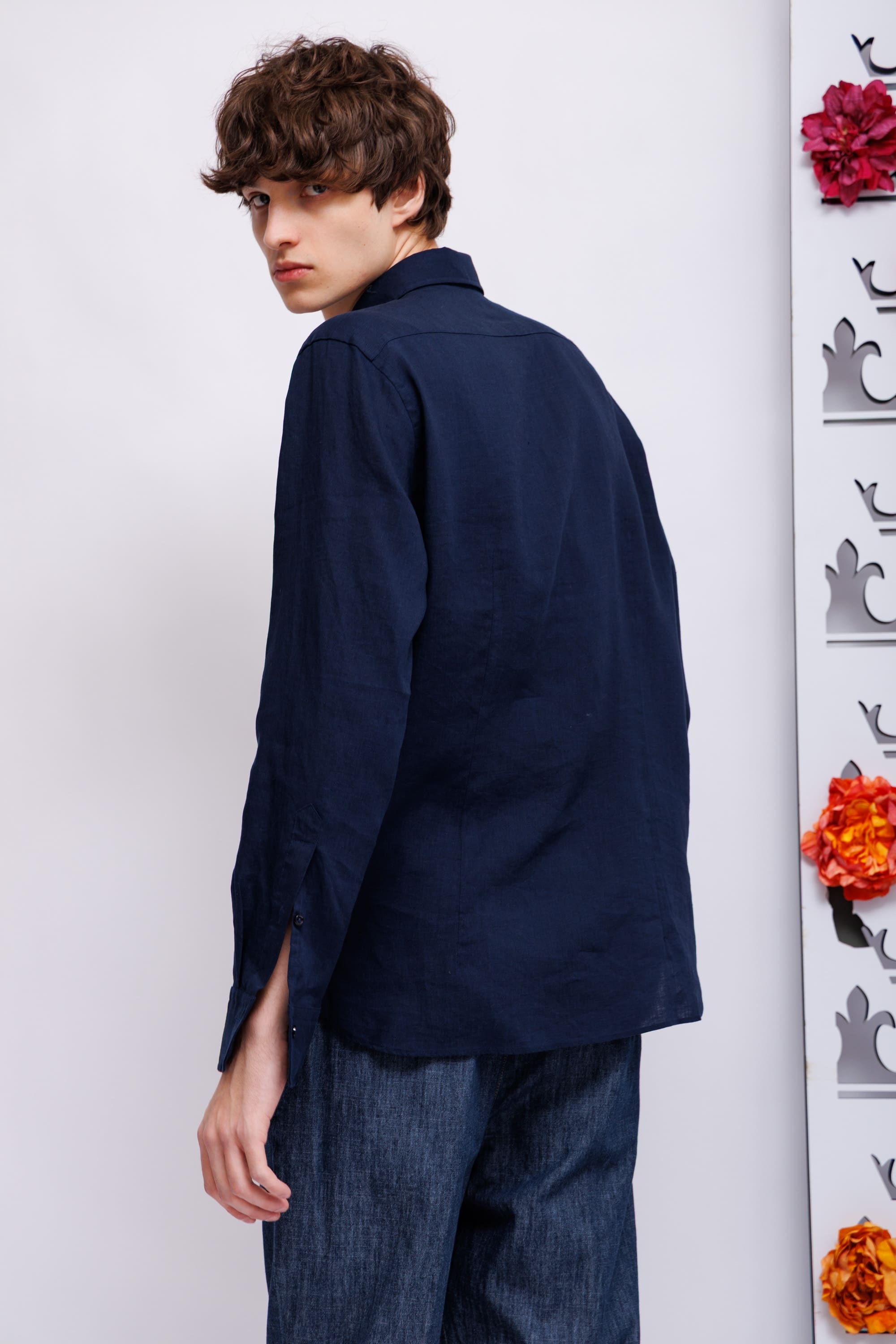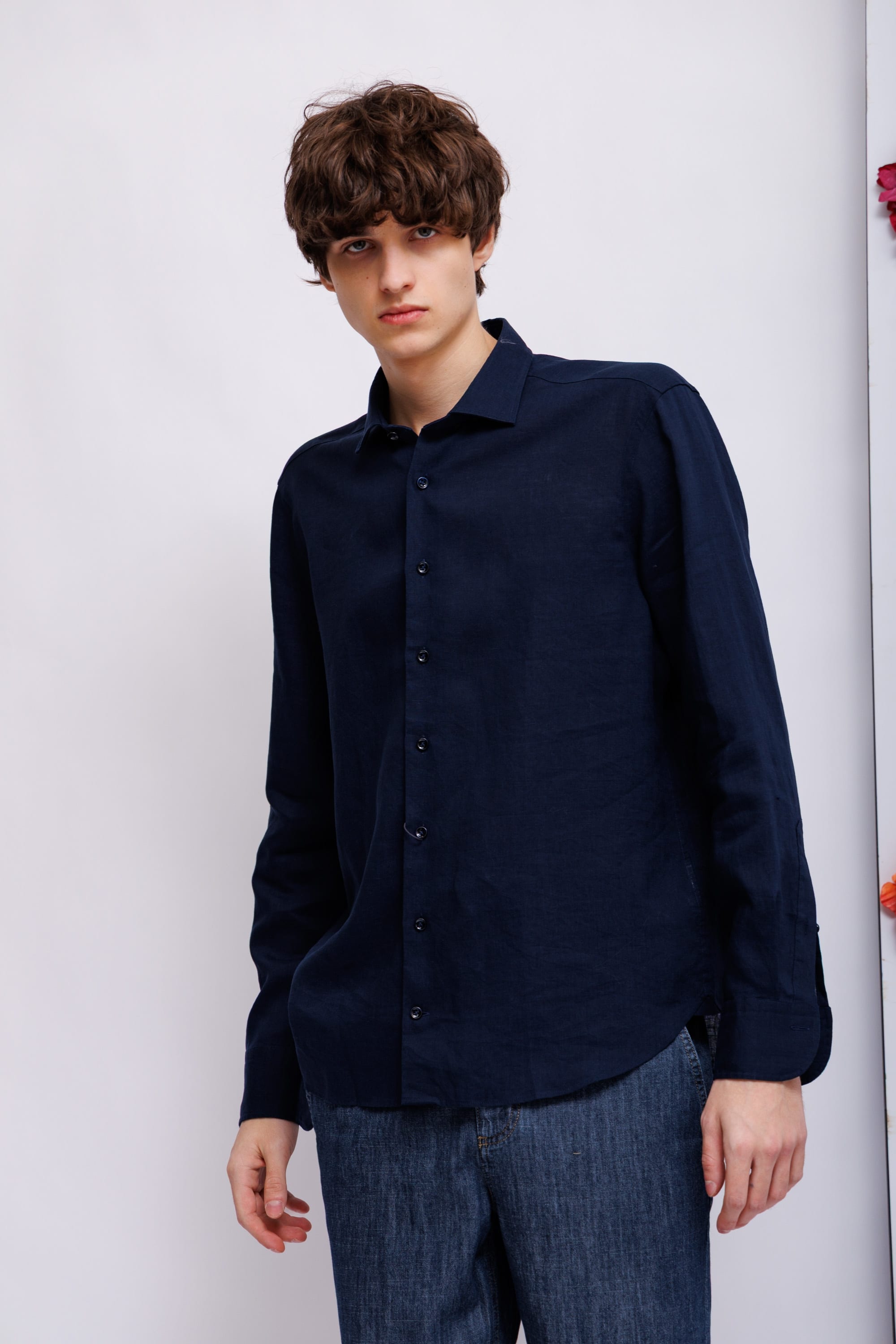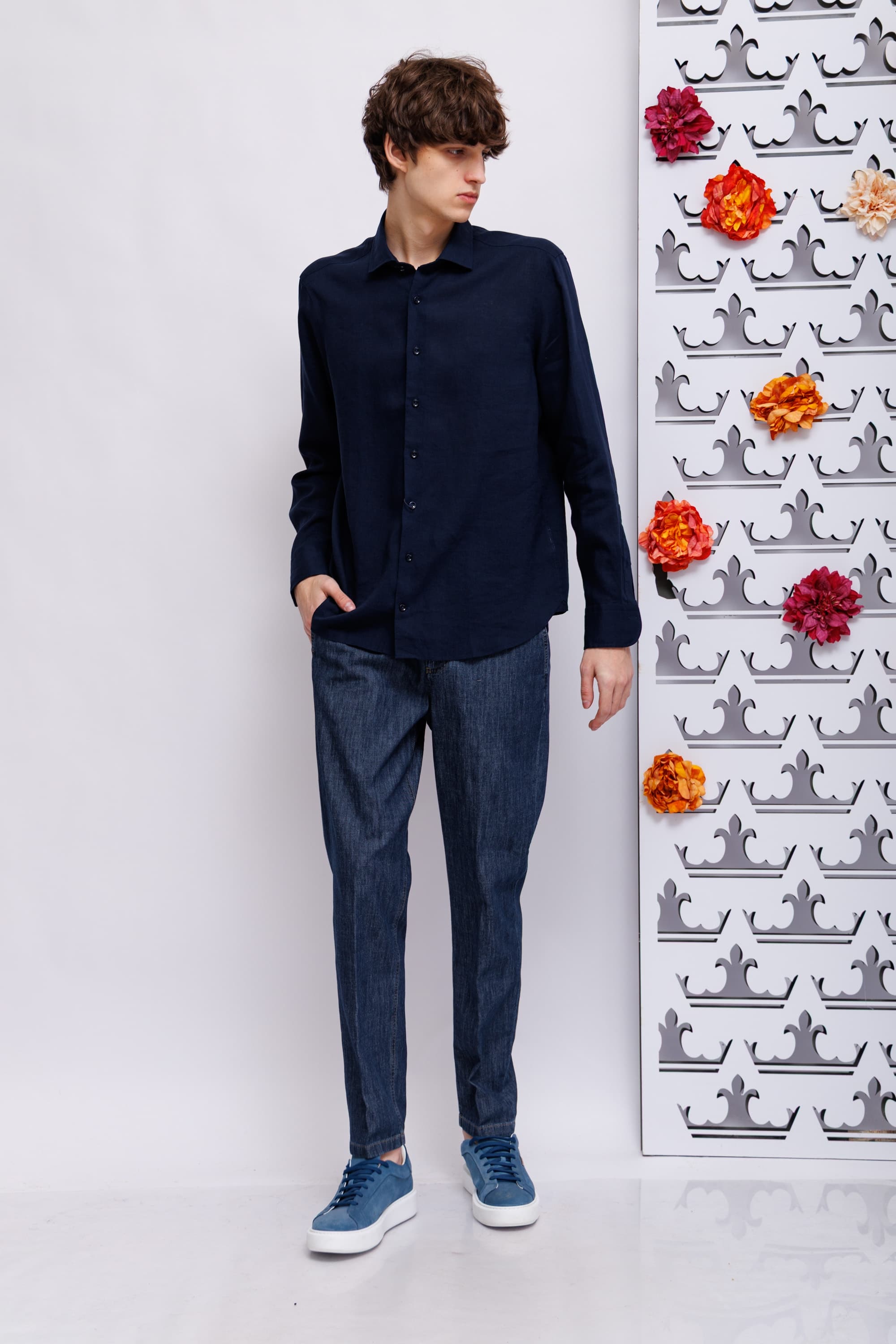 Сорочка синего цвета полуприлегающего силуэта с длинными рукавами, манжет закругленный под часы. Ворот "кент". Фигурный низ. Pure linen - натуральный лен и комфорт.
