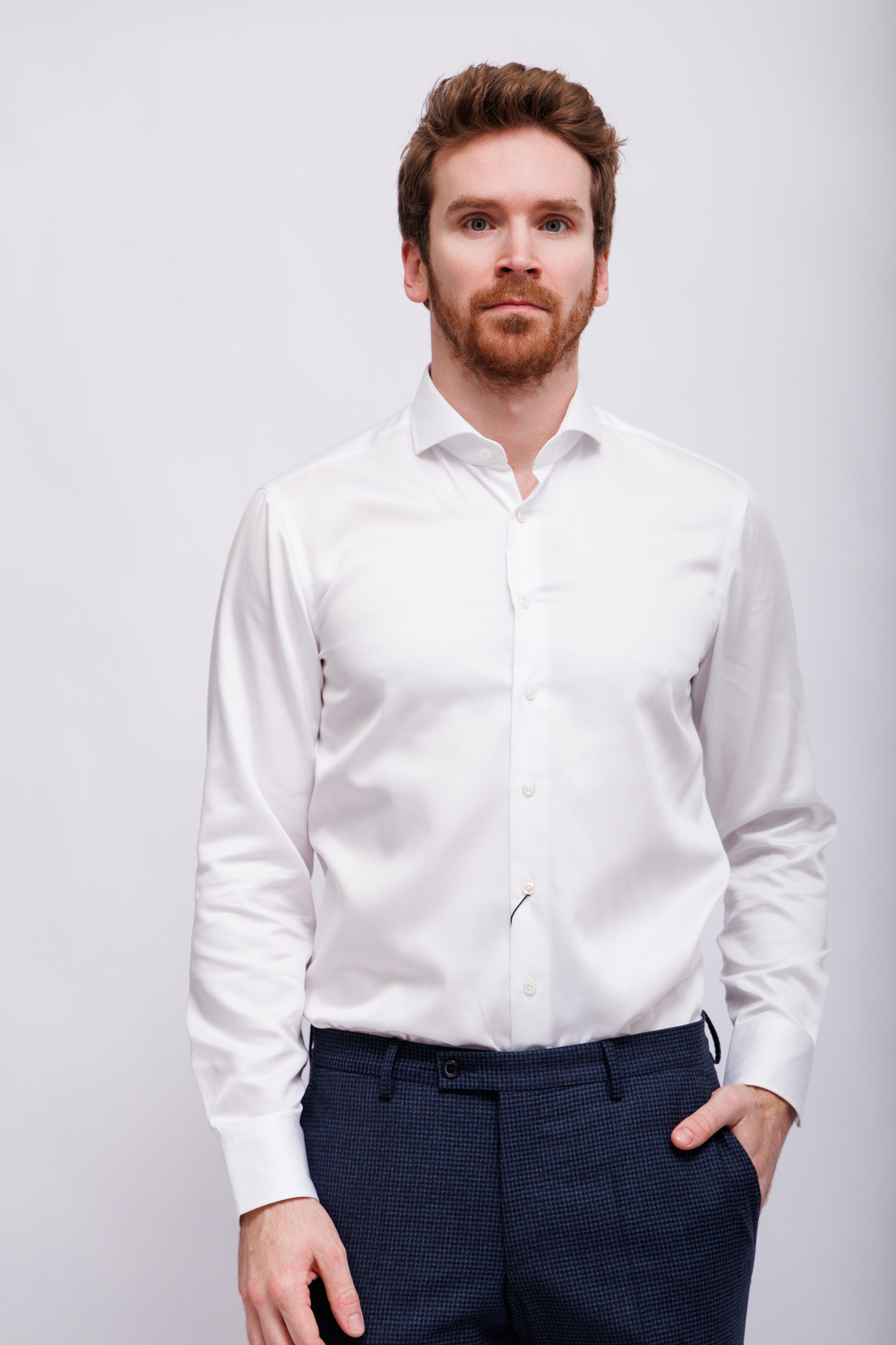 Сорочка белая в выработкуРукава длинныеВорот- "акула"(раскрытый по форме)Пуговицы светлые из глубоководного перламутра