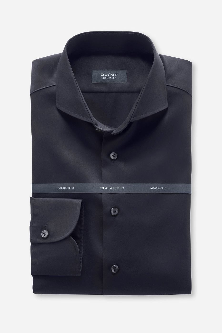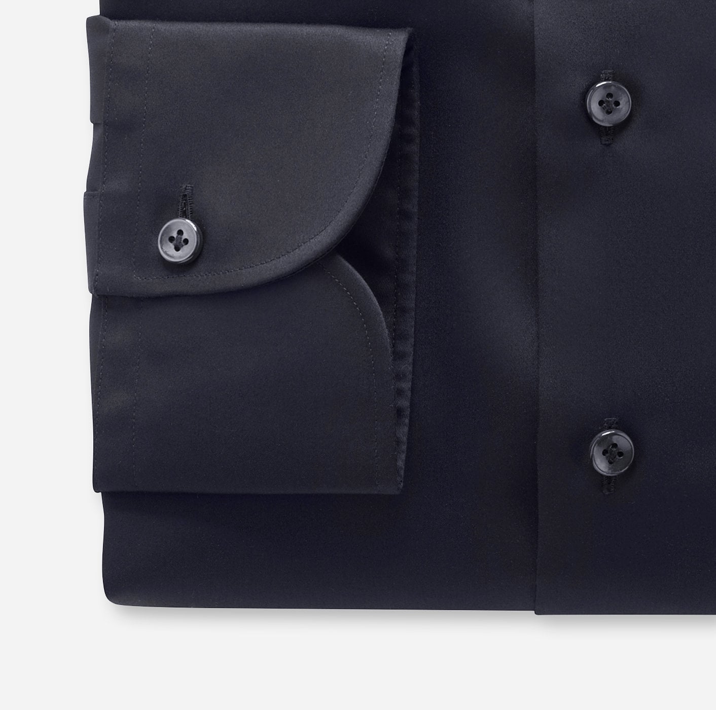 Сорочка OLYMP SIGNATURE черного цвета, изготовленная из высококачественного атласного материала на основе хлопка премиум-класса. Эта рубашка с фирменным воротником-стойкой отличается высочайшим качеством исполнения и комфортом. Это подчеркивается изысканными деталями, такими как швы, прошитые вручную, петли для пуговиц, украшенные перламутровой строчкой, и пуговицы из натурального перламутра. Изысканный крой дополнительно подтверждает это: индивидуальный покрой, исключительно удобный вырез горловины, плечи и манжеты.