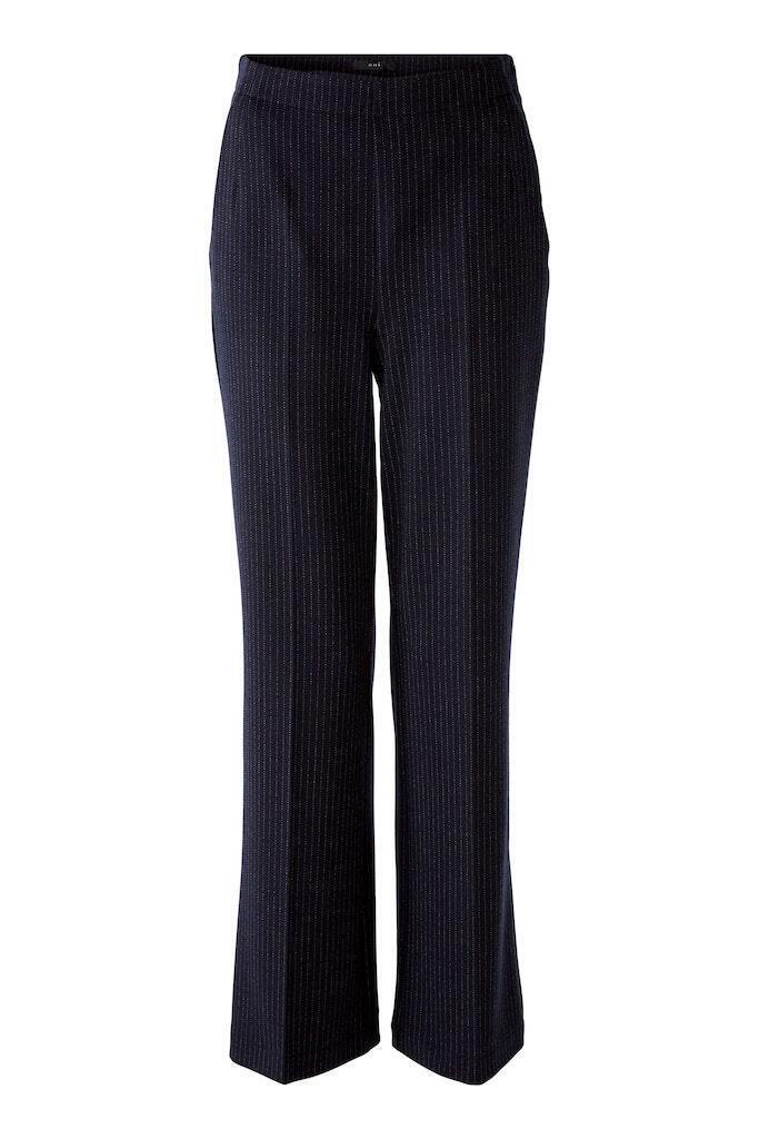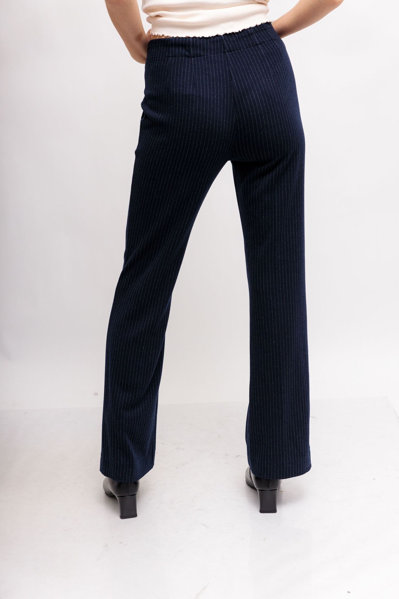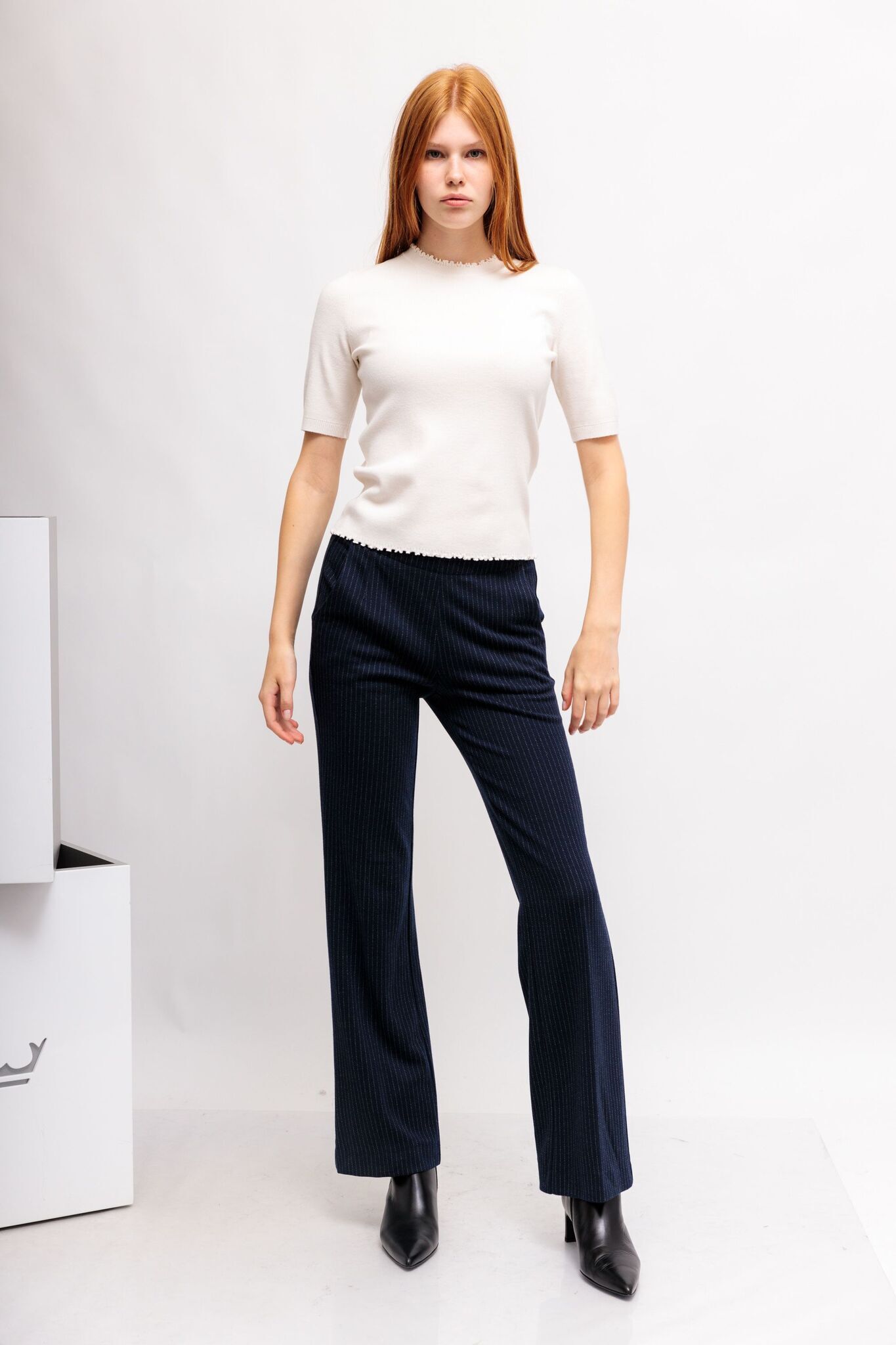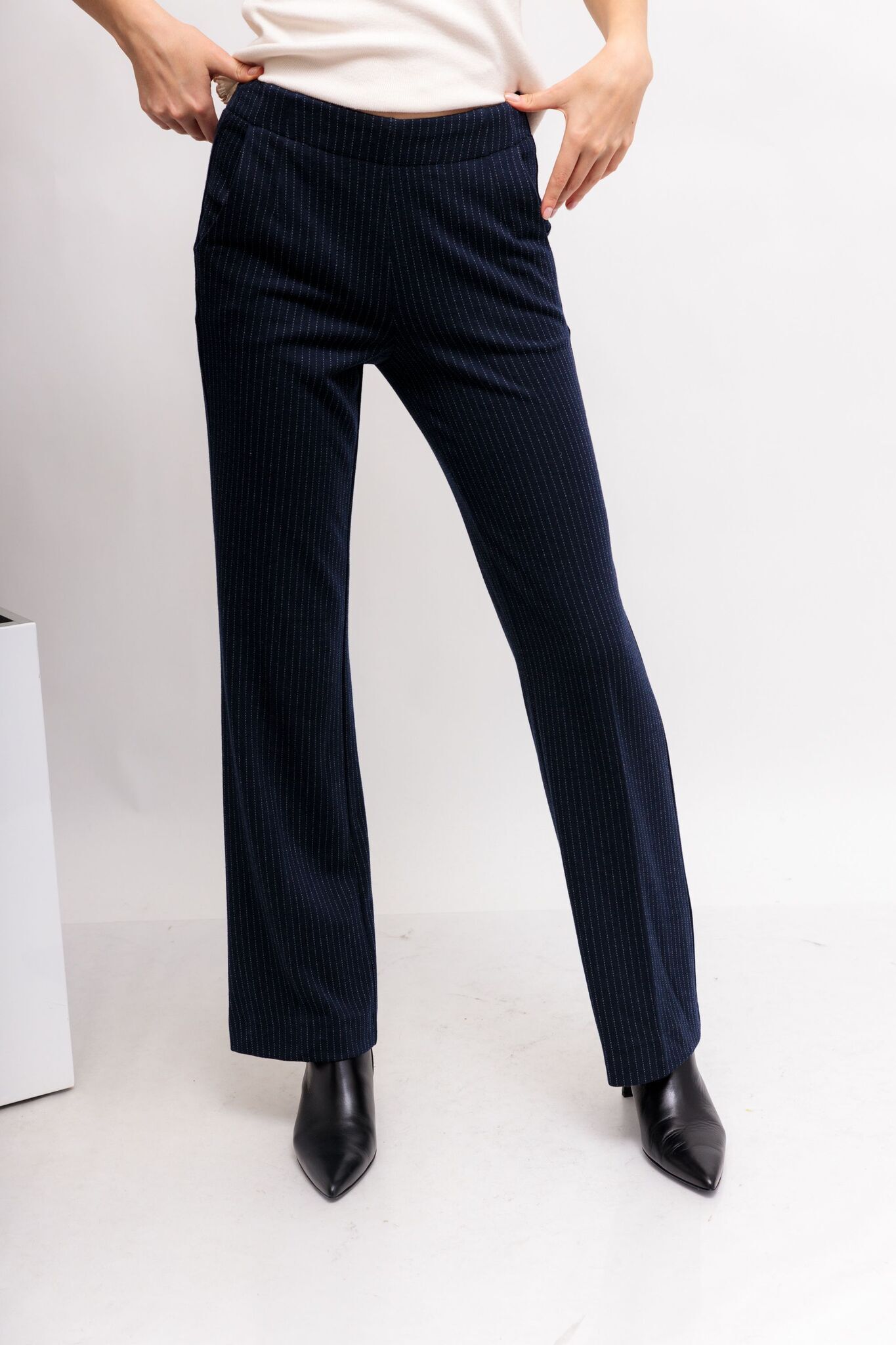Брюки -клёш джерси тёмно-синие полоскуПосадка высокаяПояс отстроченный без шлёвокГульфик на скрытой молнии и металлическом крючкеРасклешённый кройДлина полноценнаяКарманы косые боковые