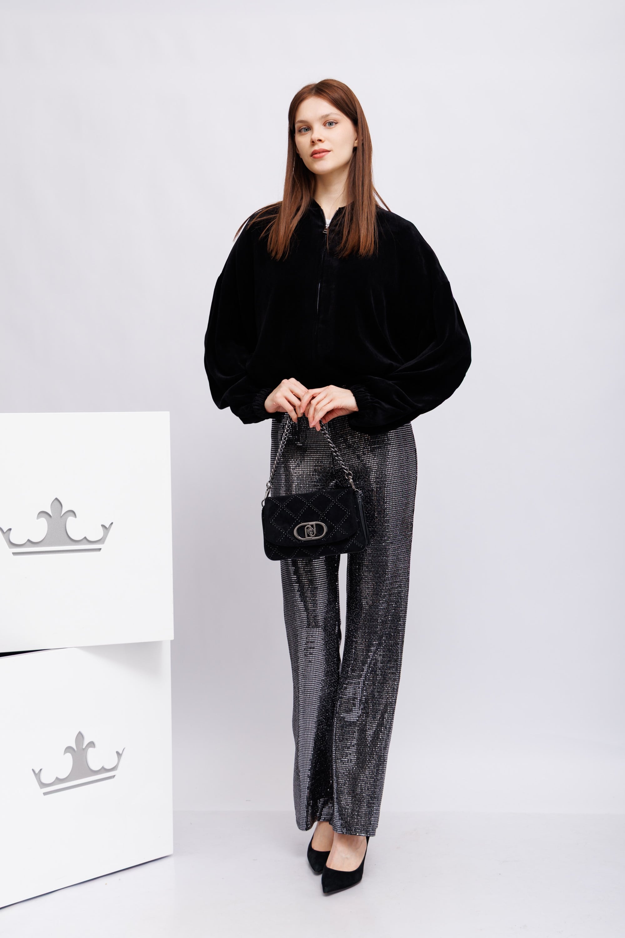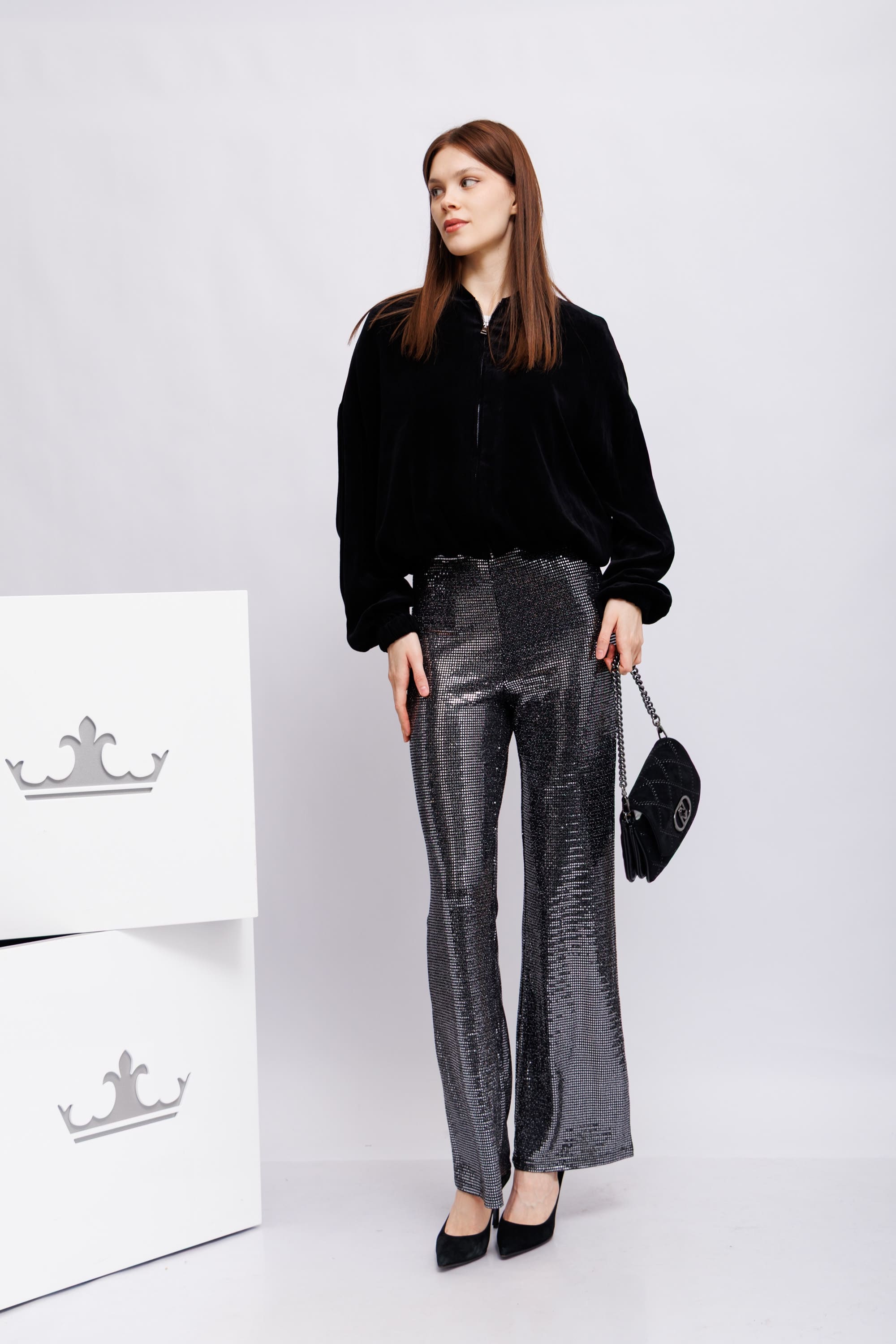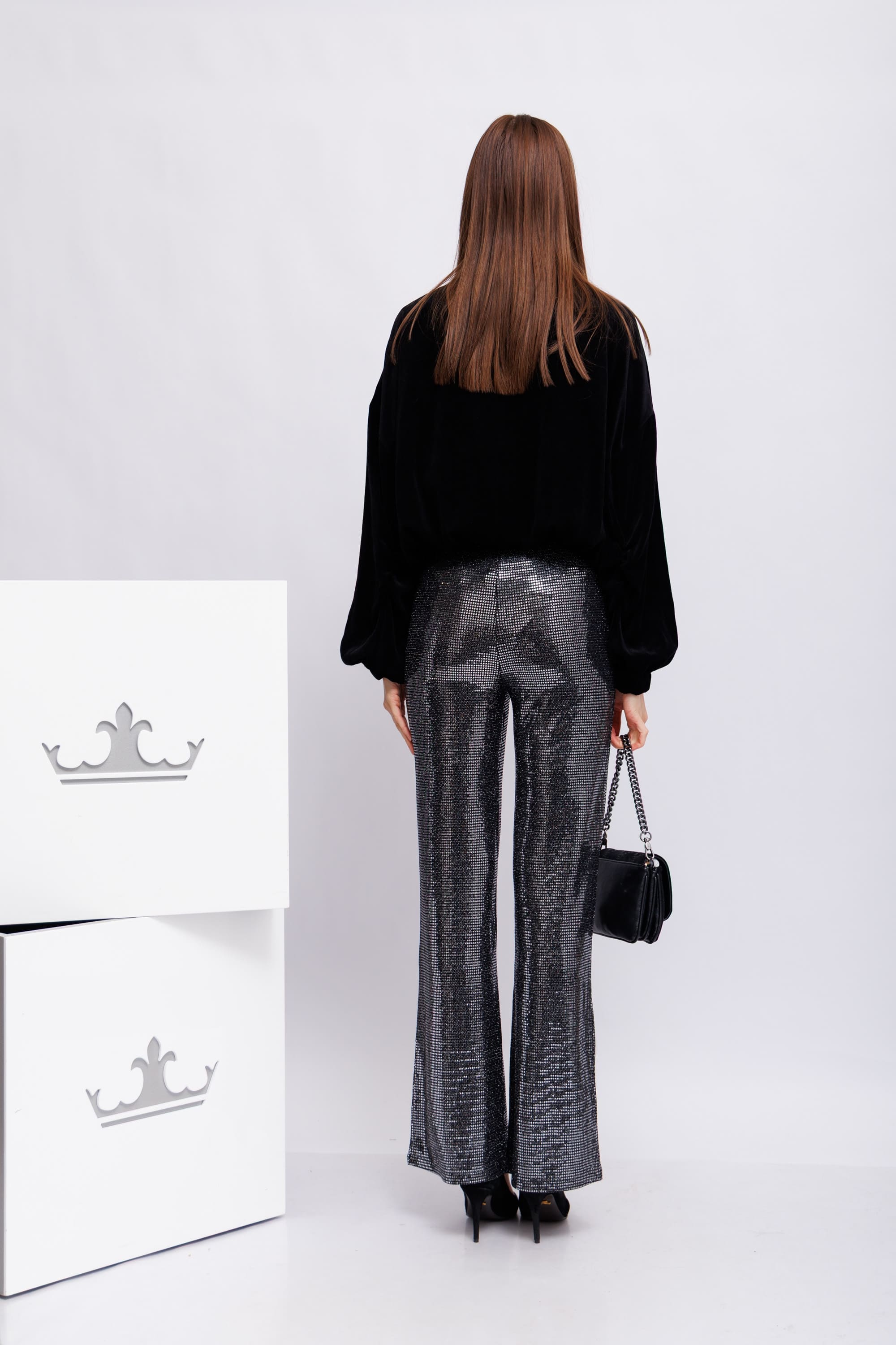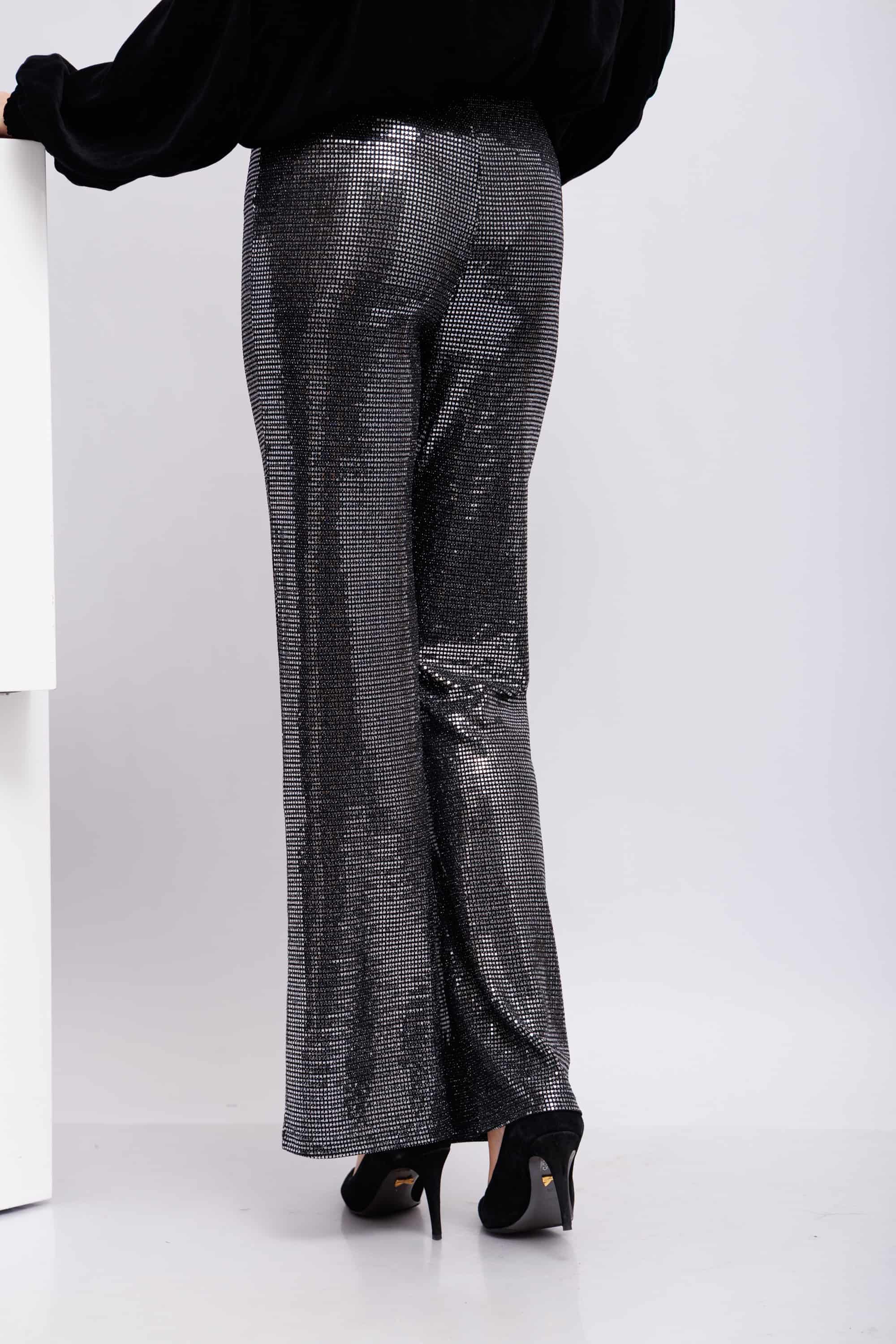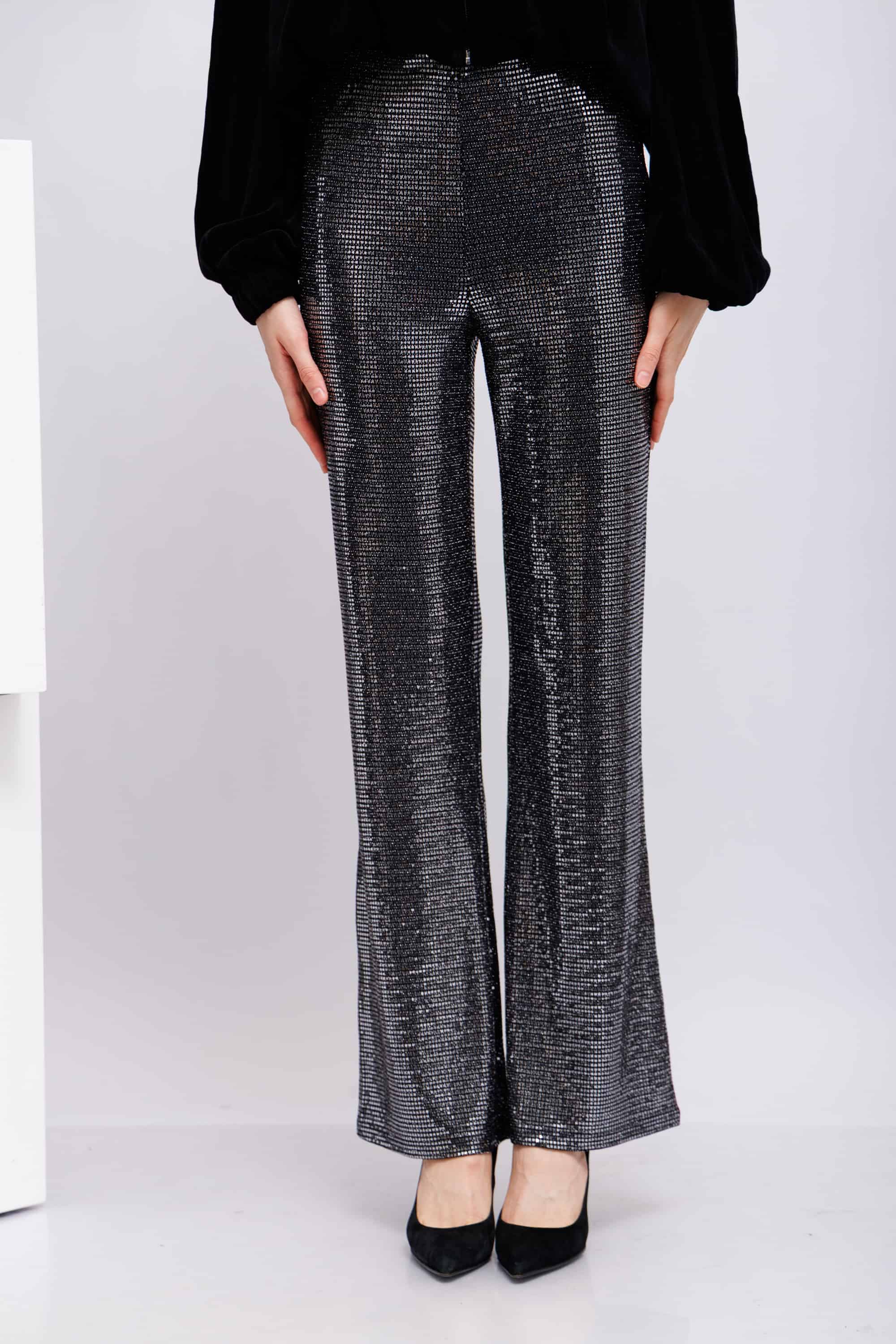 Диско- брюкиПолностью украшенные серебристыми деталями на манер пайетокКрой расклешенныйЗастежка на скрытую молнию