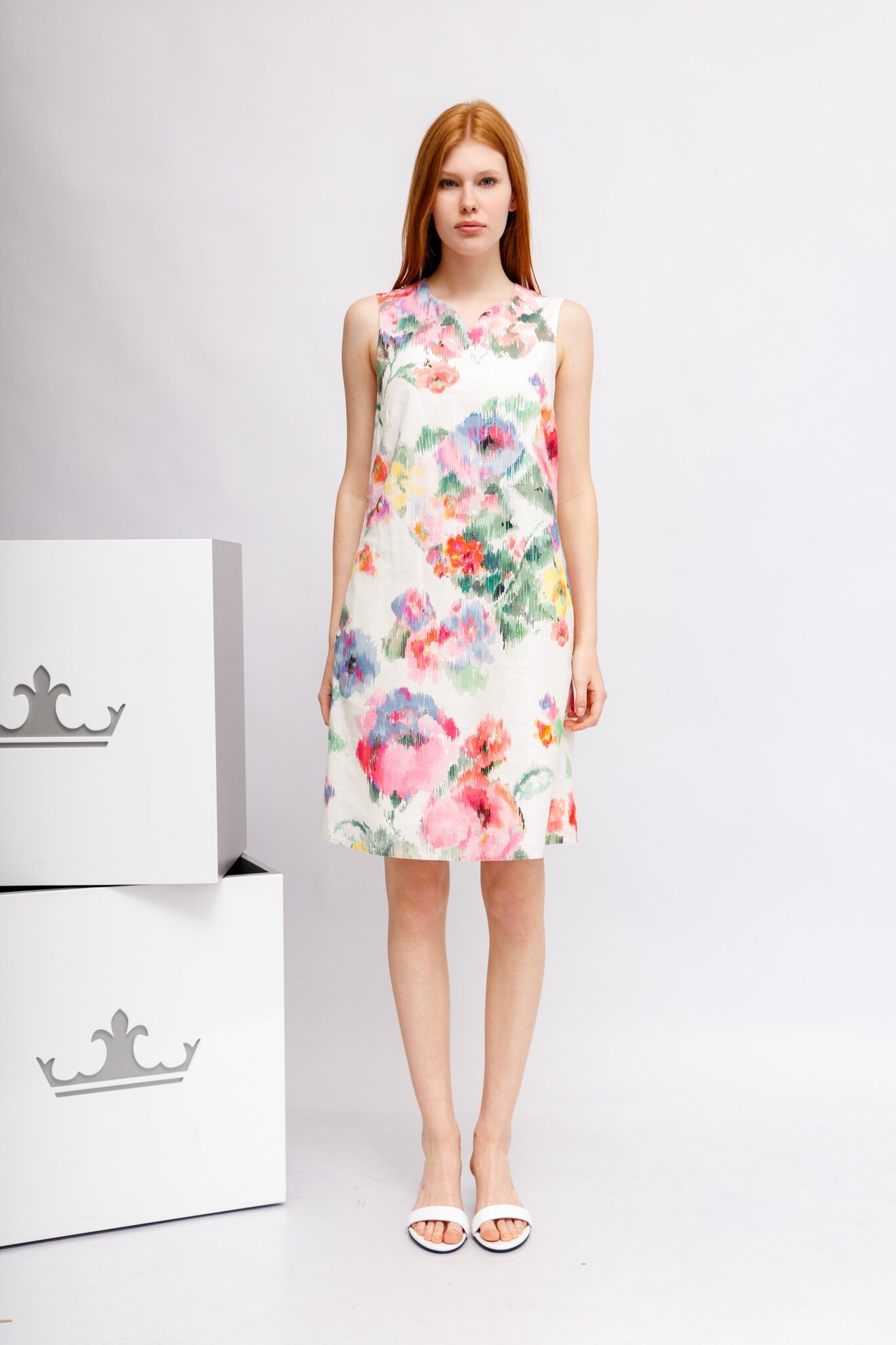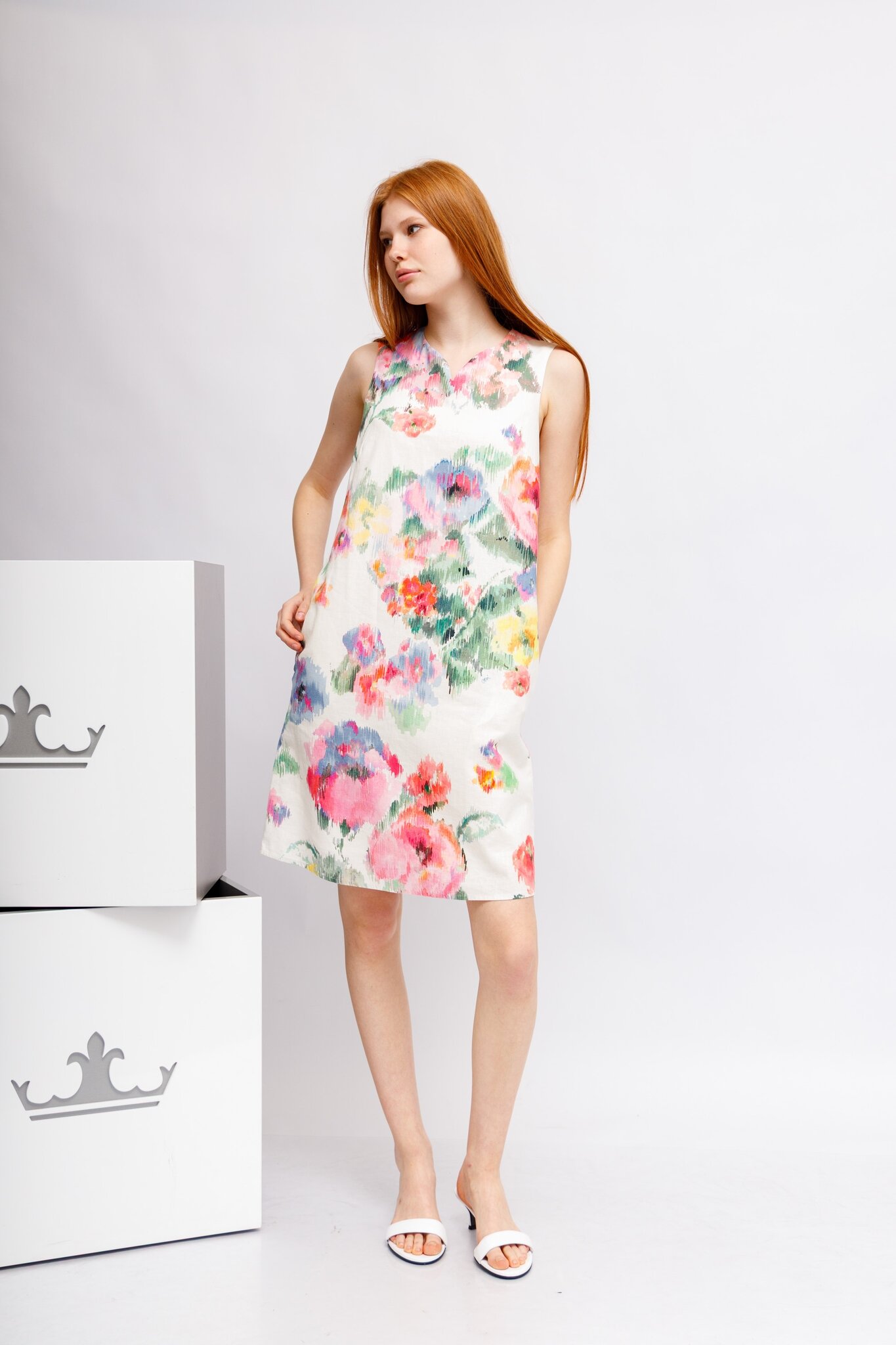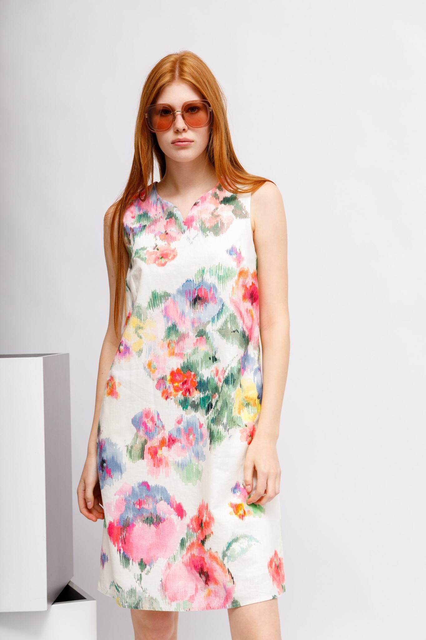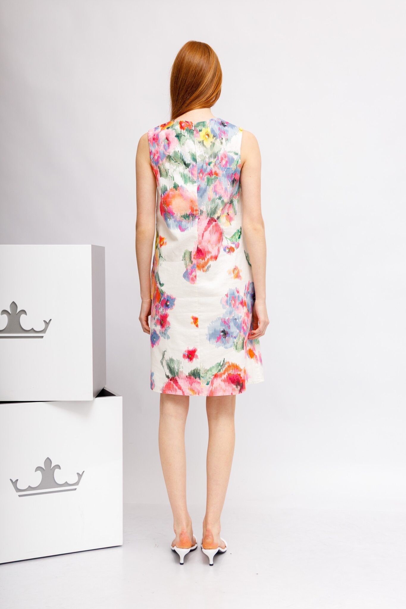 Высококачественная смесь льна и хлопка, сплошной принт — каждое изделие уникальноА-образный силуэт, длина до коленаЖенственный вырез с небольшим V-образным вырезомБесшовная молния сзадиБоковые карманыВ комплекте с хлопковой подкладкой