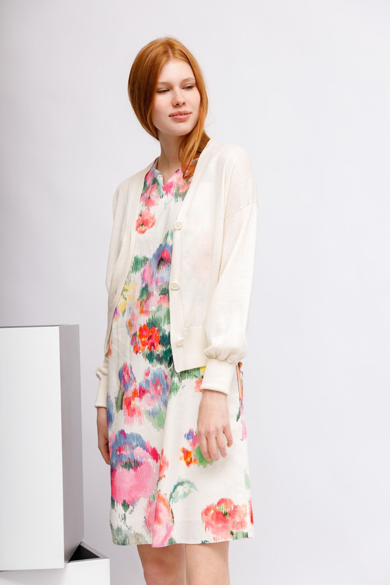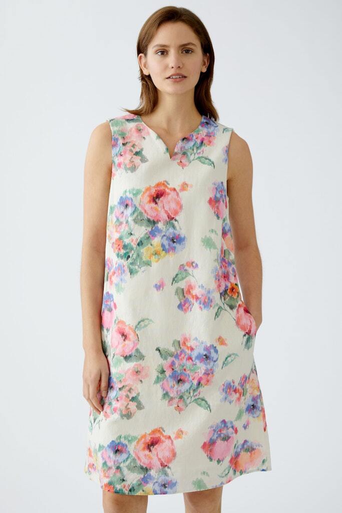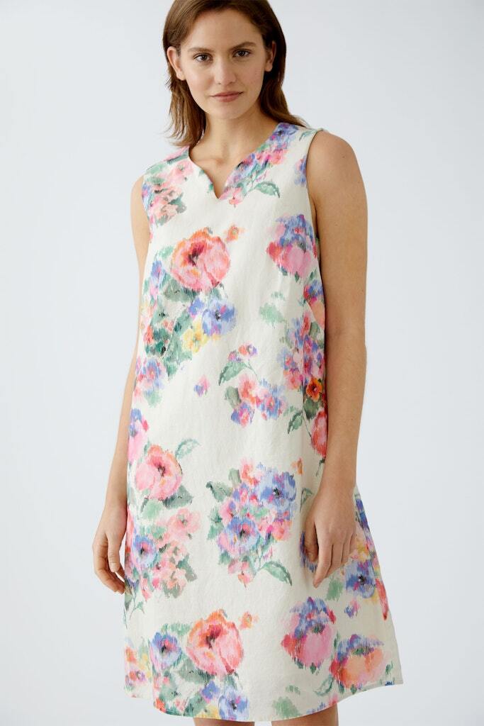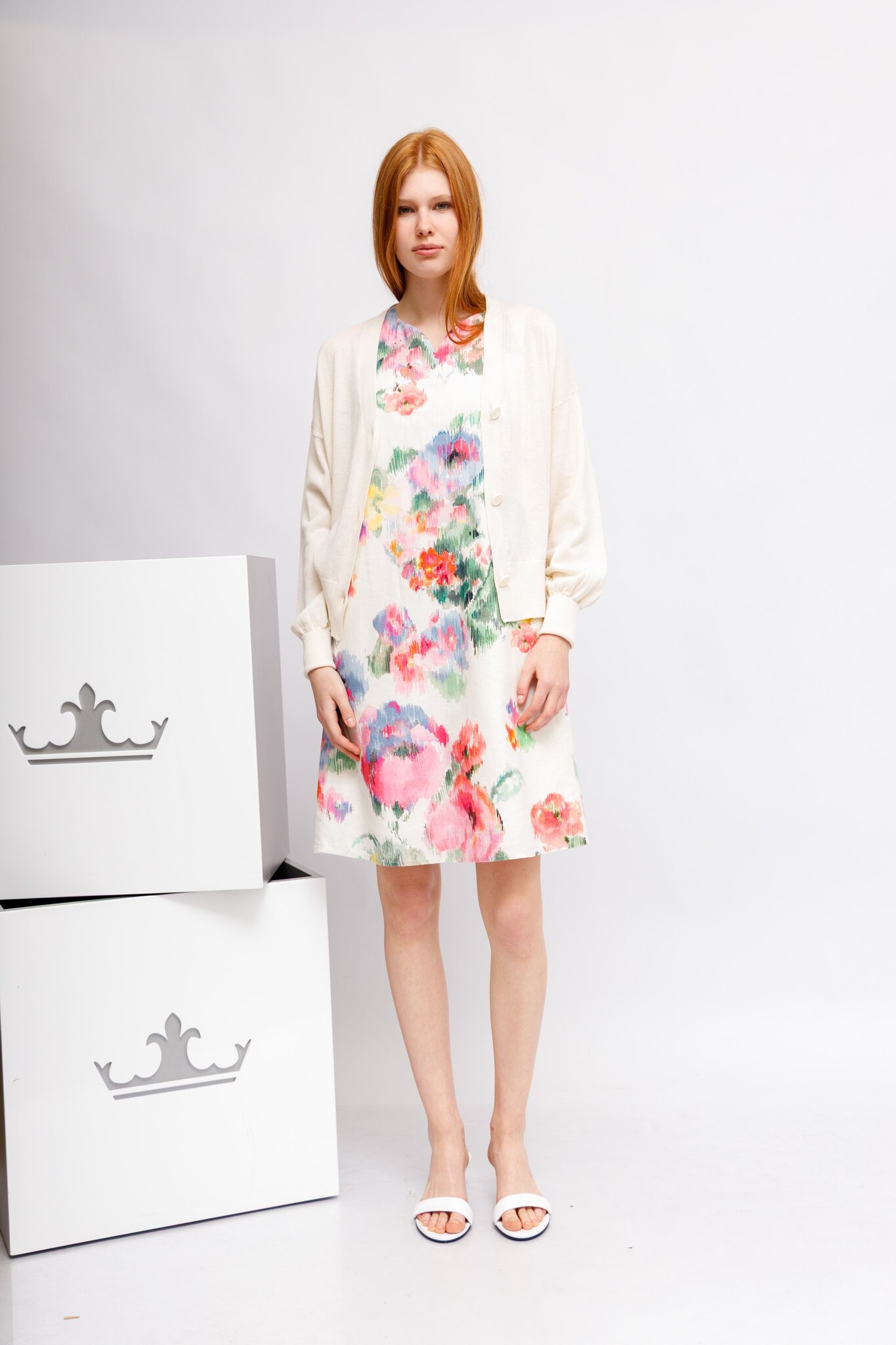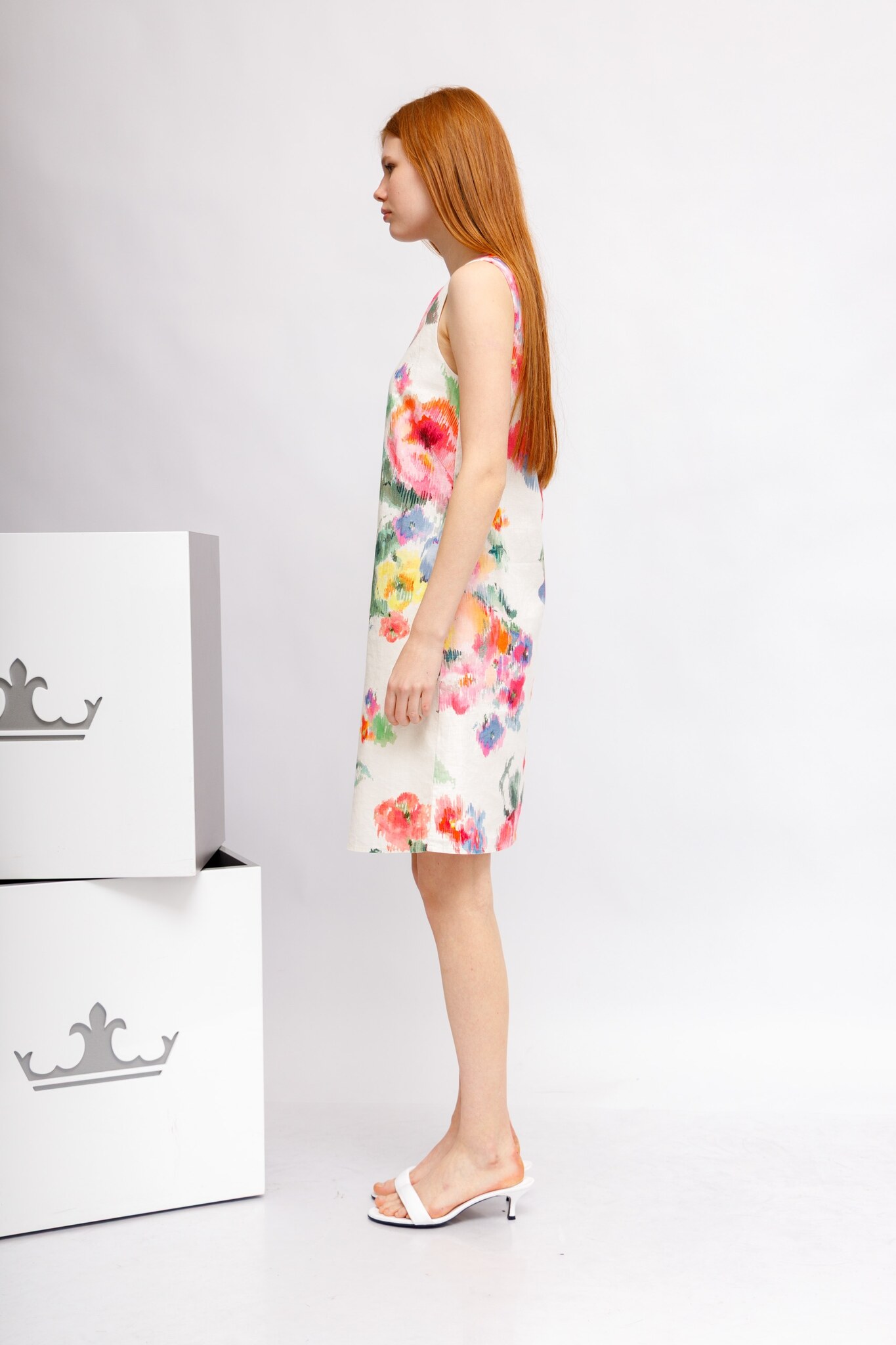 Высококачественная смесь льна и хлопка, сплошной принт — каждое изделие уникальноА-образный силуэт, длина до коленаЖенственный вырез с небольшим V-образным вырезомБесшовная молния сзадиБоковые карманыВ комплекте с хлопковой подкладкой