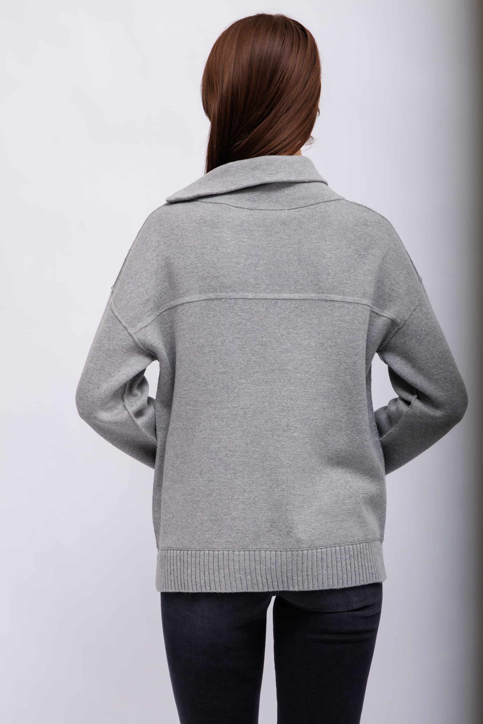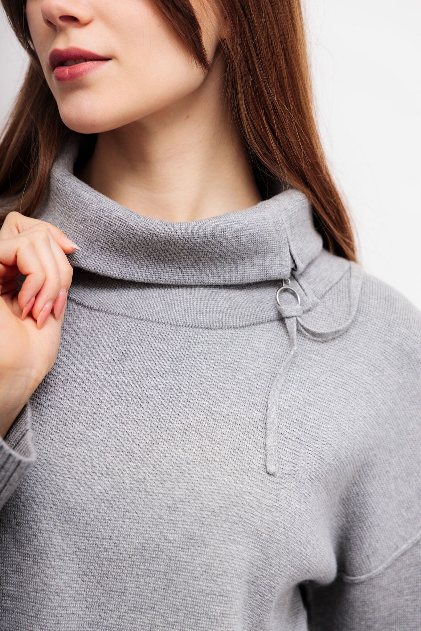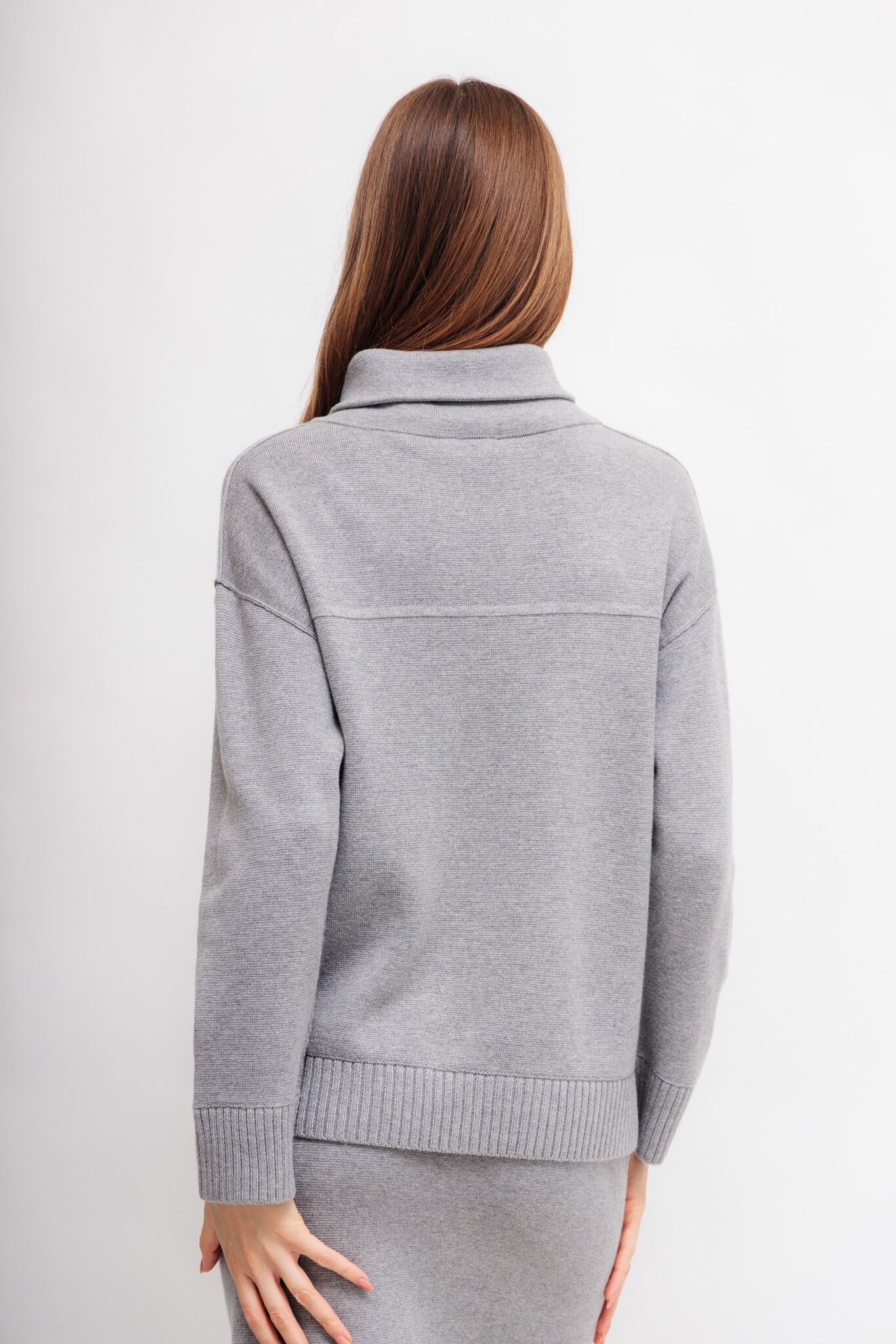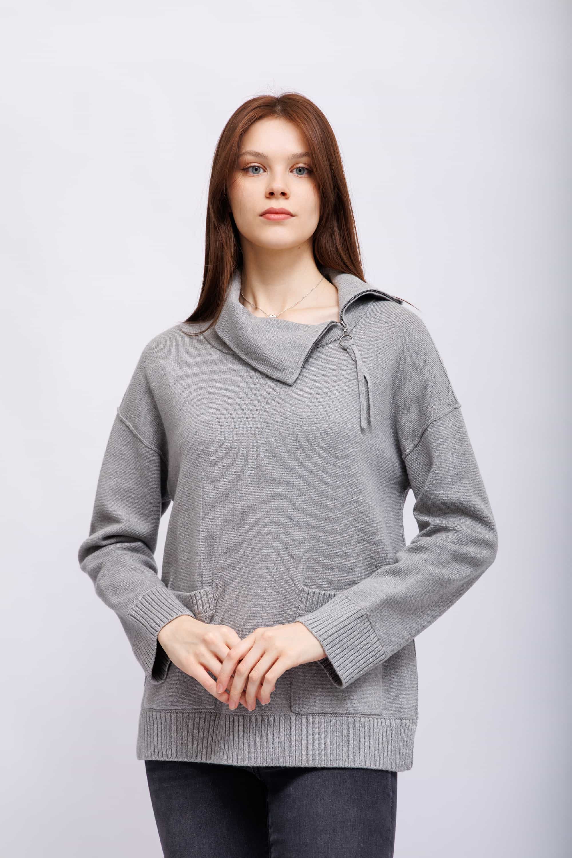 Свитер серыйВорот-стойка широкий с отворотом на молнииСпущенная линия плечРукава длинныеШирокий крой