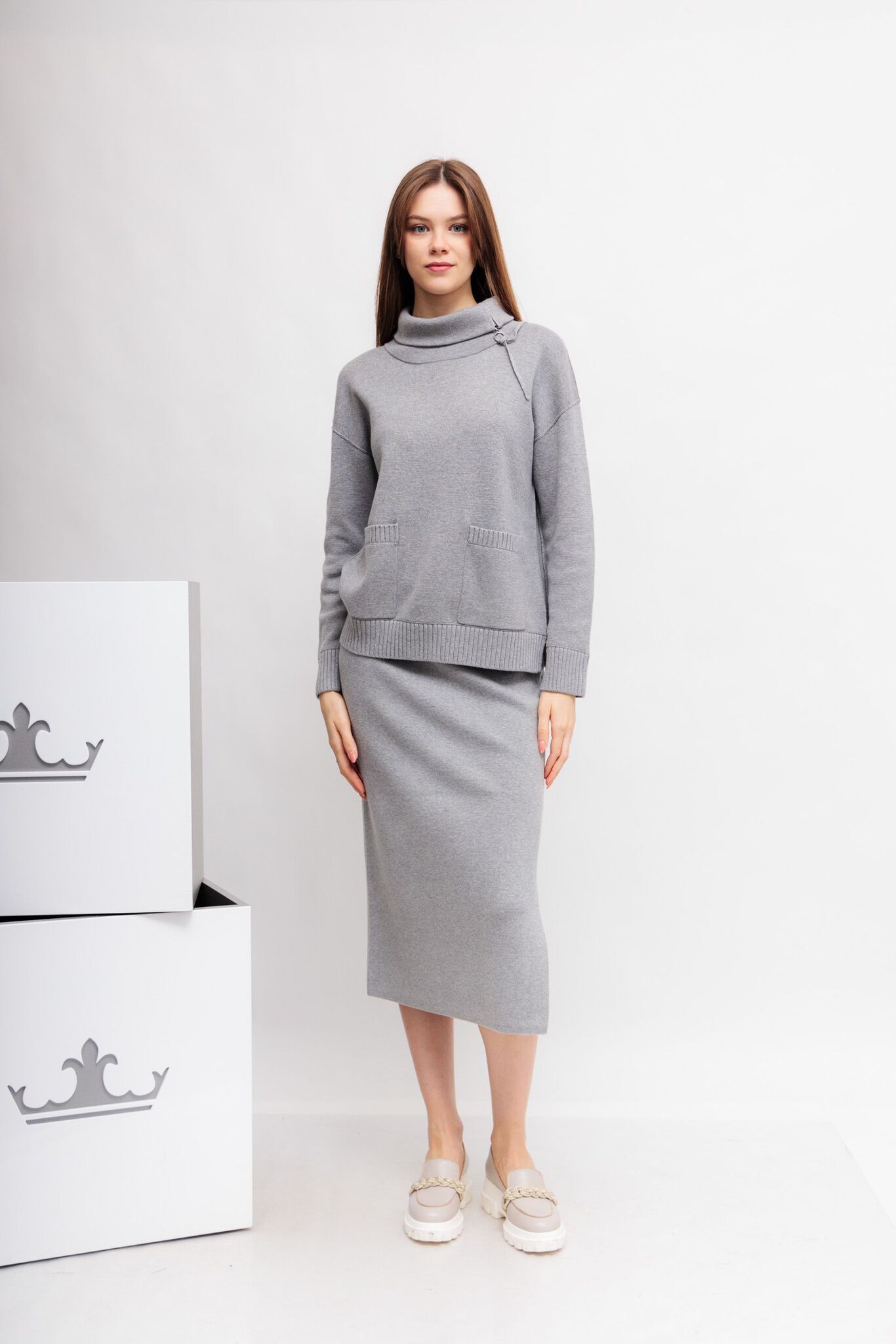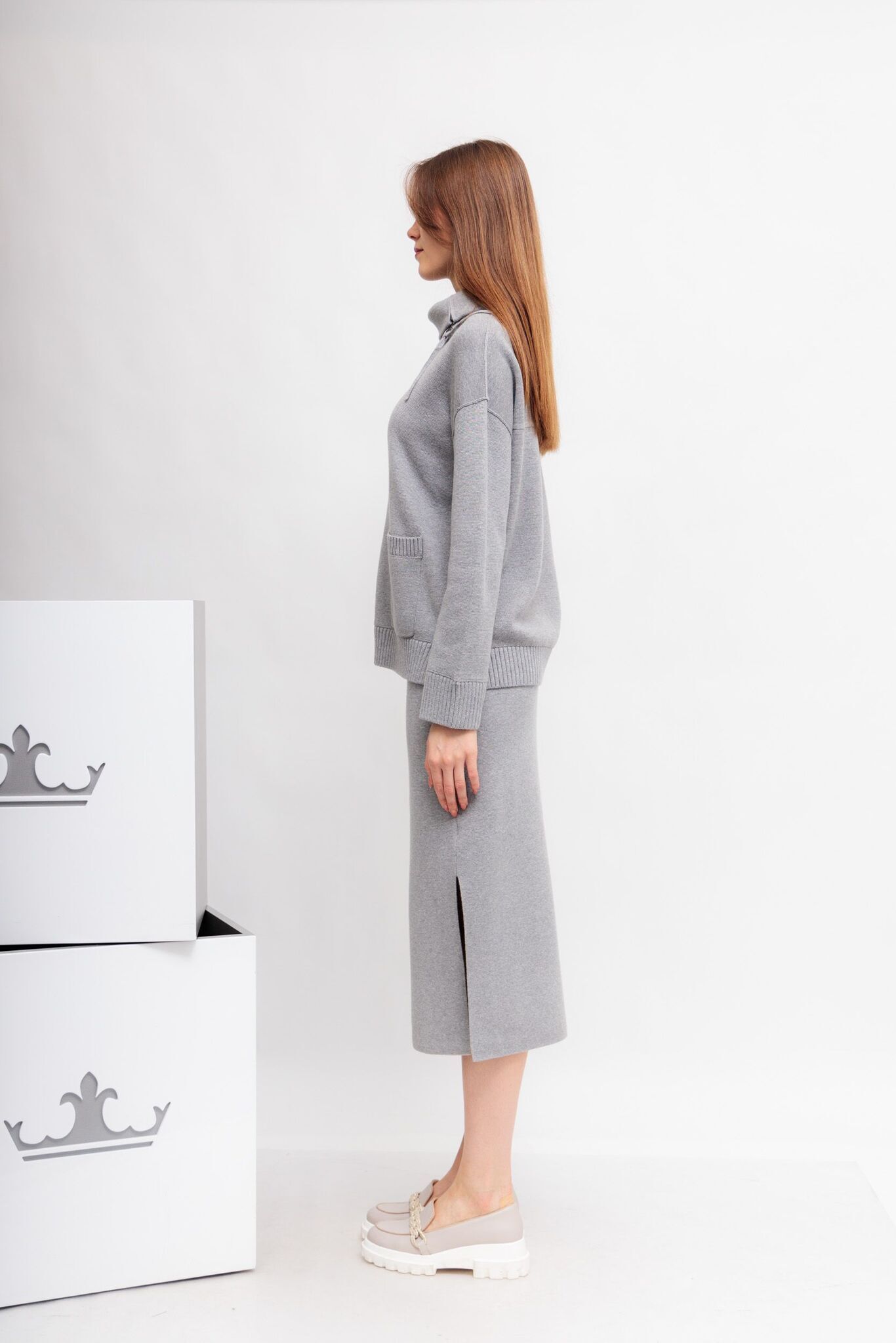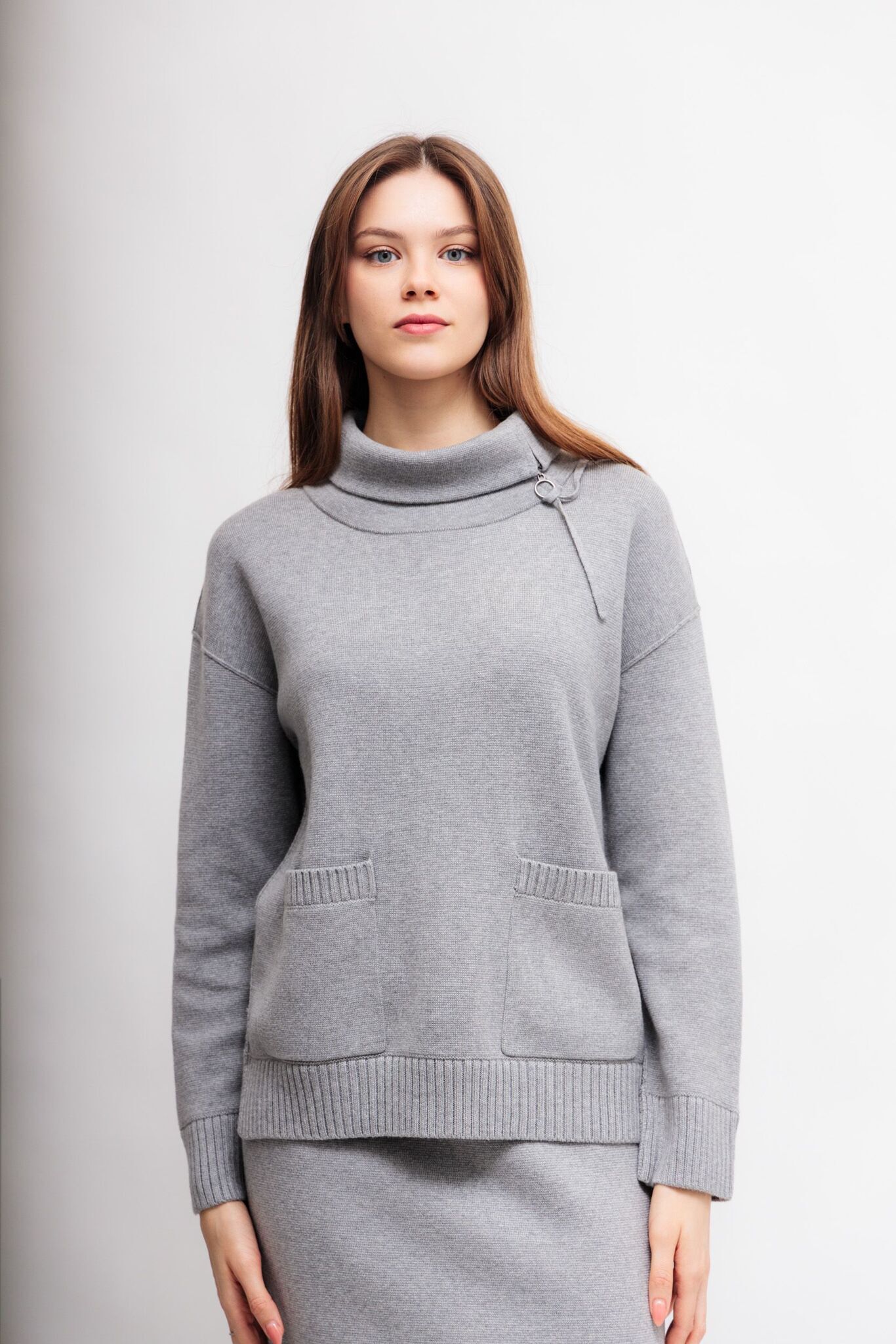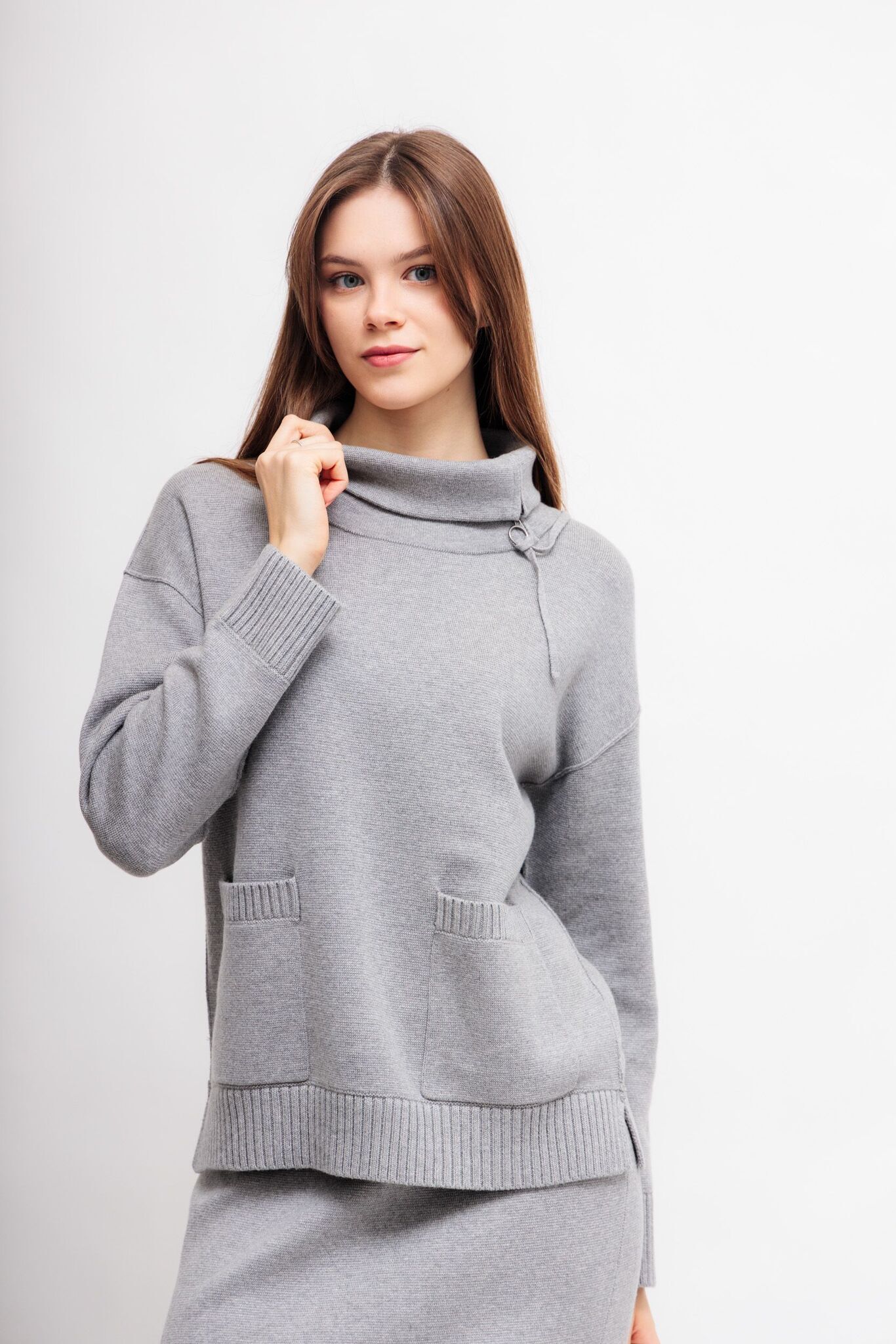 Свитер серыйВорот-стойка широкий с отворотом на молнииСпущенная линия плечРукава длинныеШирокий крой