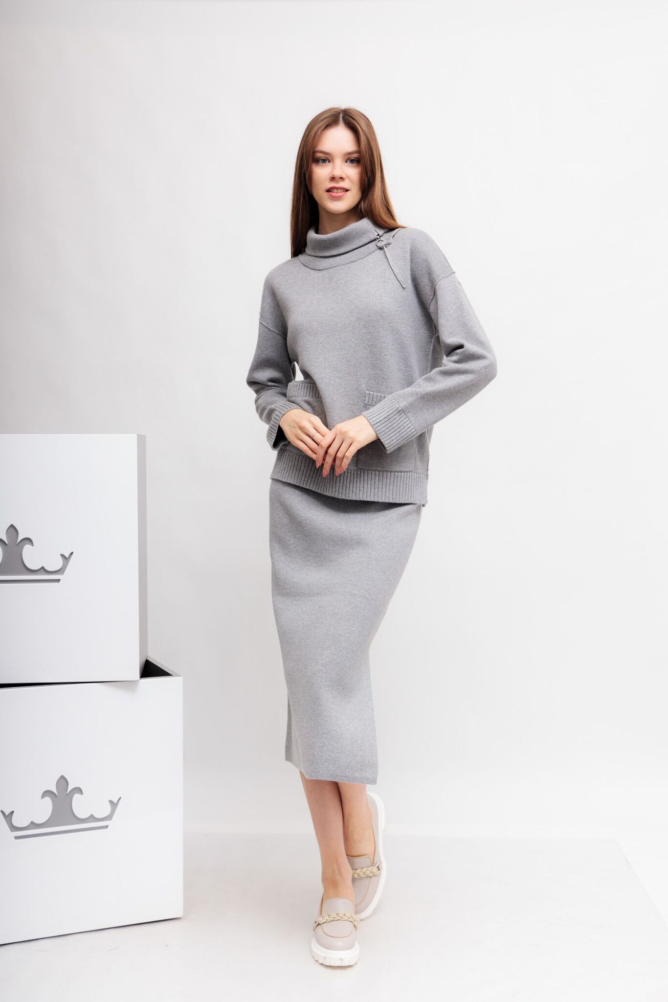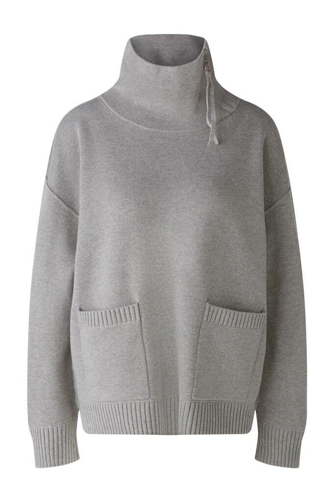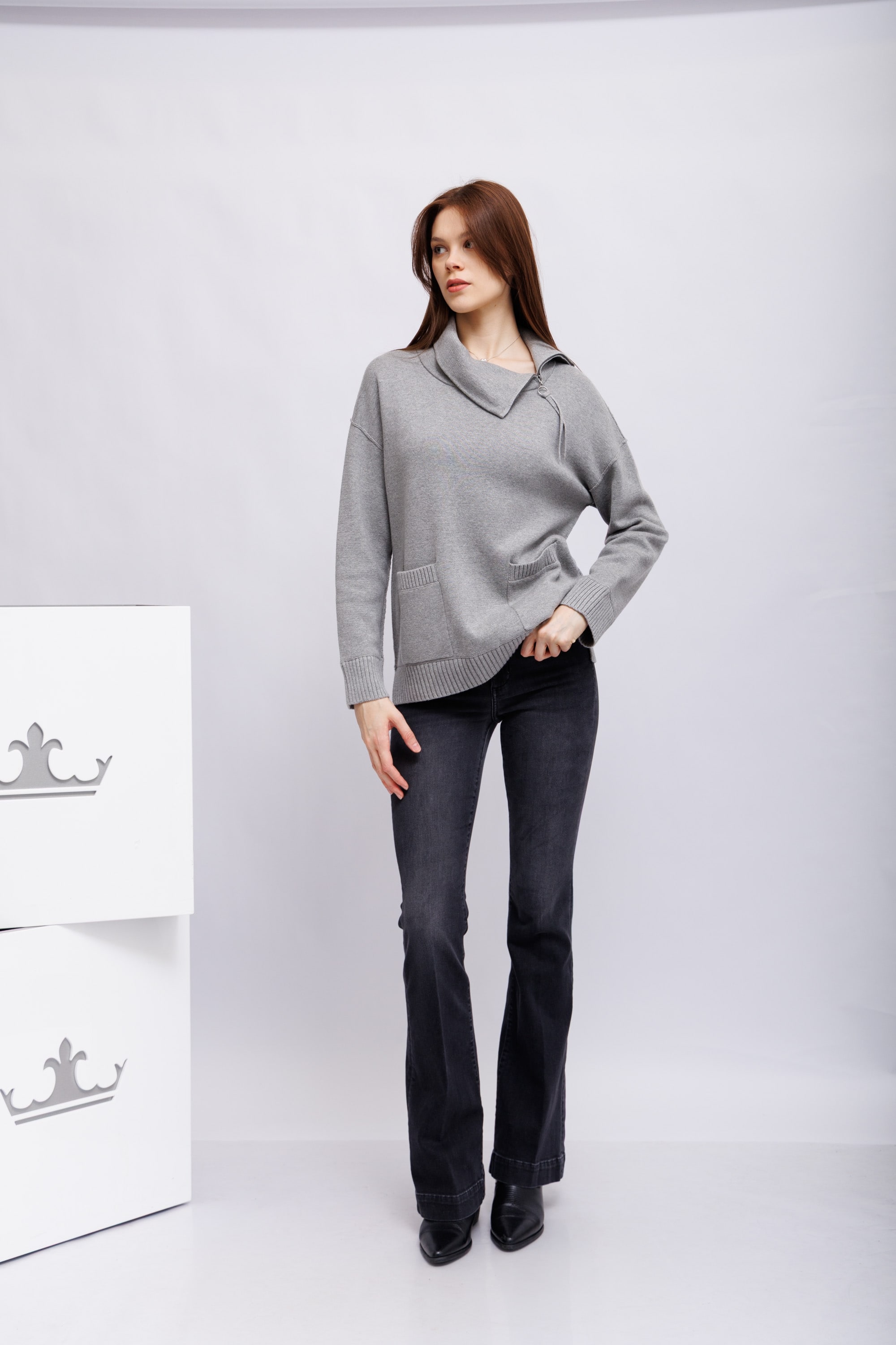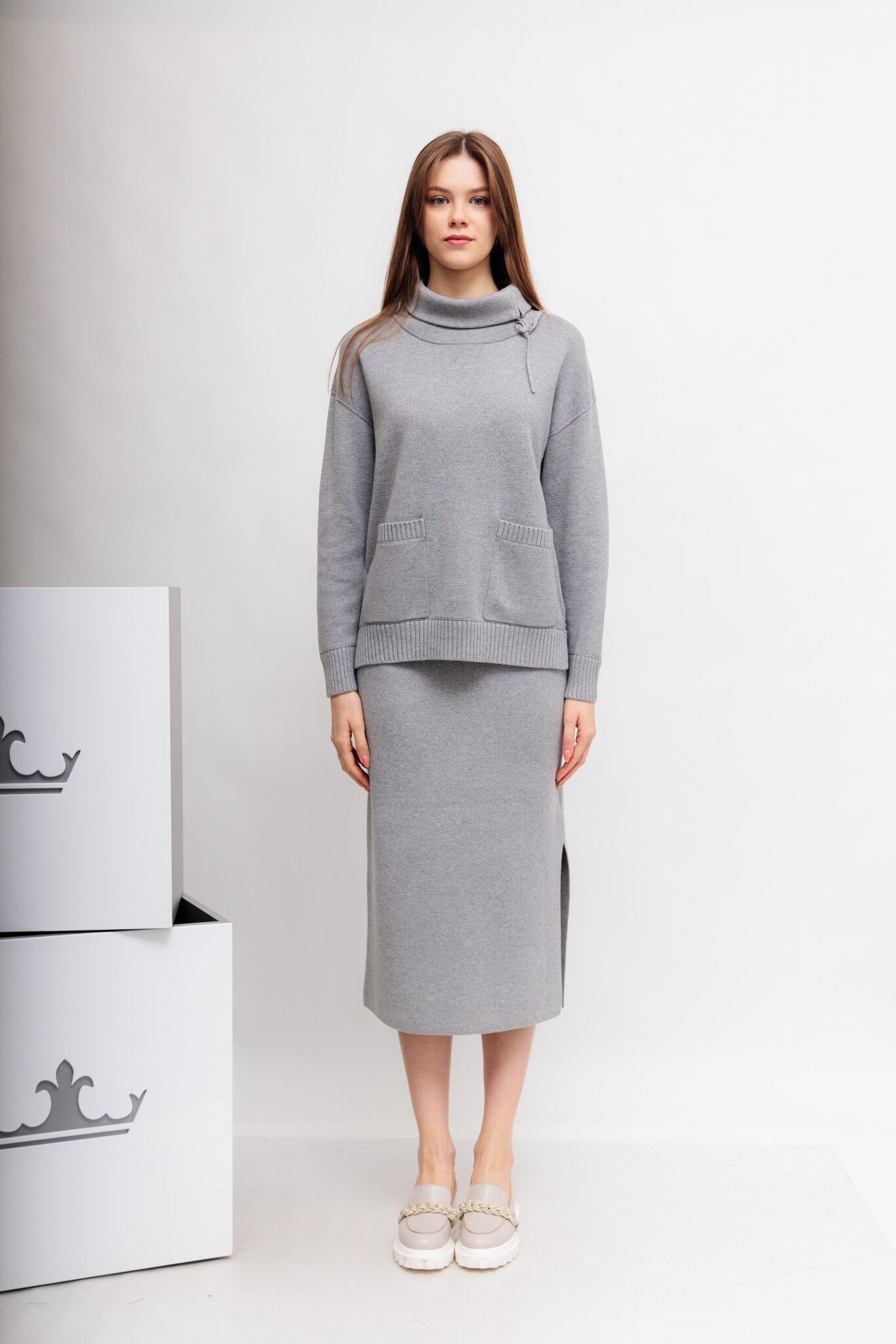 Свитер серыйВорот-стойка широкий с отворотом на молнииСпущенная линия плечРукава длинныеШирокий крой