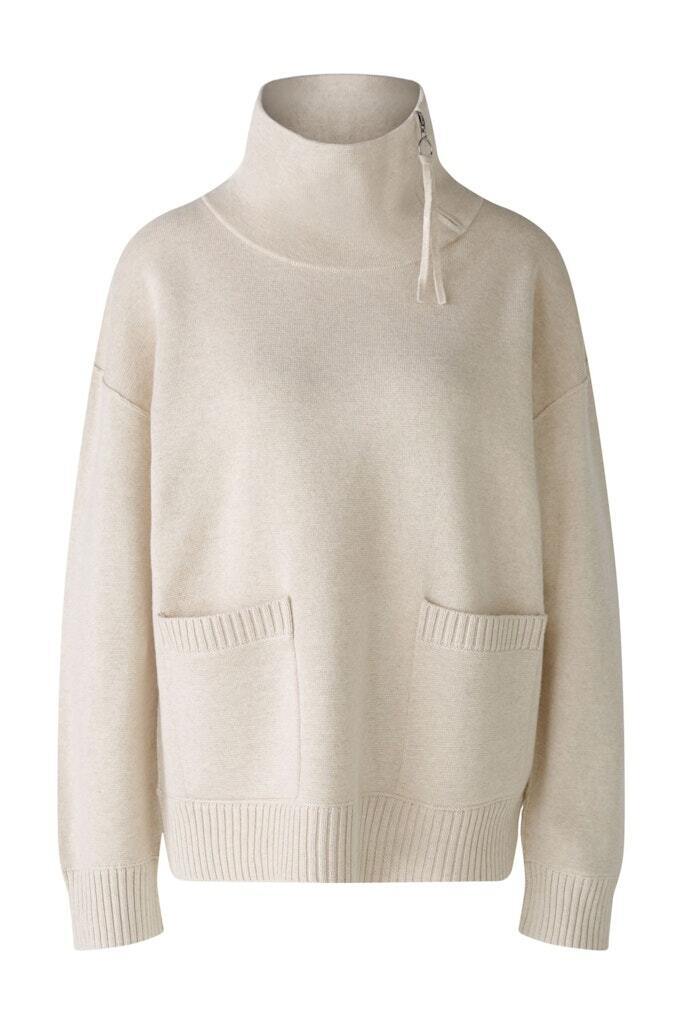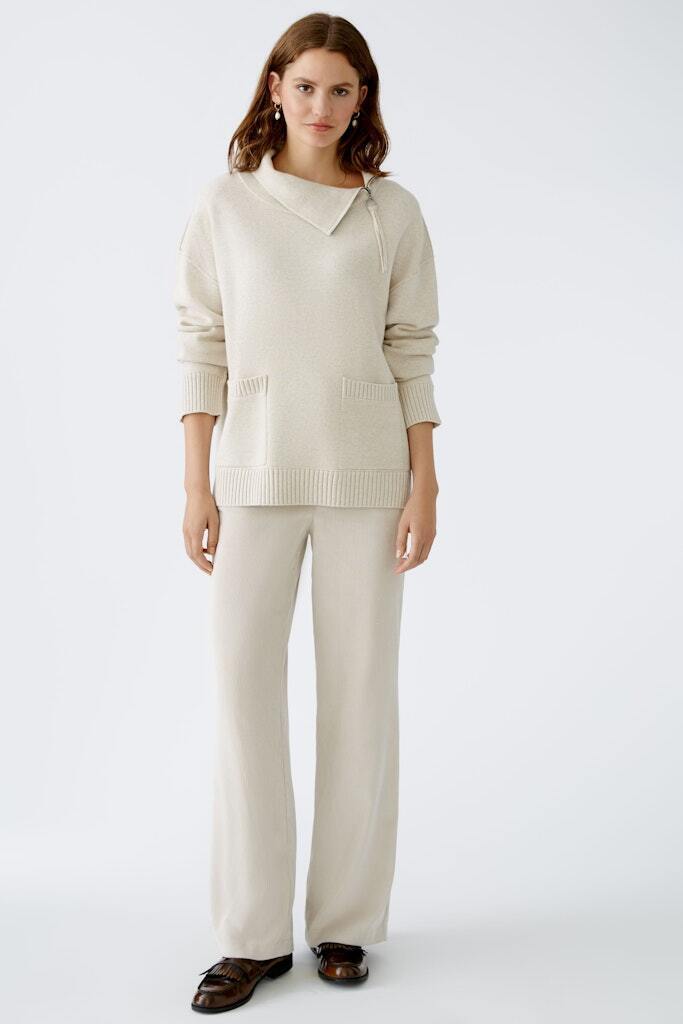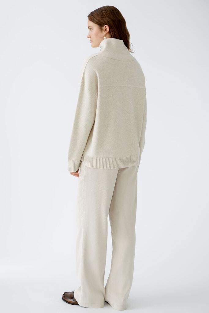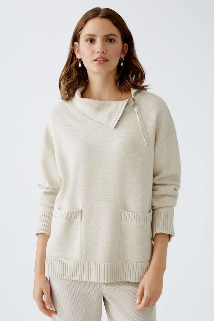 Джемпер молочно-бежевый Ворот-стойка широкий с отворотом на молнииСпущенная линия плечРукава длинныеШирокий крой
