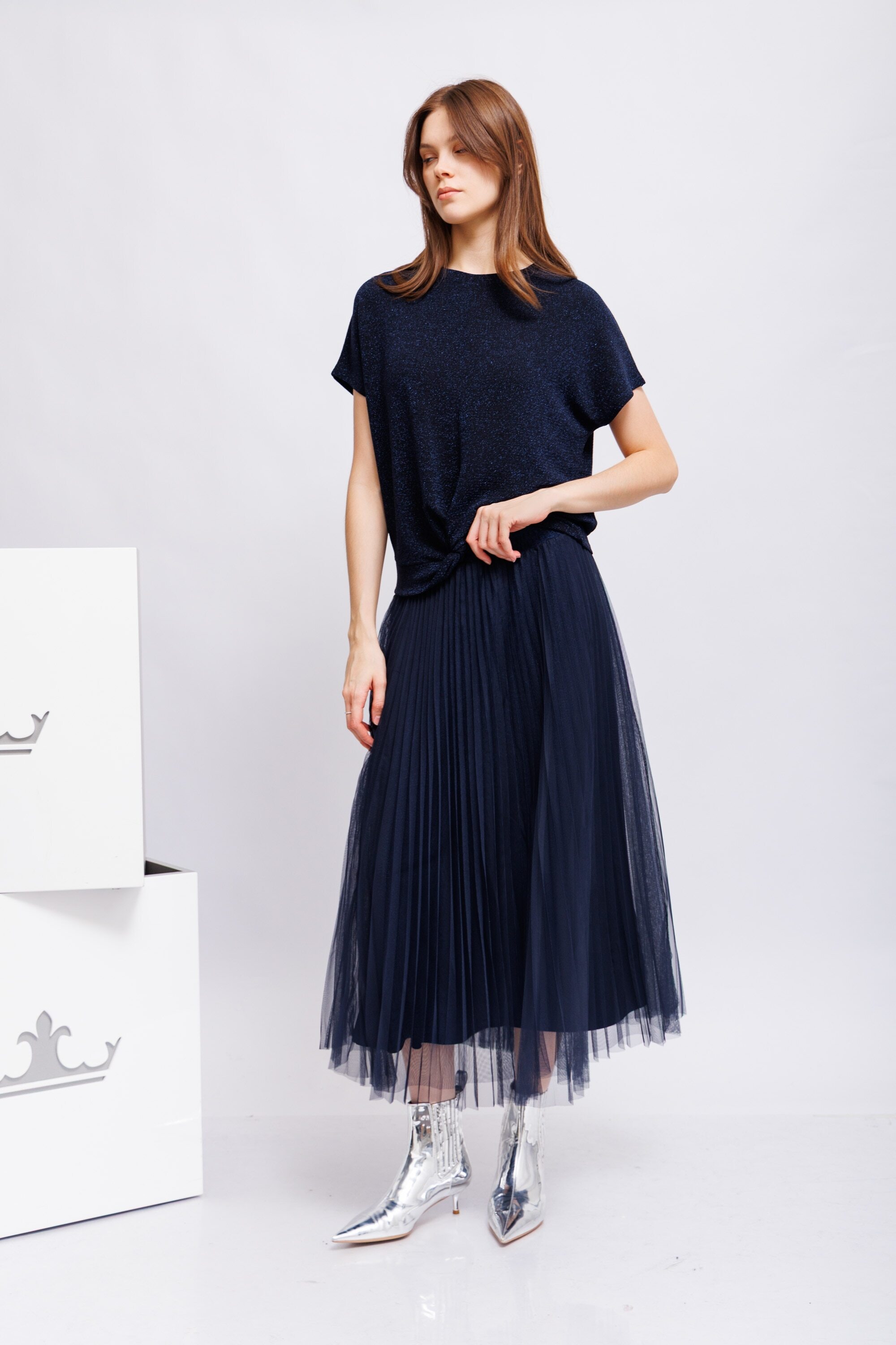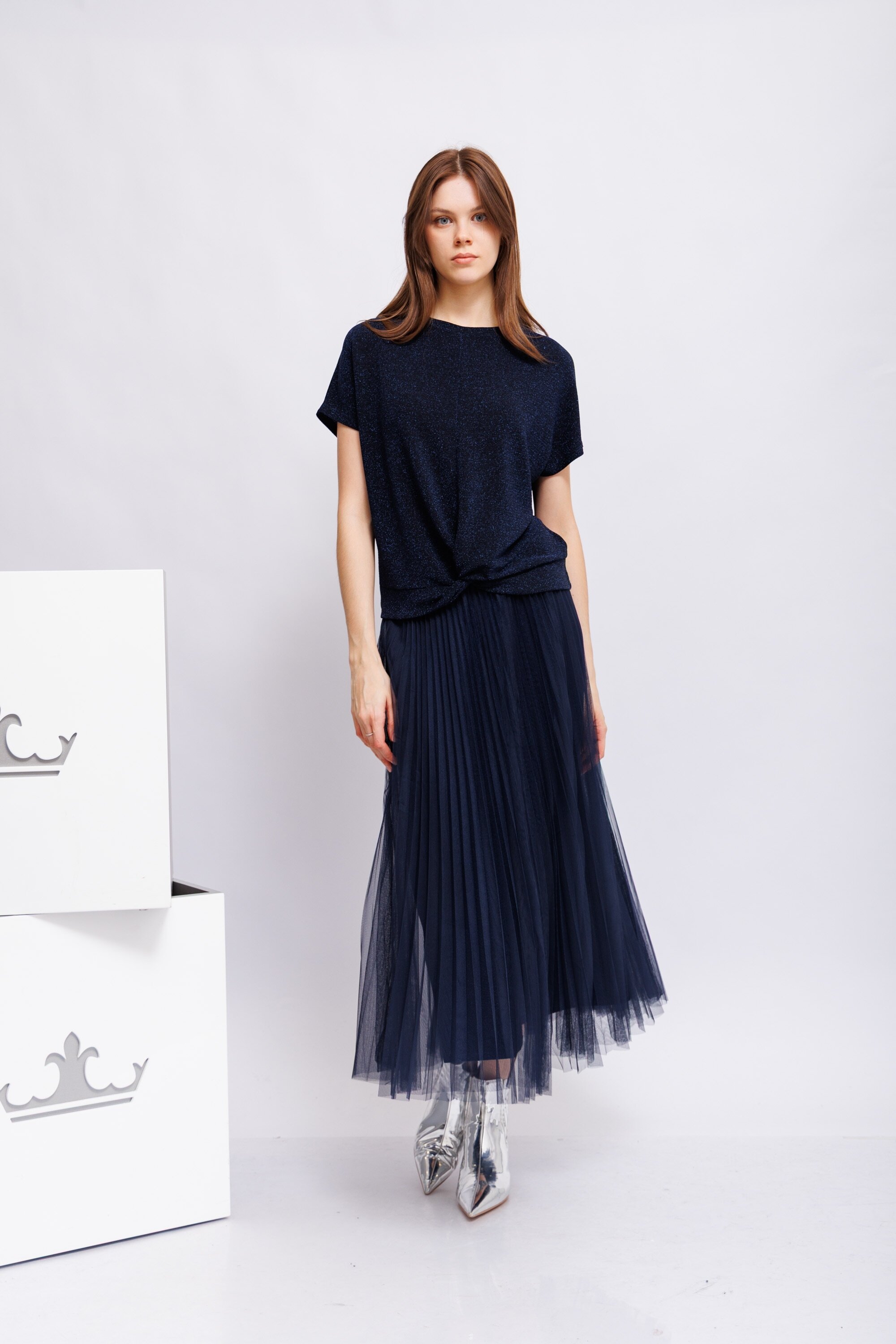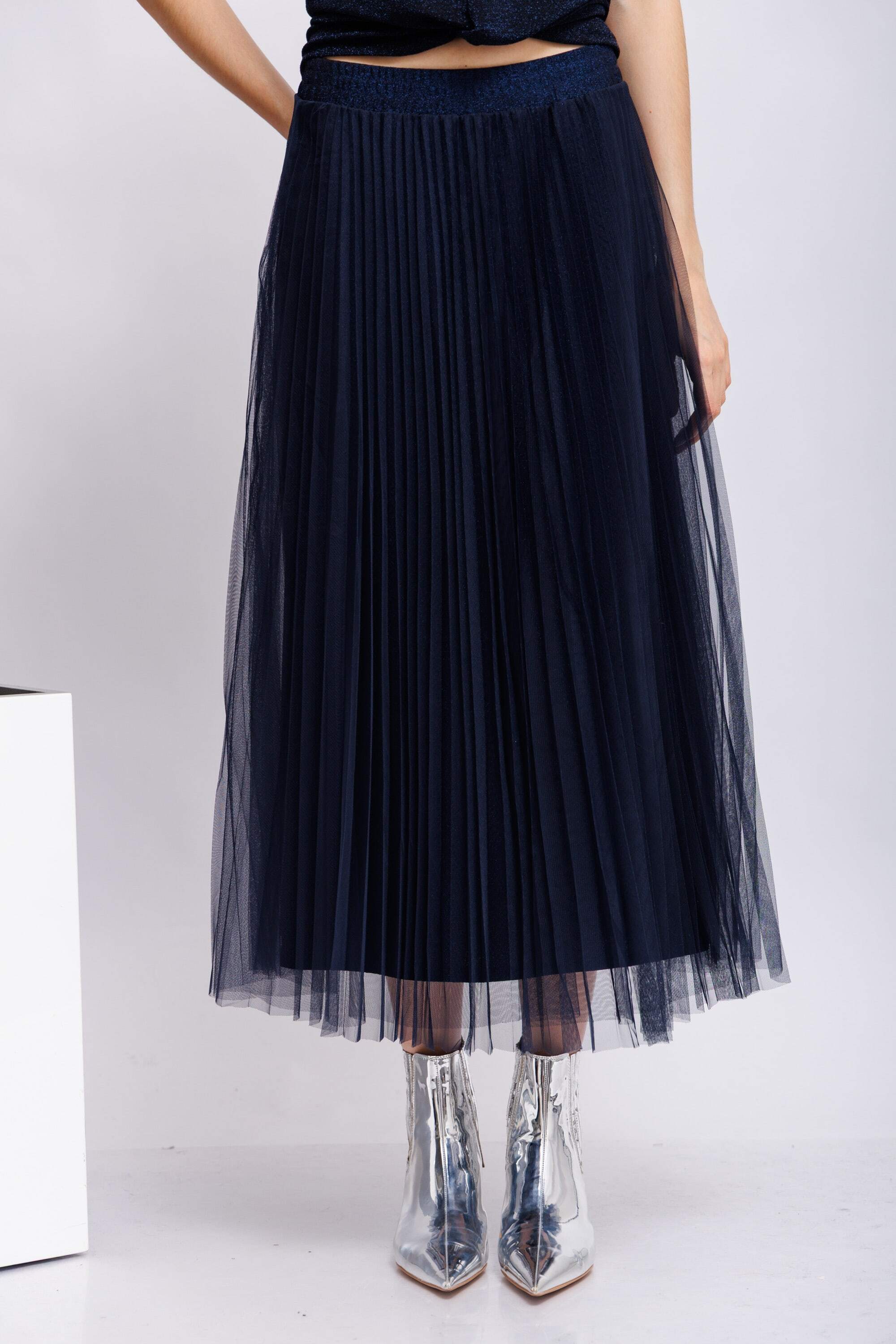 Юбка- плиссе с двойным фатином и мерцающей нижней юбкой из мягкого трикотажа с блестящей пряжей.