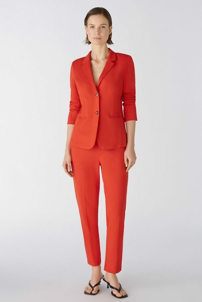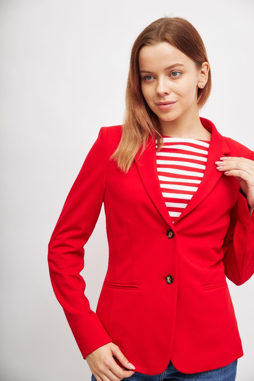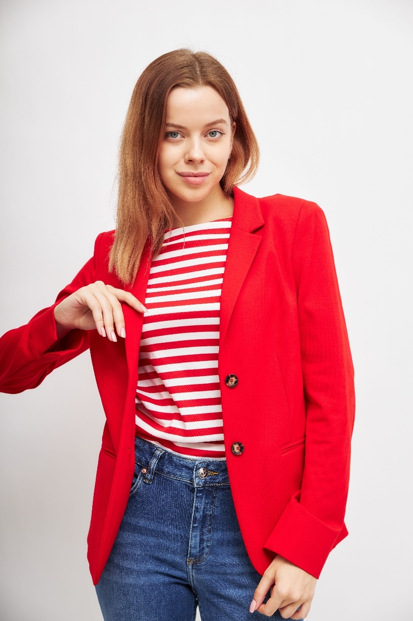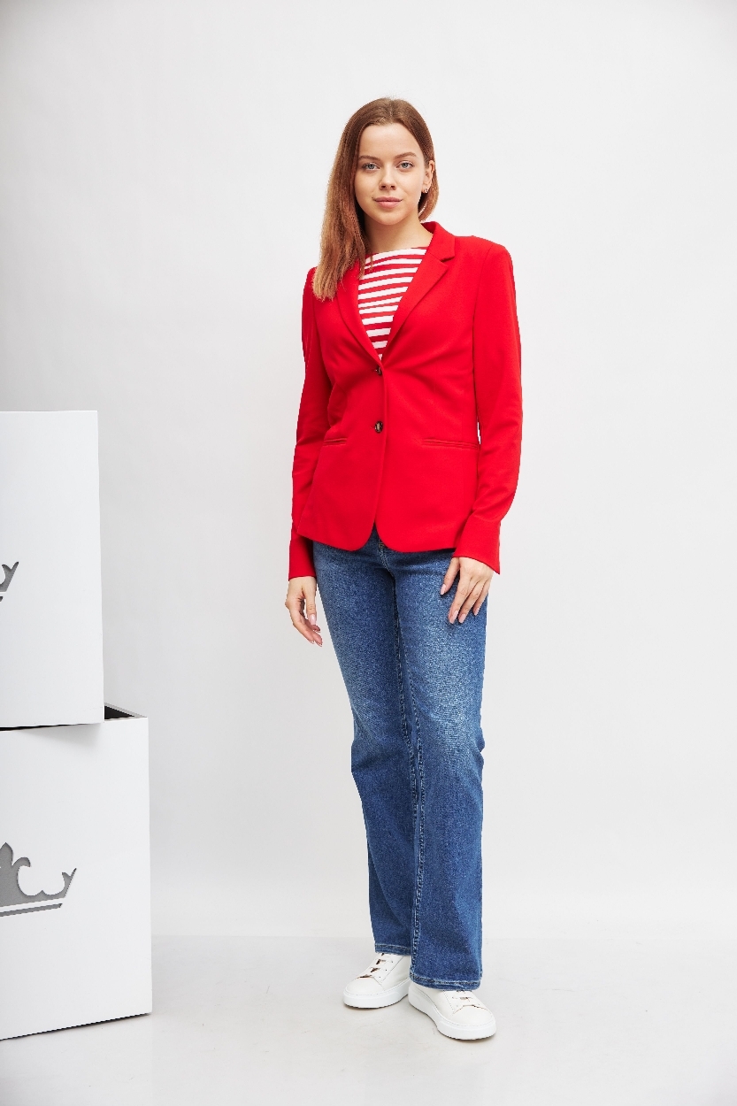 Жакет огненно-красного цветаСлегка приталенный кройЛацканы классические2 контрастные пуговицы2 шлицыКарманы -листочкиНа длинных рукавах- разрезыБез подклада