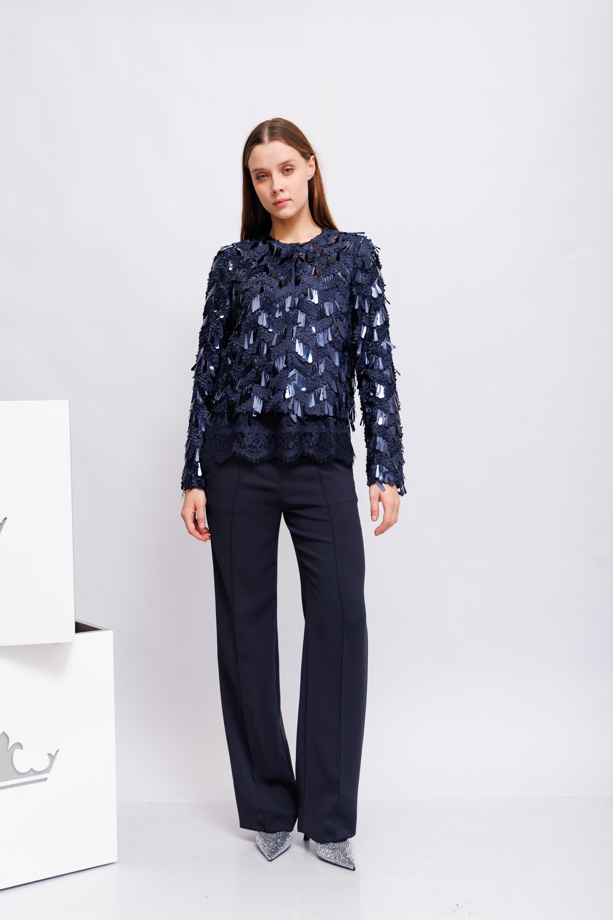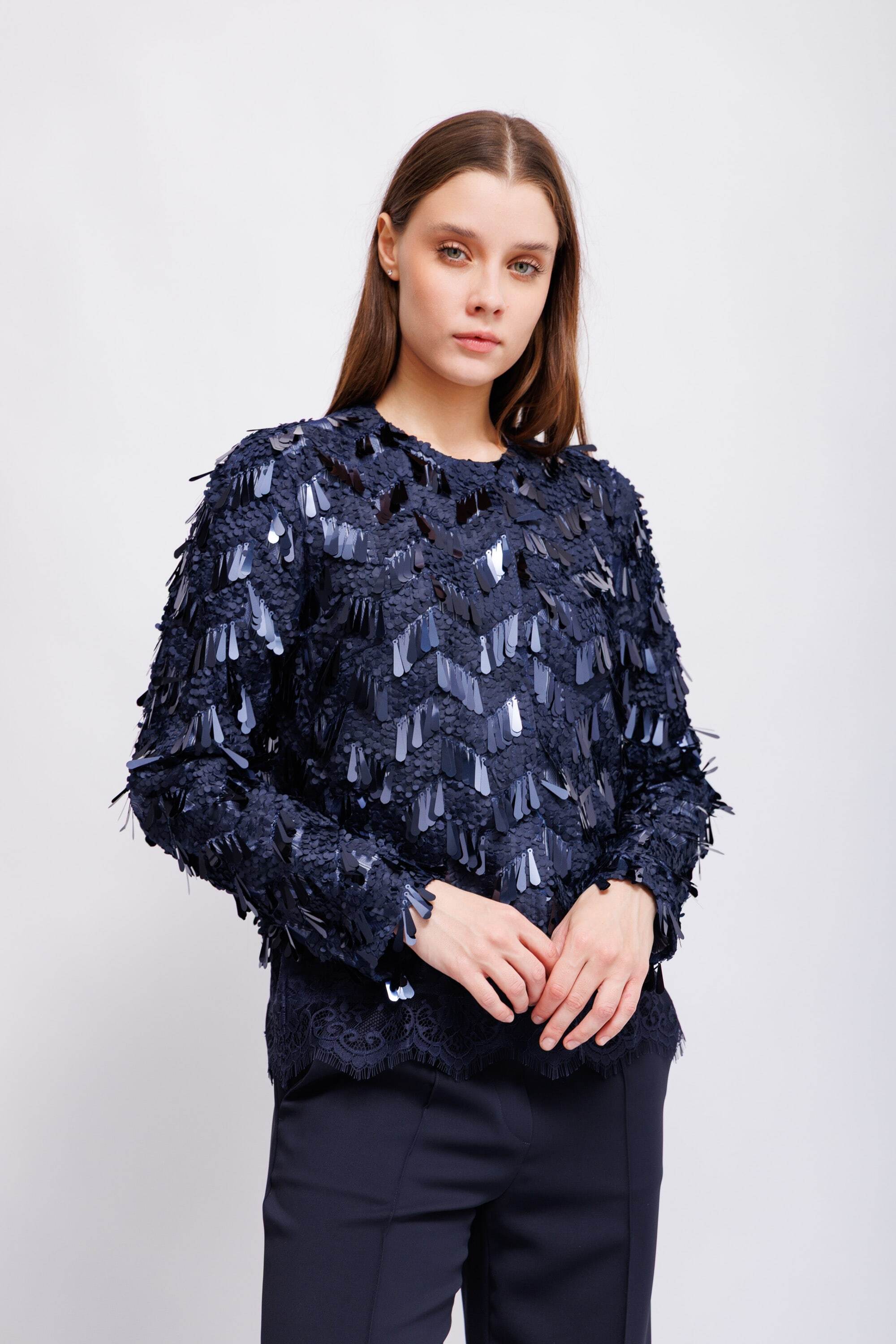 • Нежная сетка высокого качества, украшенная чередующимися матовыми круглыми и блестящими длинными пайетками.