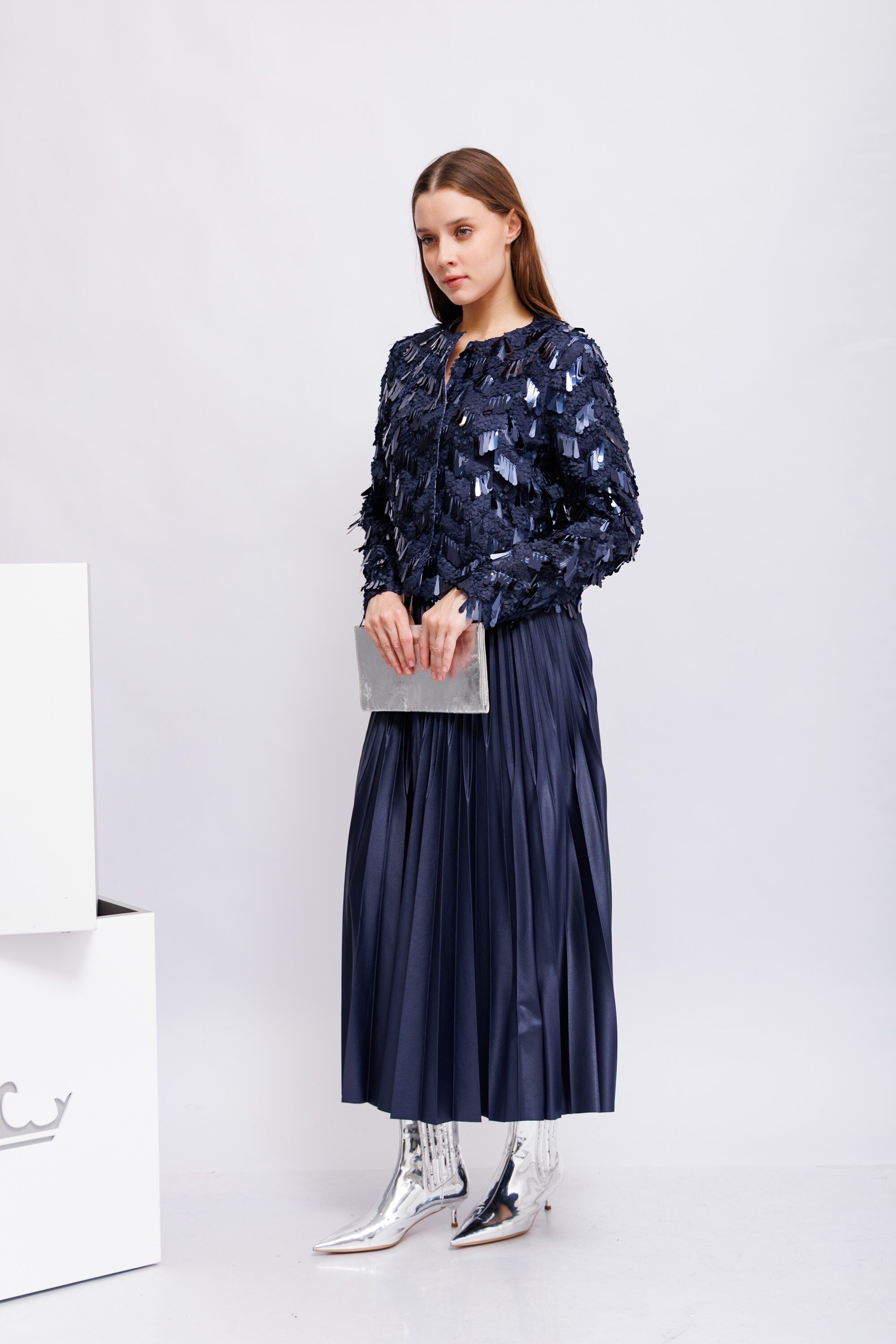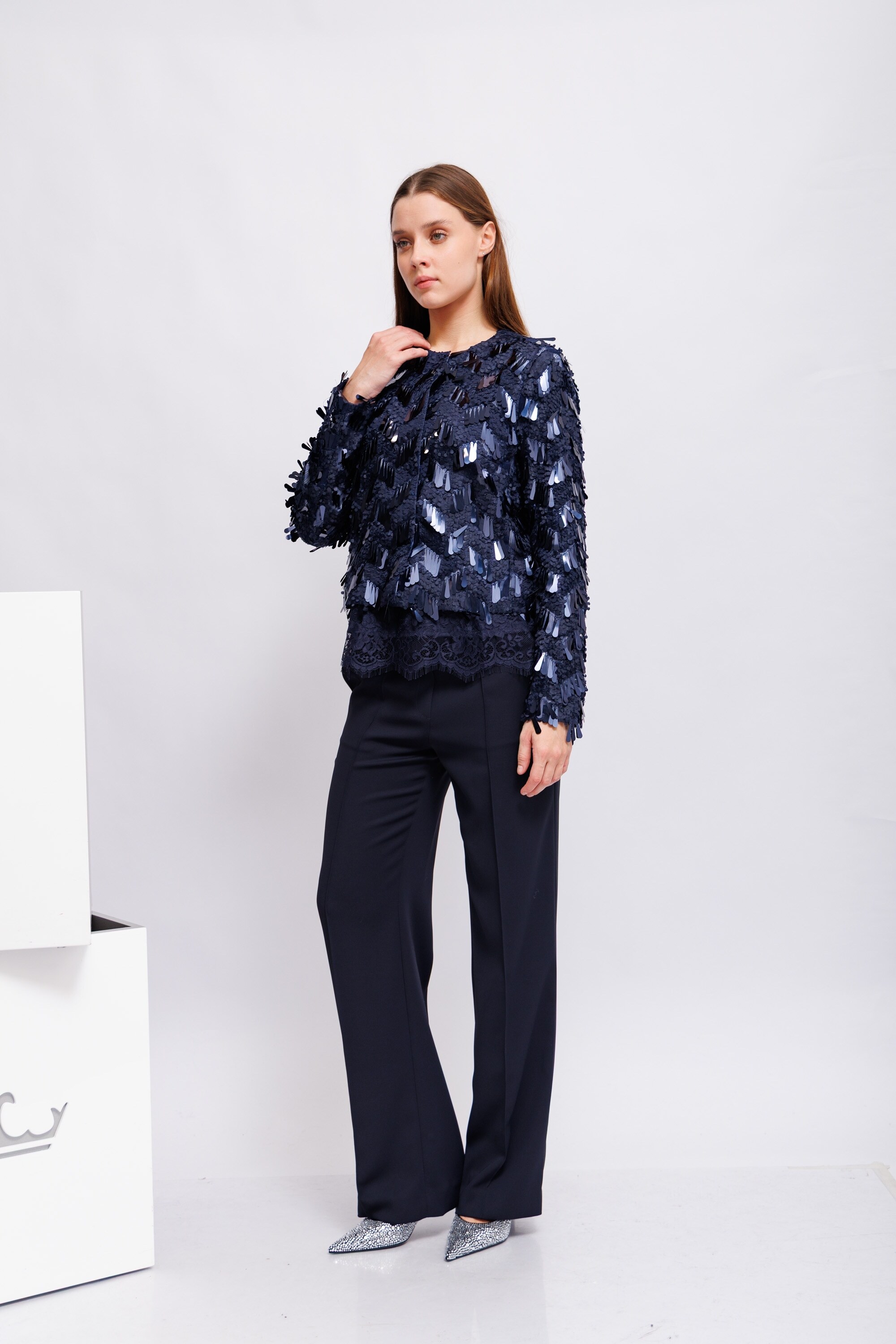 Жакет темно-синий с интересным контрастом матовых и глянцевых пайеток
