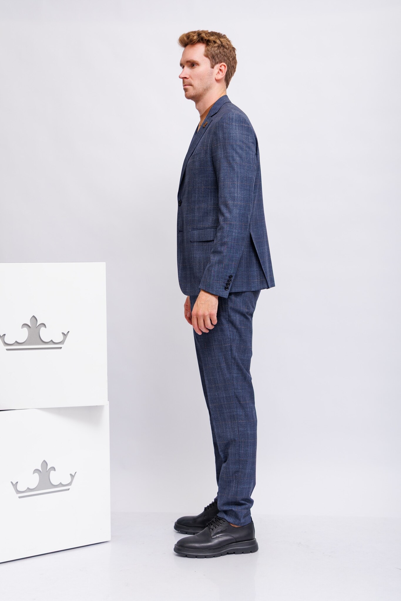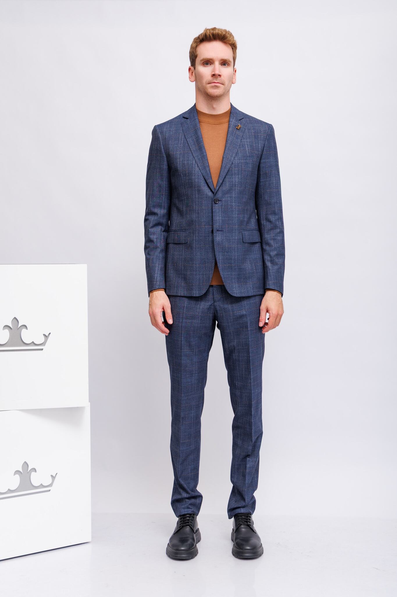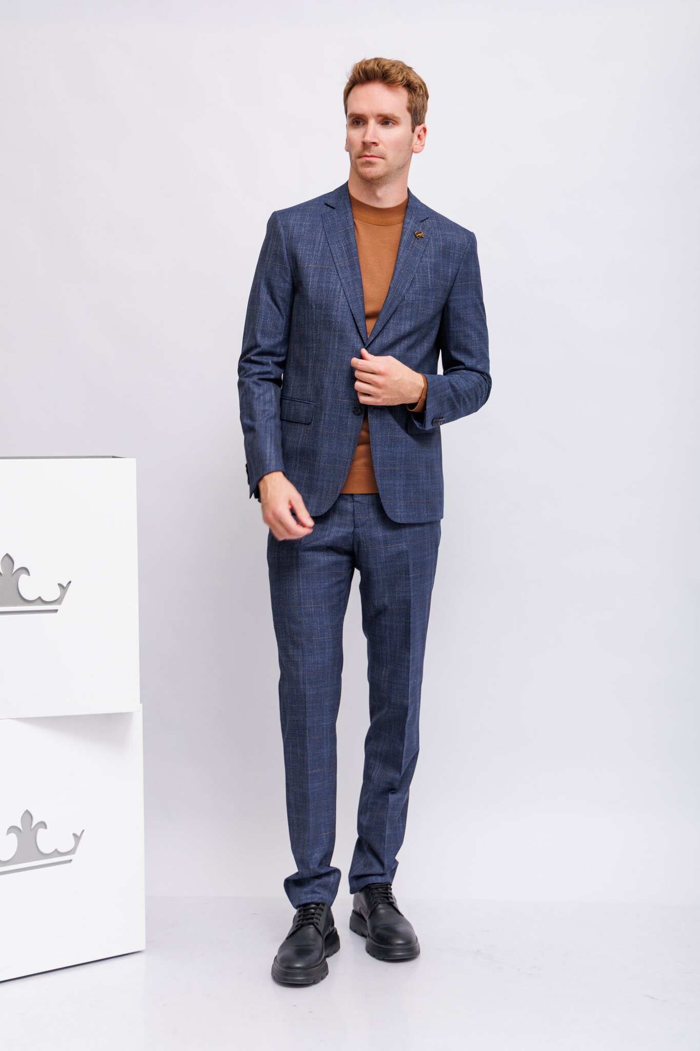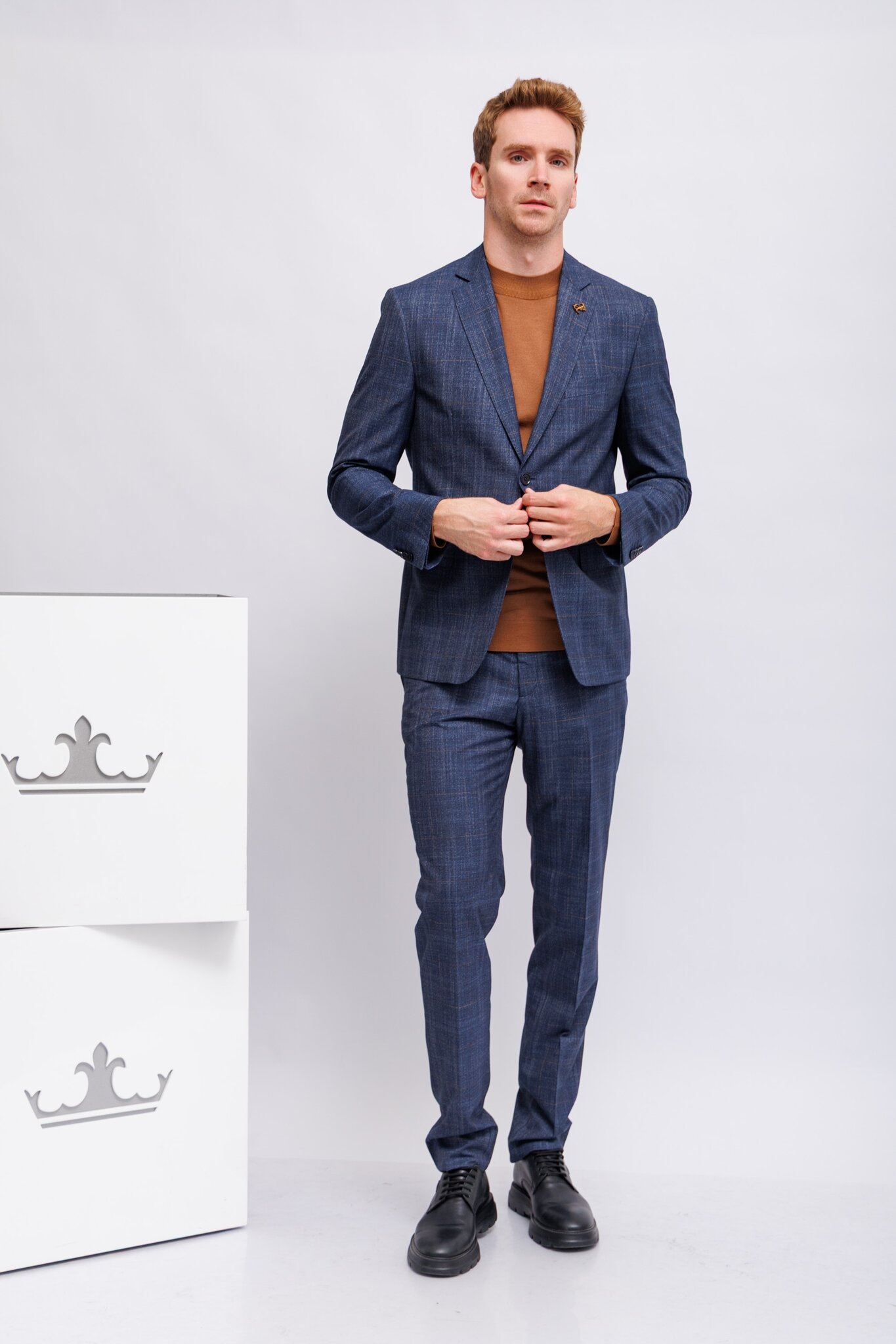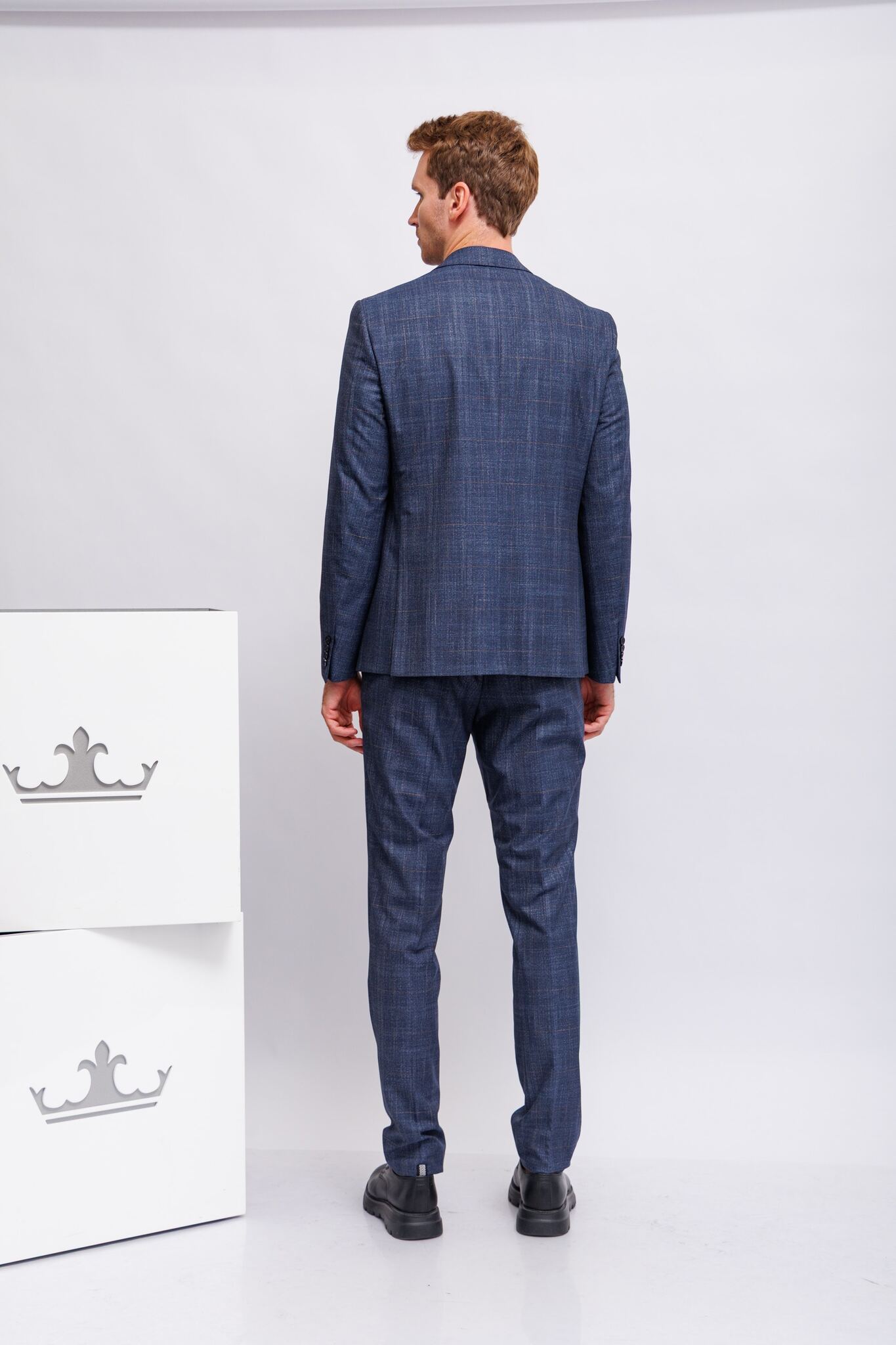 Костюм прямого кроя синего цвета с эффектом меланж в тонкую бежевую клетку
