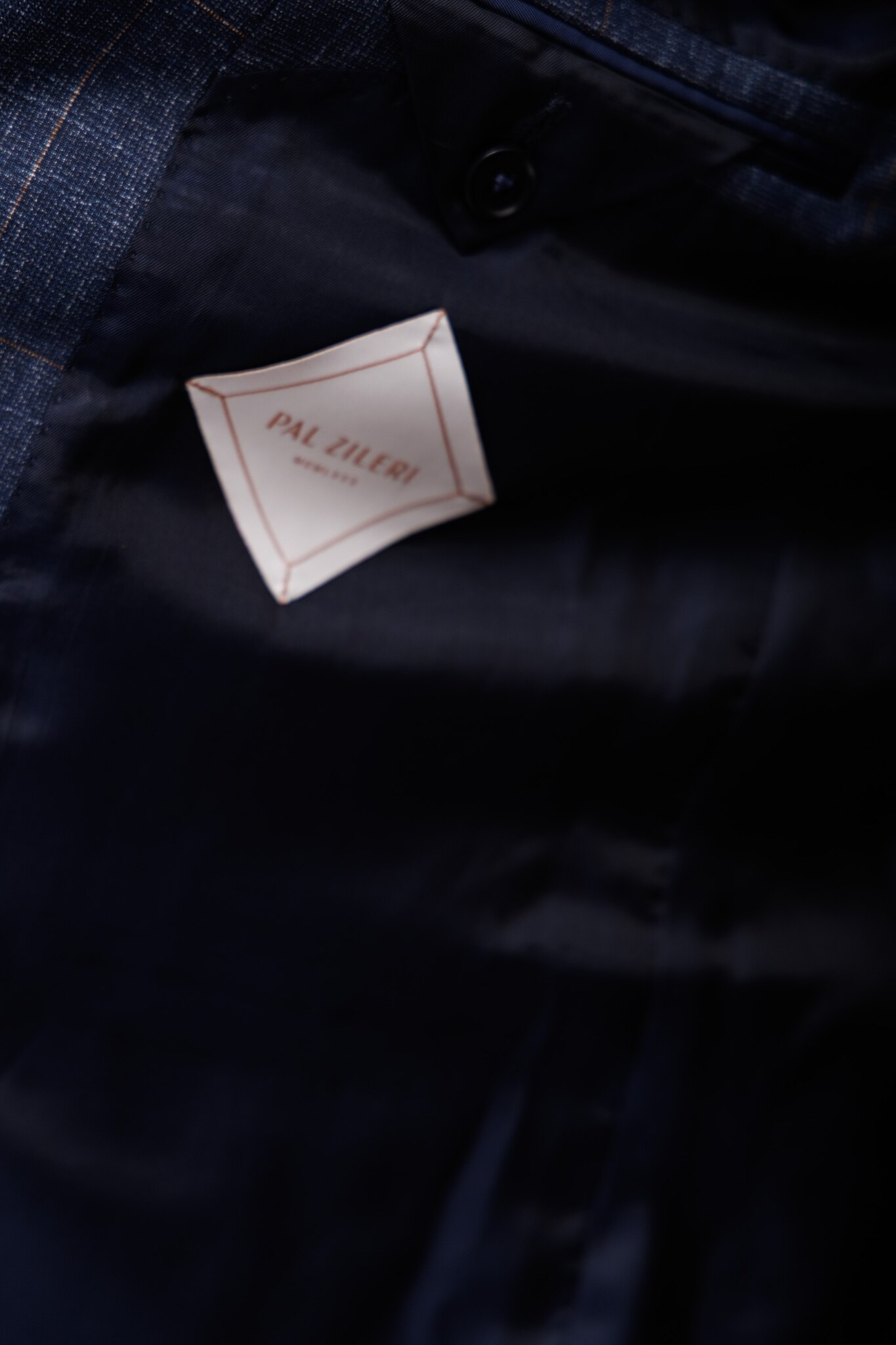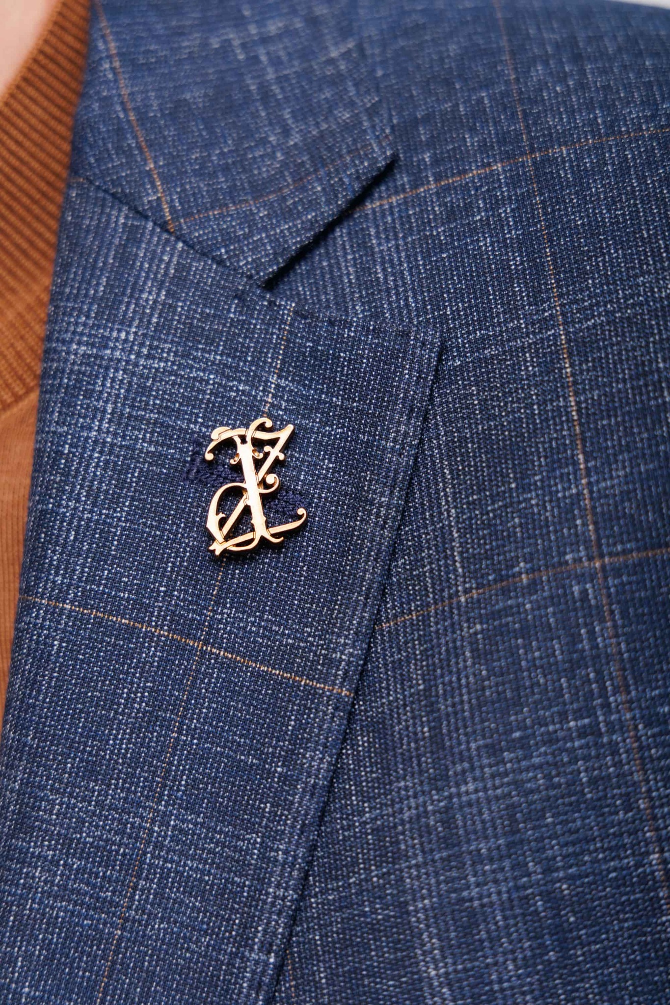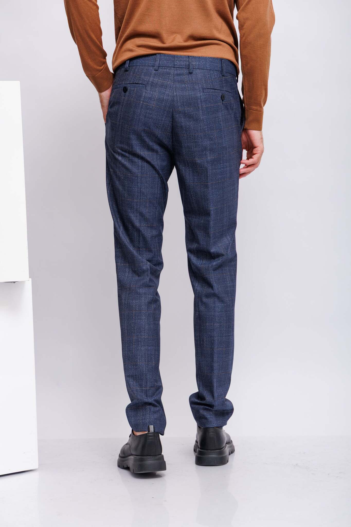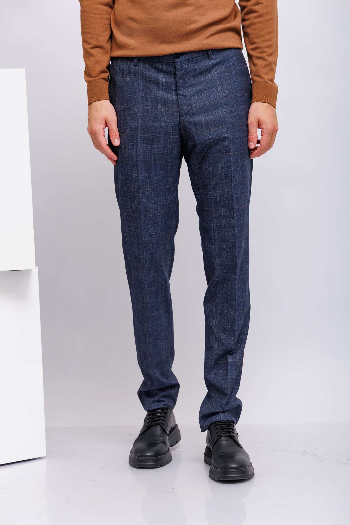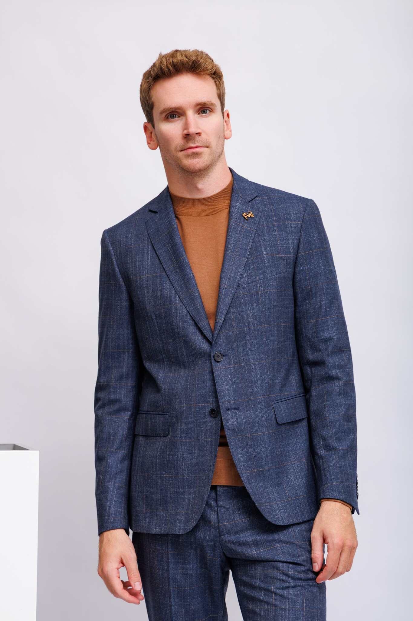 Костюм прямого кроя синего цвета с эффектом меланж в тонкую бежевую клетку