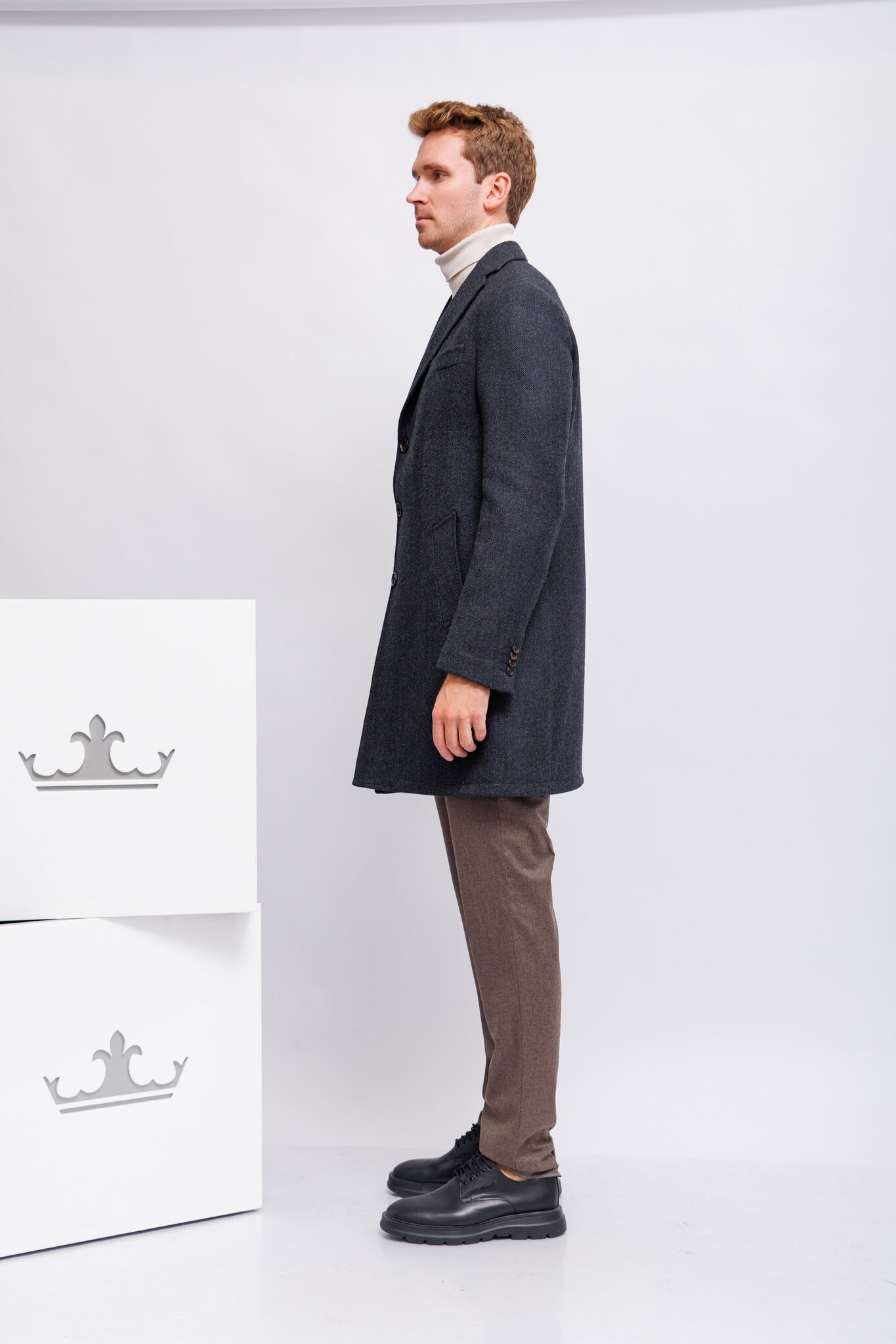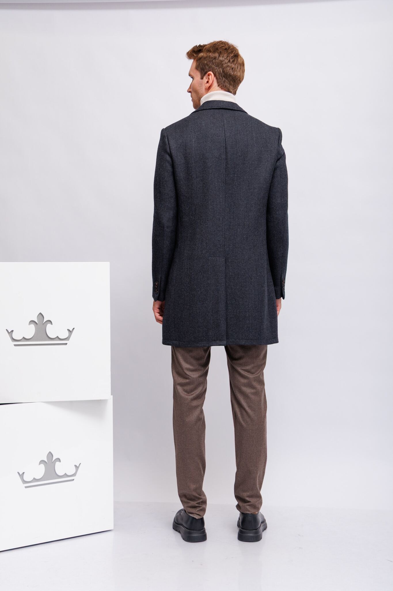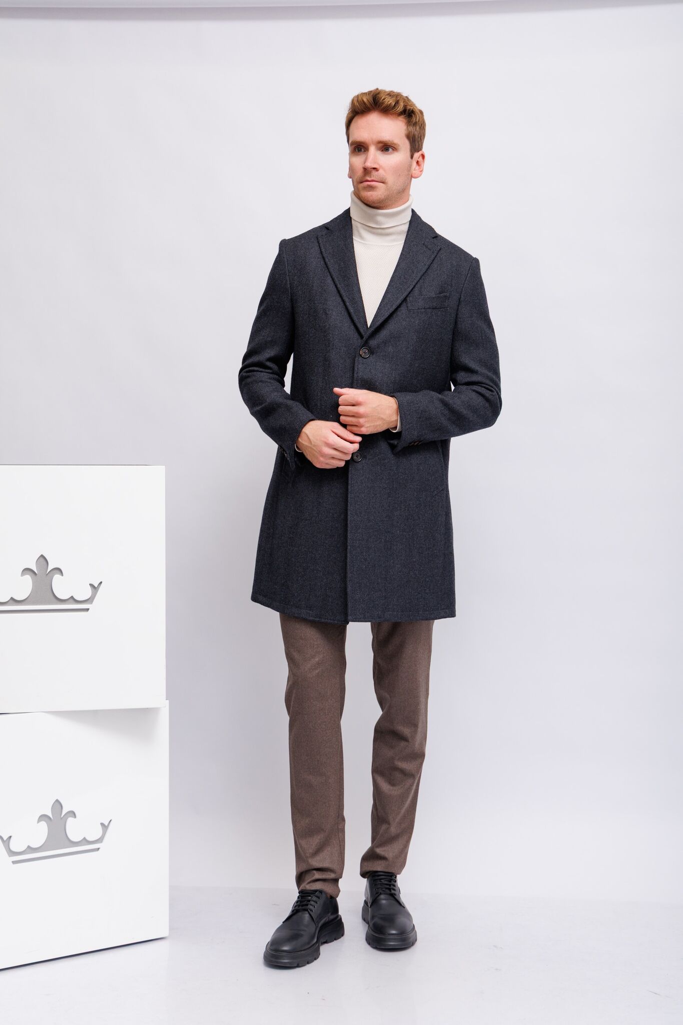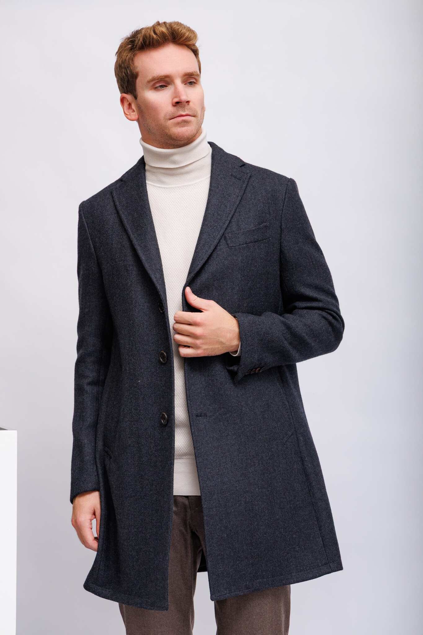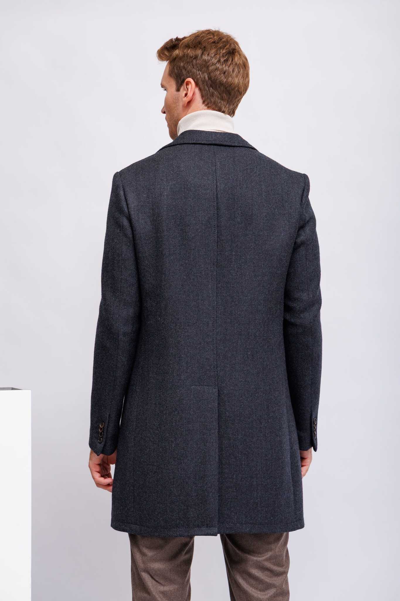Классическое пальто из шерстиСерый цвет в узор "ёлочка"Отложной ворот лацканамиНа пуговицахКарманы- листочкиДлинные рукава на пуговицахСзади - шлицаДлина до колена