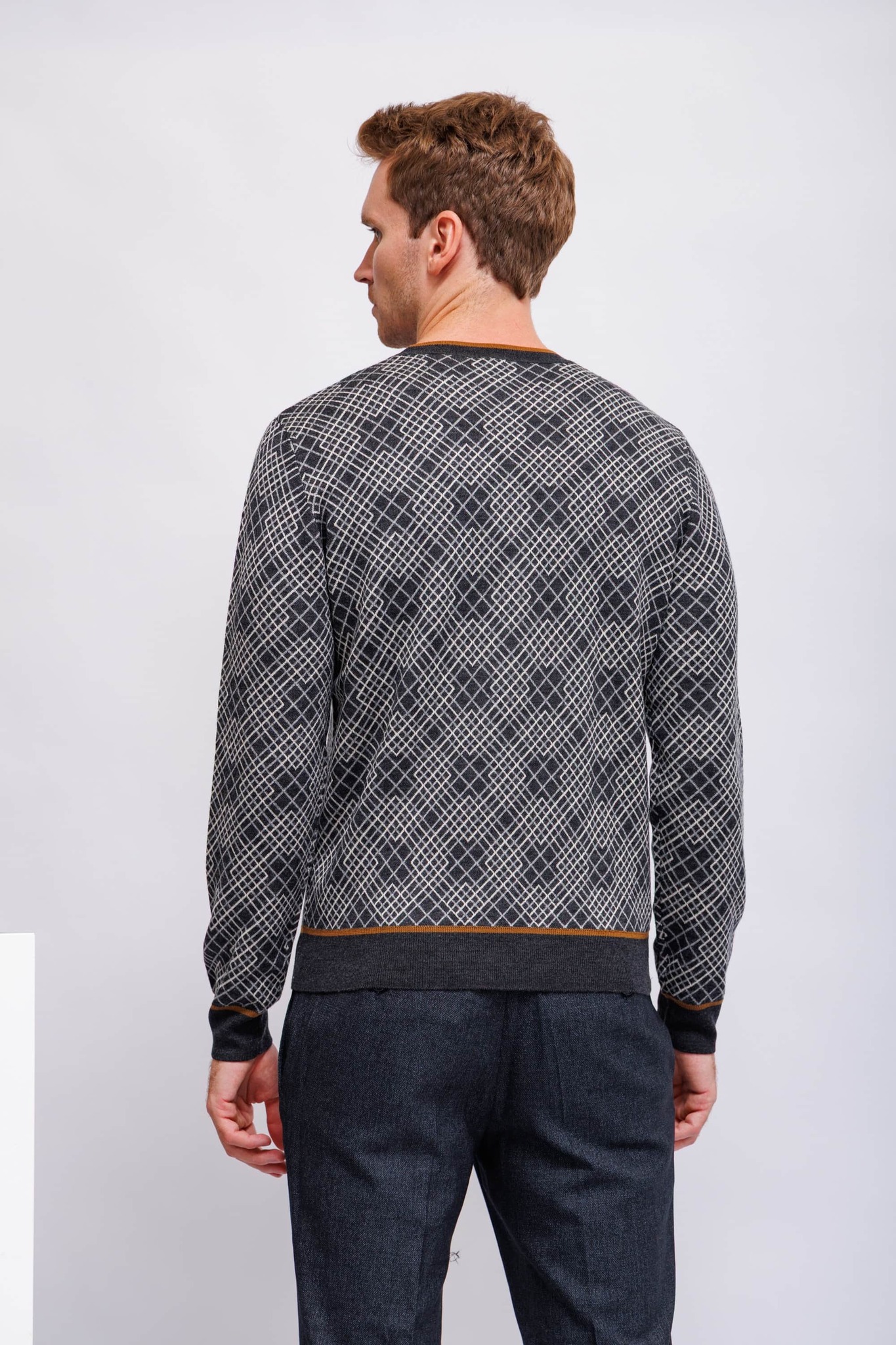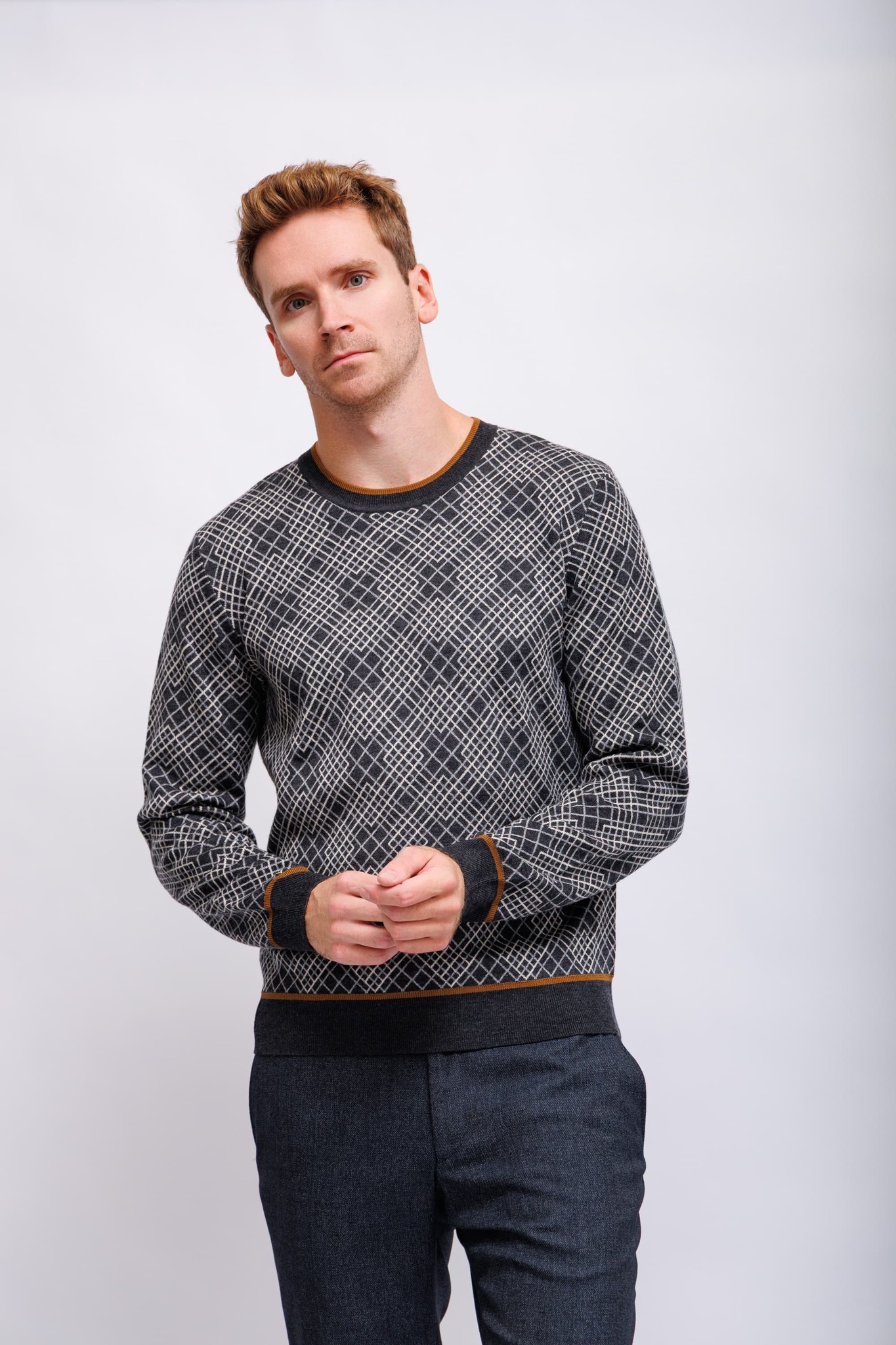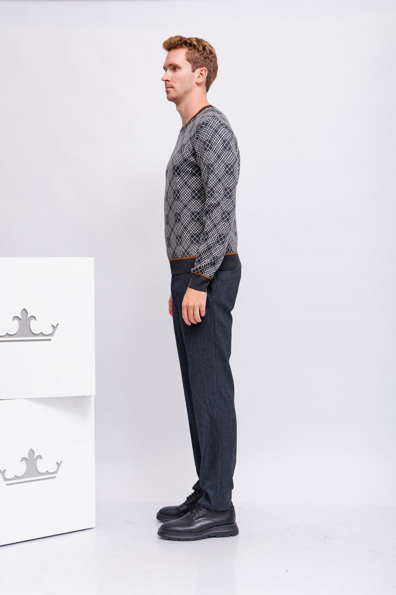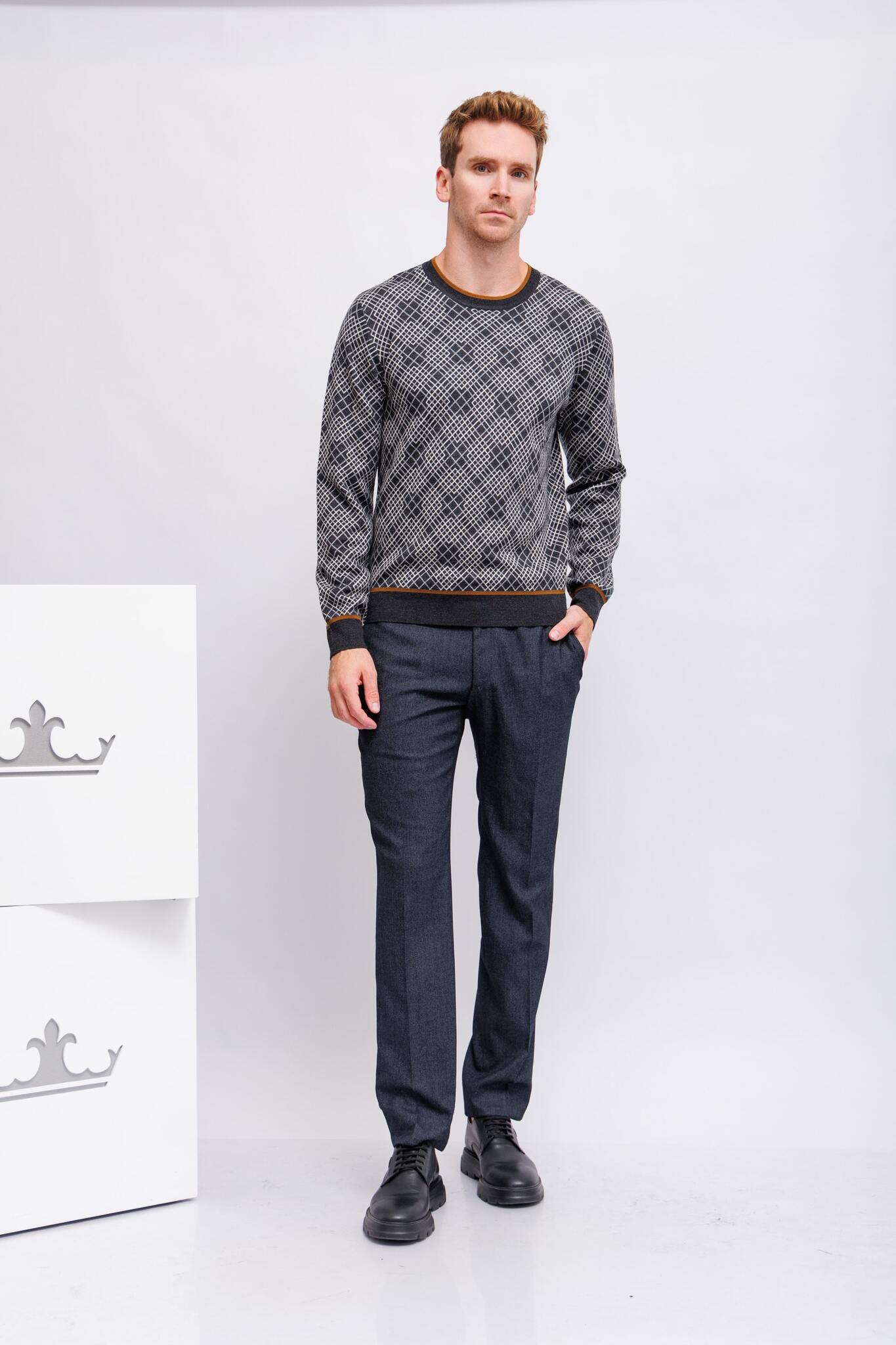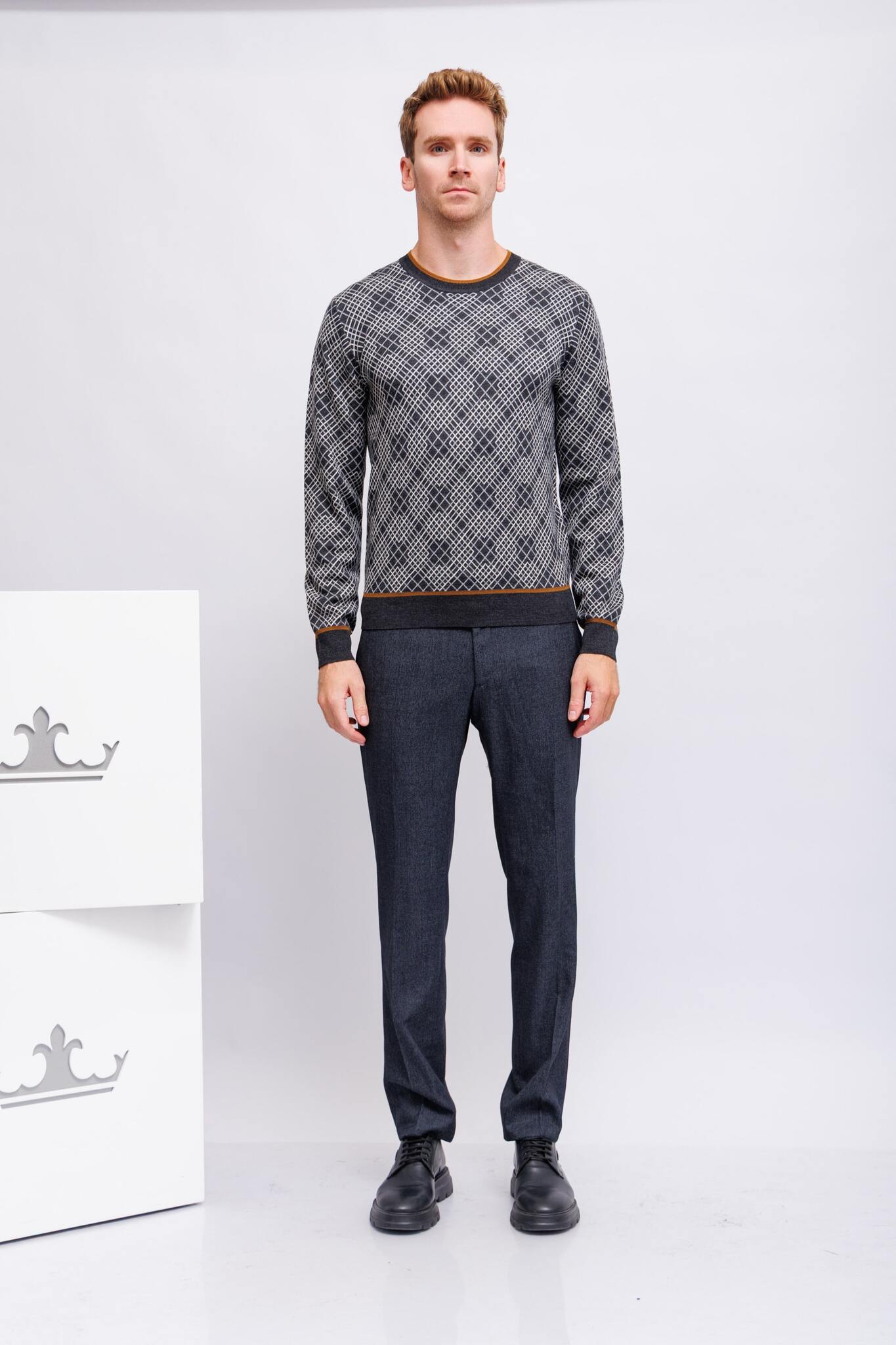 Джемпер в контрастную клеткуСочетание антрацитового, белого и горчичногоКруглый вырезДлинные рукаваПрямой кройМанжеты и низ изделия-эластичный ребристый трикотаж