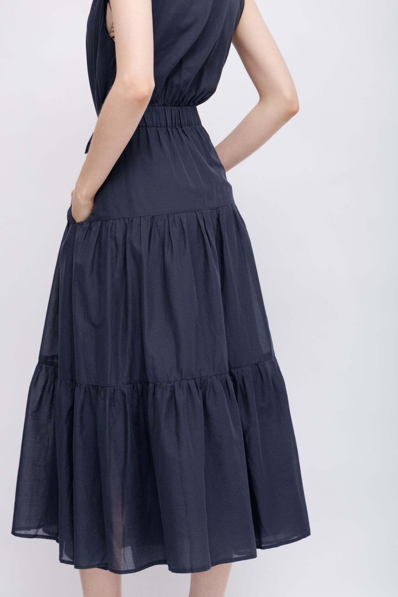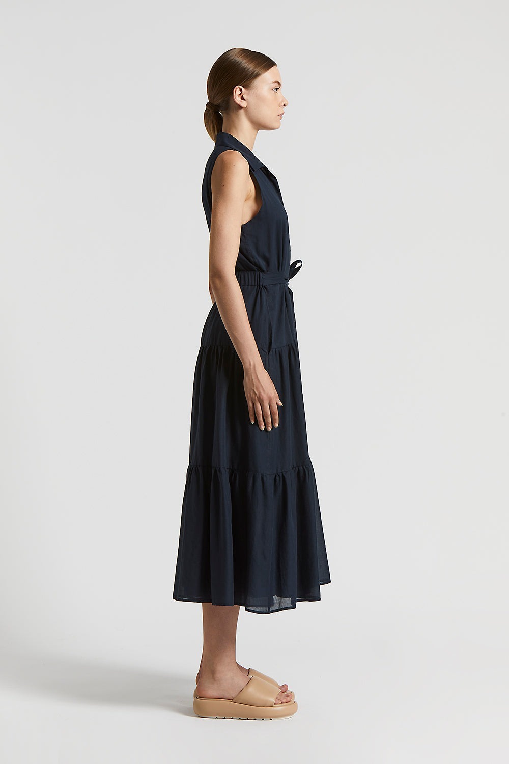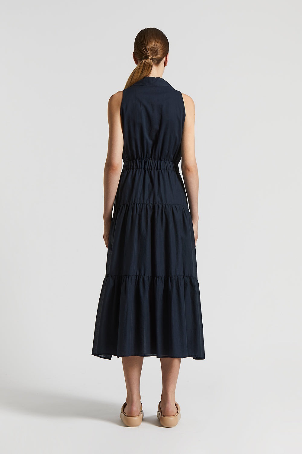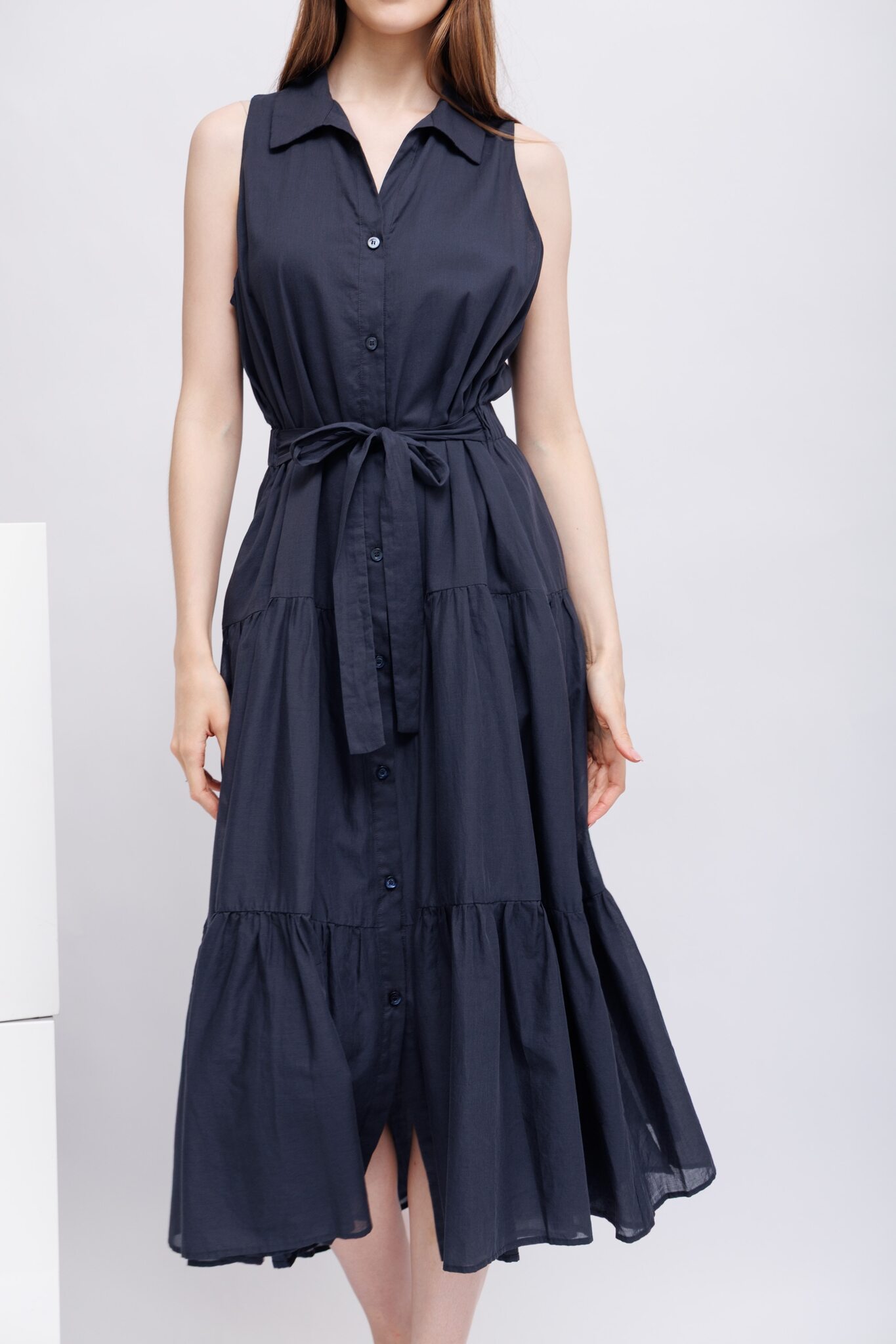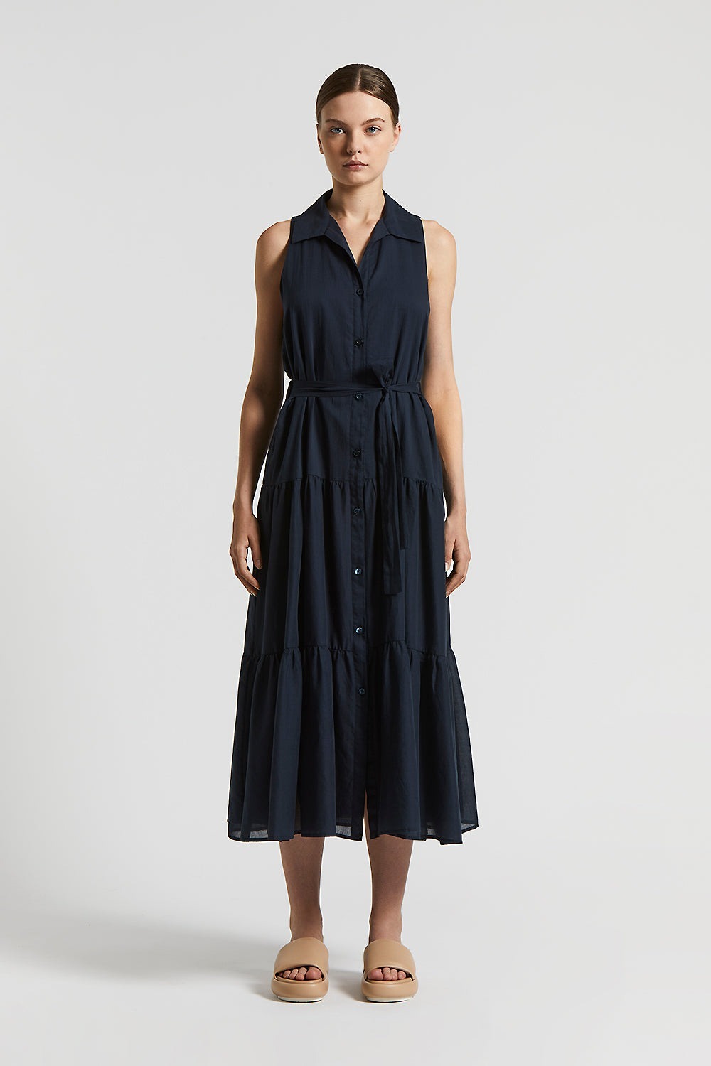 Это длинное платье из легкой чистой хлопковой вуали отличается сдержанной элегантностью. Безрукавный дизайн с воротником придает свежий штрих.