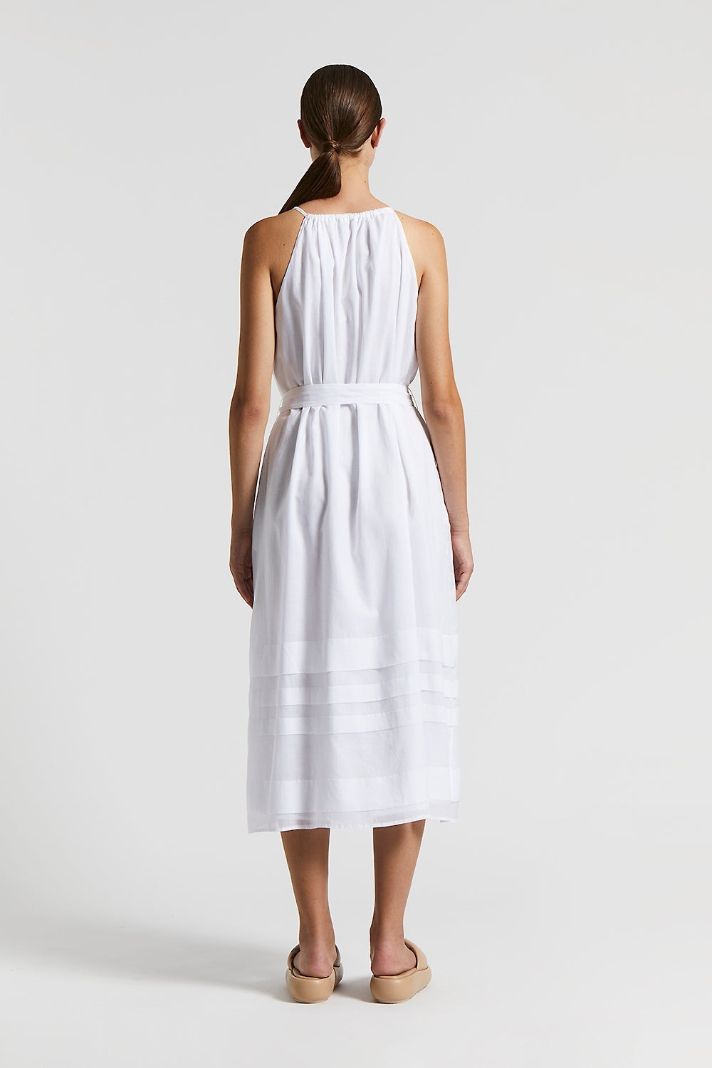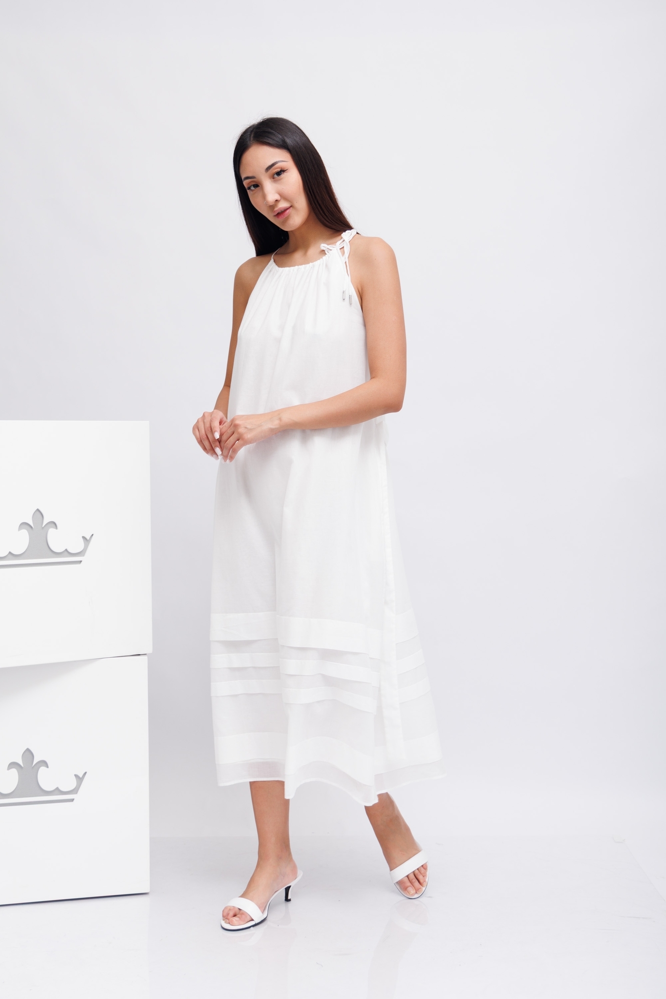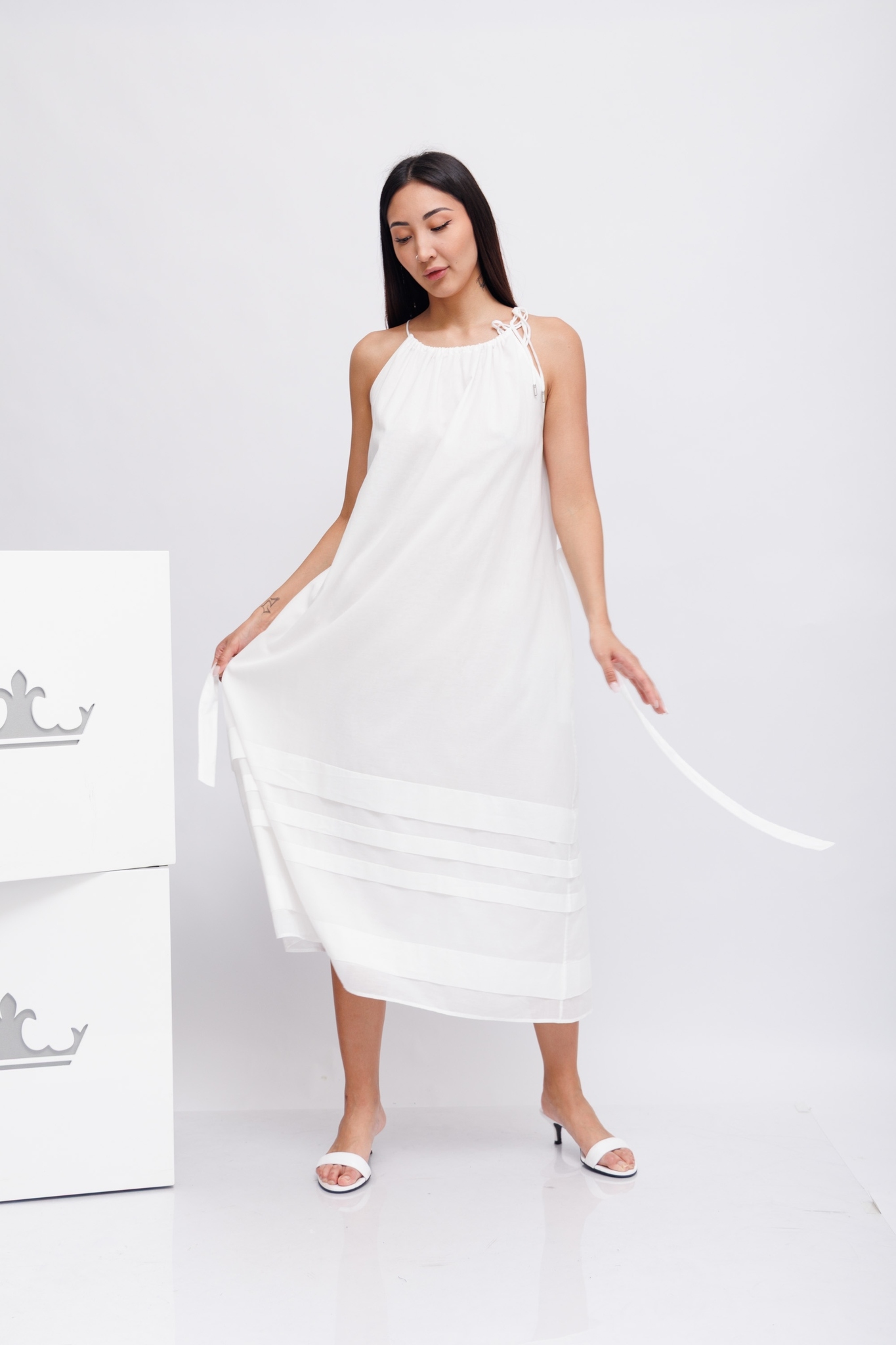 Изготовленное из легкой и изысканной вуали из чистого хлопка, это длинное платье с бретелями воплощает прохладный, романтичный стиль.