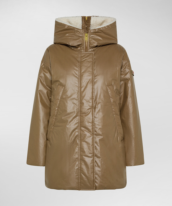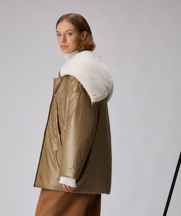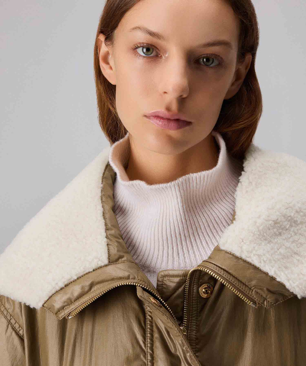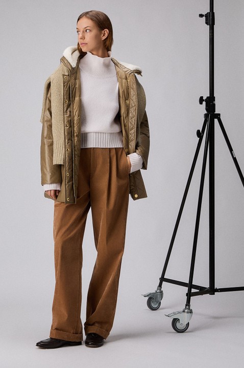 Куртка из гладкого хлопкового холста с легким вощеным покрытием с прямой стороны, что придает ткани техничную, но мягкую текстуру. Сертифицированный натуральный пуховый наполнитель обеспечивает тепловой комфорт и легкость. Капюшон-«авиатор» с подкладкой из искусственного меха можно расстегнуть и превратить в накидку, которая открывается на плечах, оставляя мех открытым и добавляя изысканности. Центральная застежка-молния с двумя бегунками, закрытая клапаном, и прорезные карманы, ненавязчиво интегрированные в лаконичный силуэт изделия. Переосмысление британской классики в современном женственном стиле. Эта модель — современная версия классической вощеной куртки, созданная для приключений на открытом воздухе.