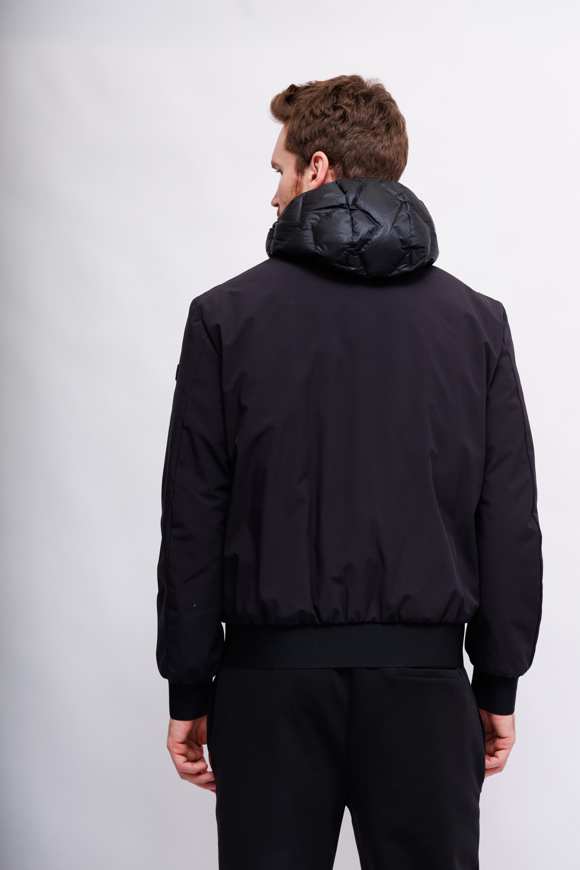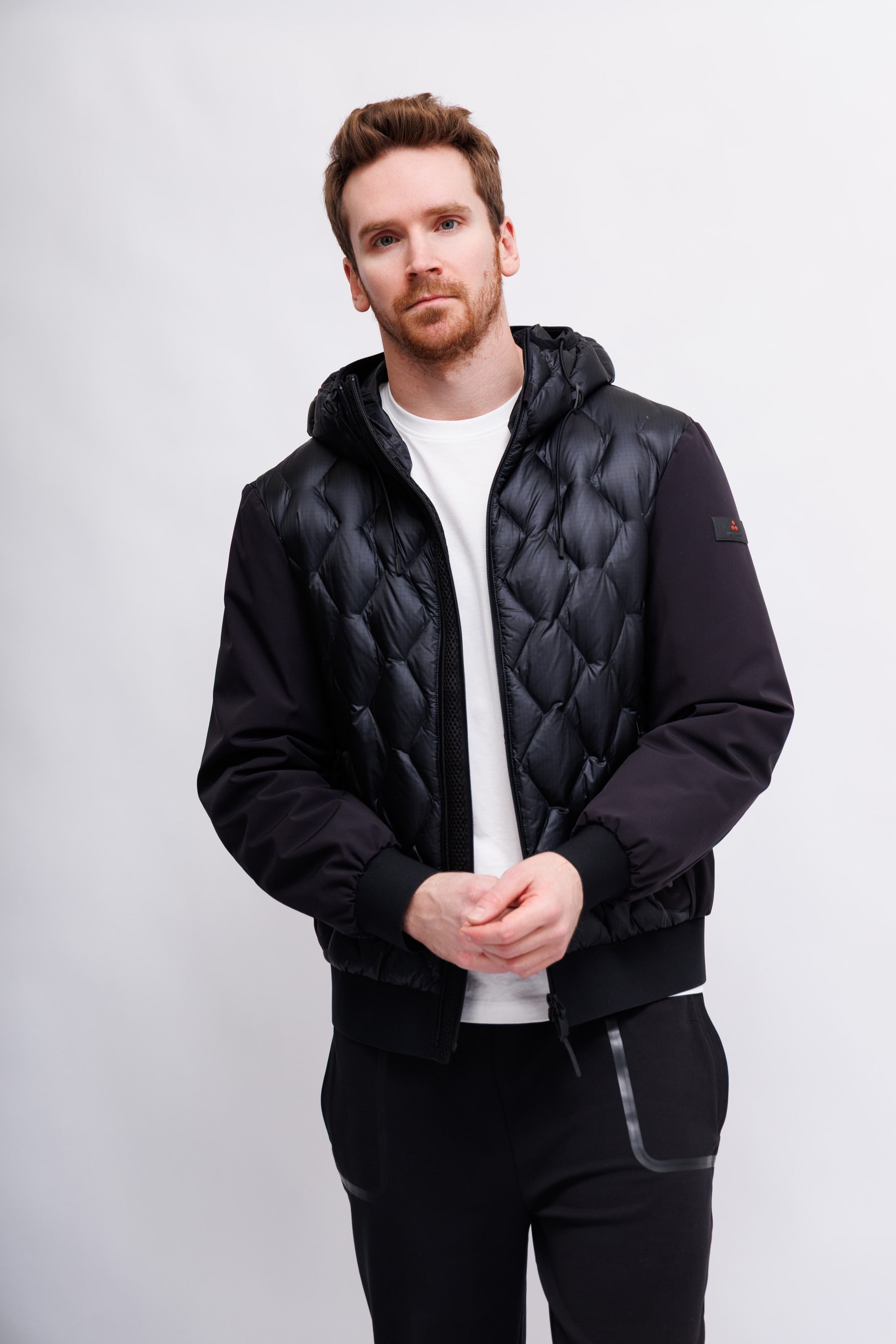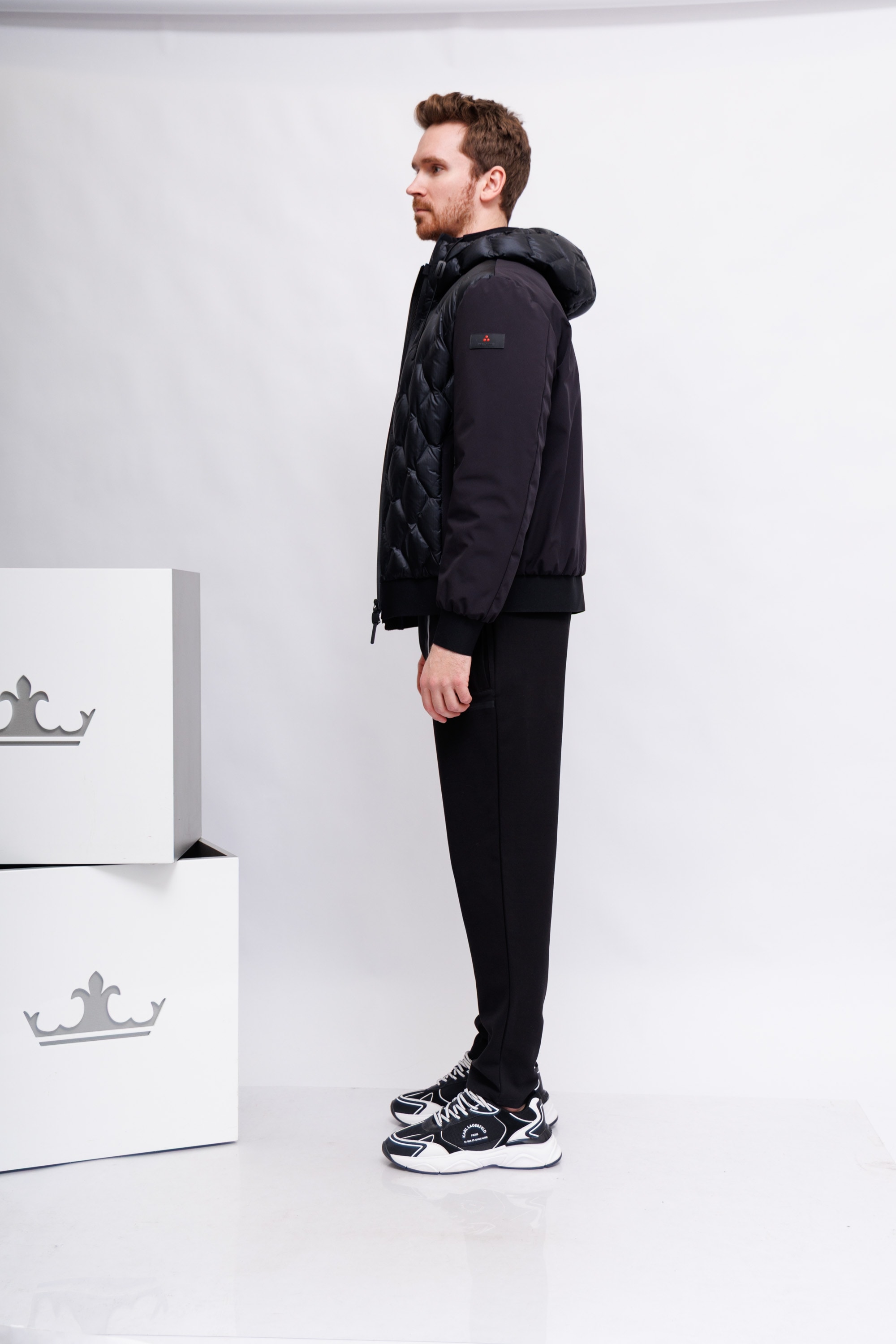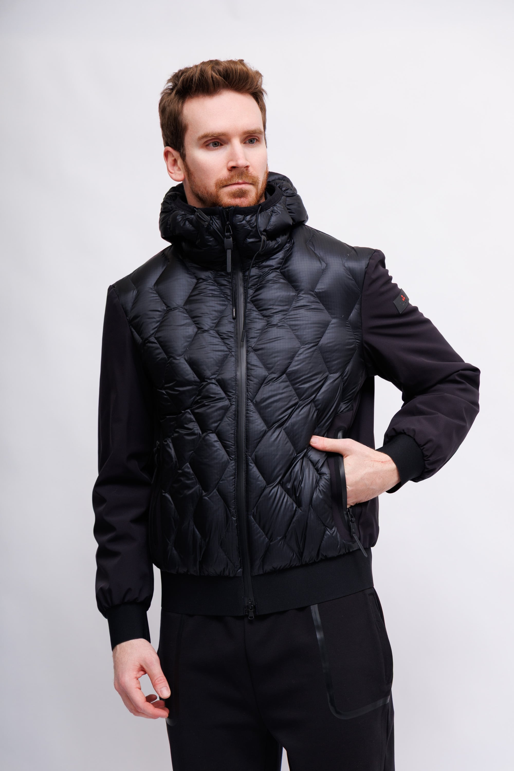 Изготовлена из двух технических материалов: сверхлегкого прочного и блестящего нейлона RipStop плотностью 7 ден и эластичного нейлонового холста в сочетании с мягким и теплым нейлоновым трикотажем, что обеспечивает технологичность и невероятный комфорт. Оригинальный дизайн включает переднюю часть с геометрической ромбовидной стежкой, а рукава и спинка выполнены в однотонном варианте. Манжеты и низ из черного эластичного трикотажа. В результате получилась очень модная вещь для тех, кто не хочет оставаться незамеченным. Стилистические и эстетические детали подтверждают городской дух этой верхней одежды, которая имеет: центральную двойную молнию по всей длине, фиксированный регулируемый капюшон, сертифицированный натуральный пуховый наполнитель, два больших боковых кармана с термо-сварными молниями. Изготовлена из водонепроницаемого материала с технологией предотвращения линьки пуха