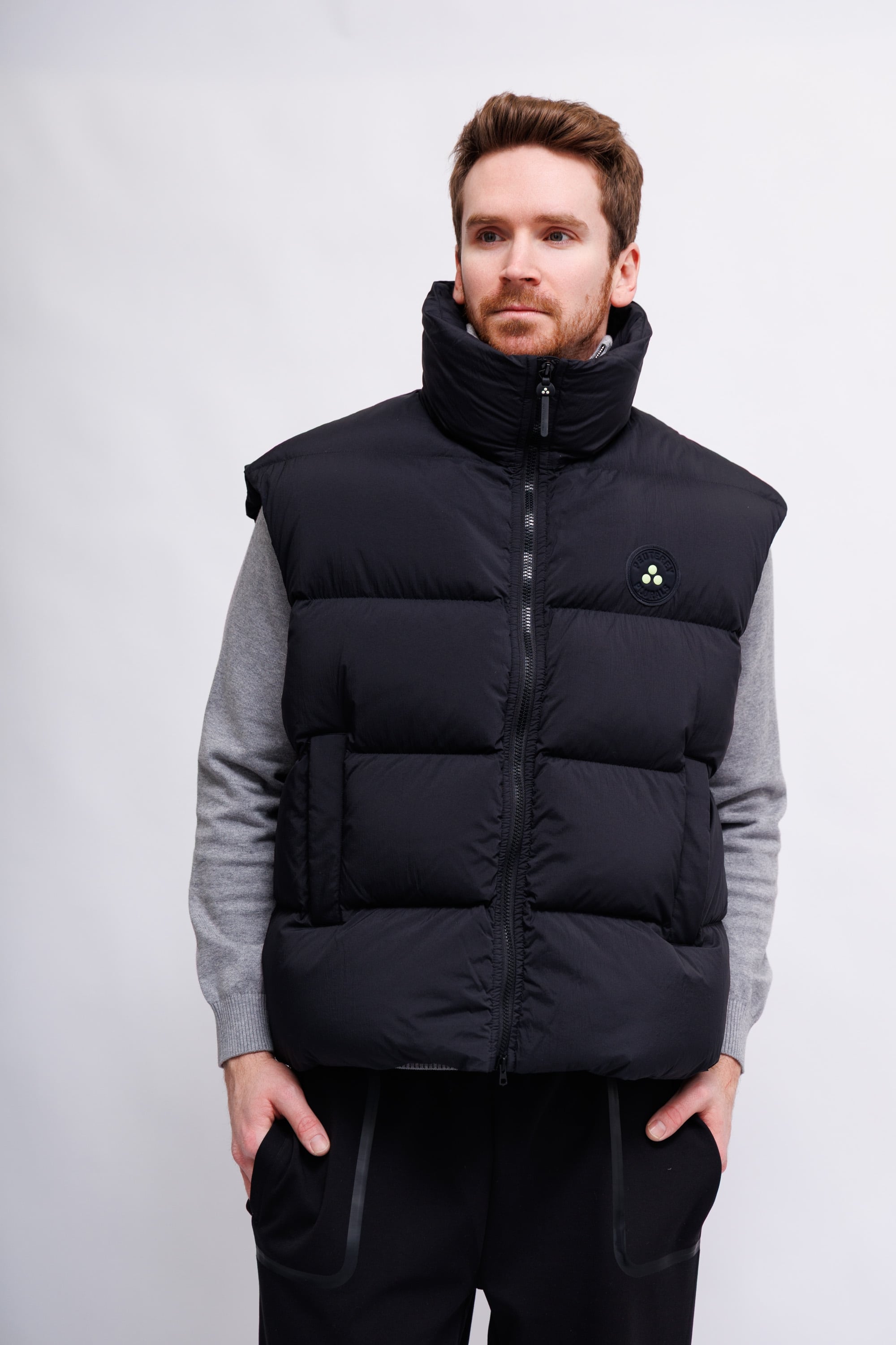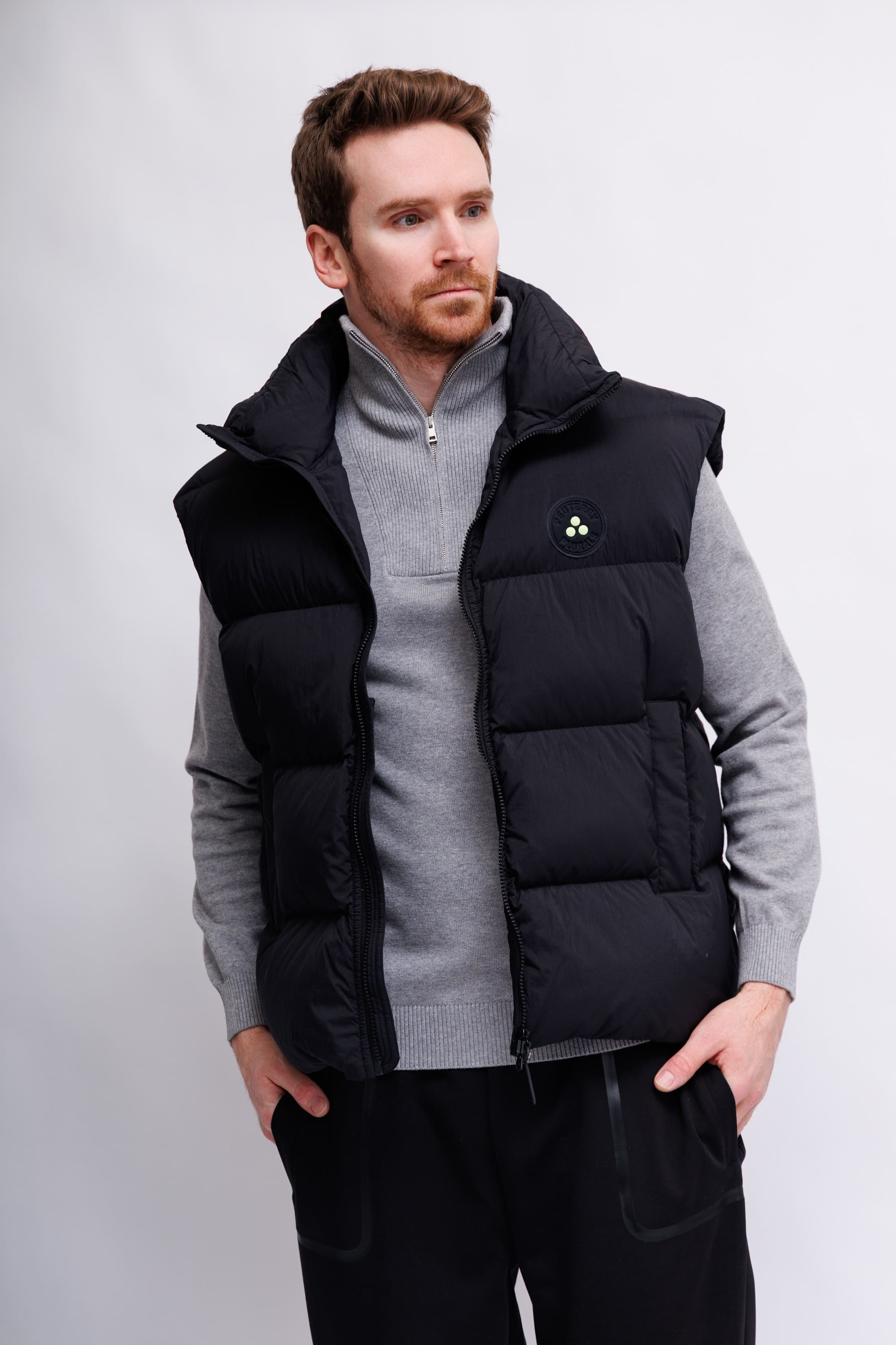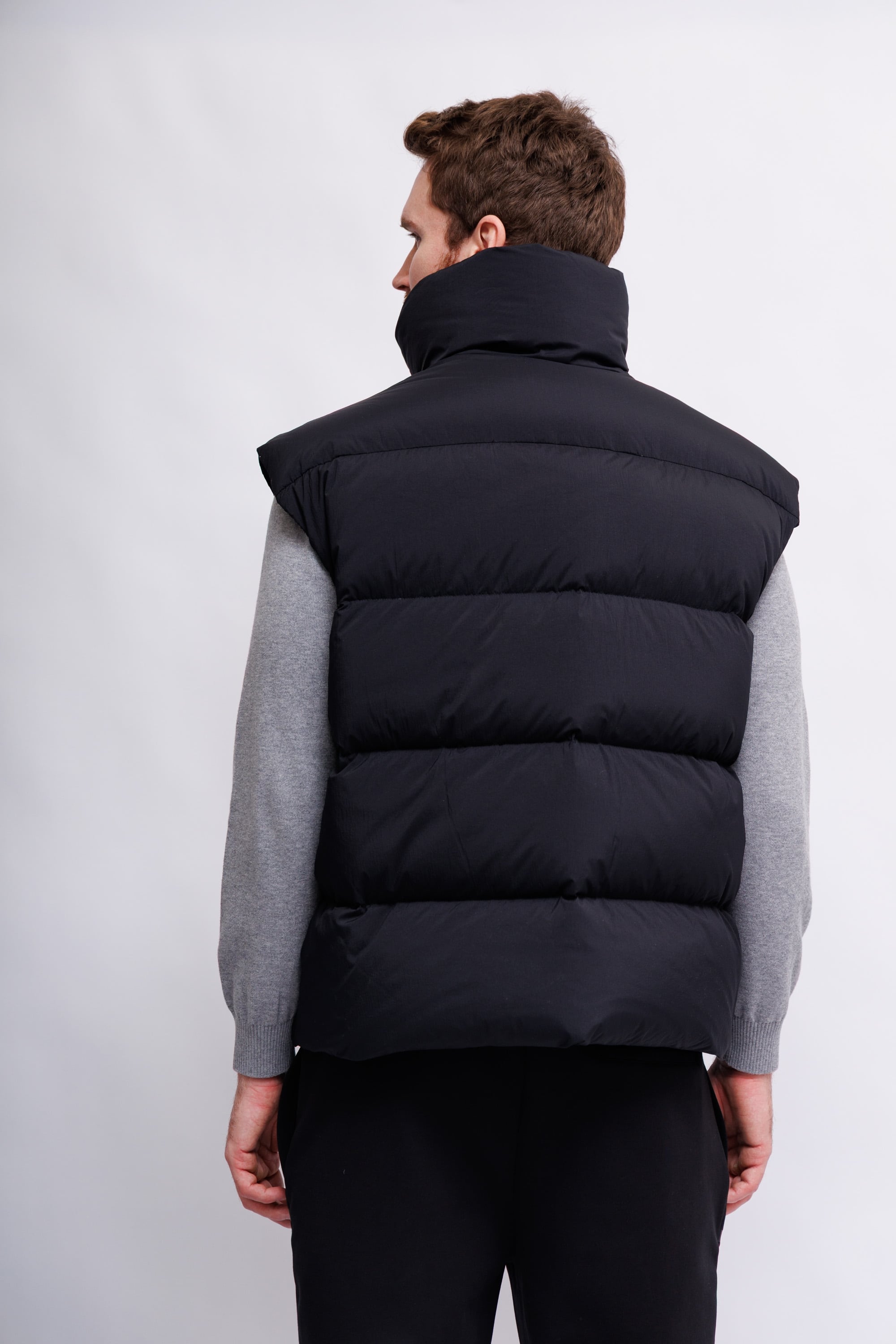 Изготовленный из матового черного сверхлегкого нейлона (всего 20 ден), с объемным кроем и макси-стежкой, этот жилет сочетает в себе уличный стиль и технические характеристики. Сертифицированный натуральный пуховый наполнитель обеспечивает бескомпромиссный тепловой комфорт, а водоотталкивающая обработка без ПФУ(PFC) гарантирует защиту без вредных для окружающей среды веществ. Благодаря двойной молнии, боковым прорезным карманам и круглой нашивке с логотипом на груди, это воплощение современного стиля, которое не останется незамеченным.