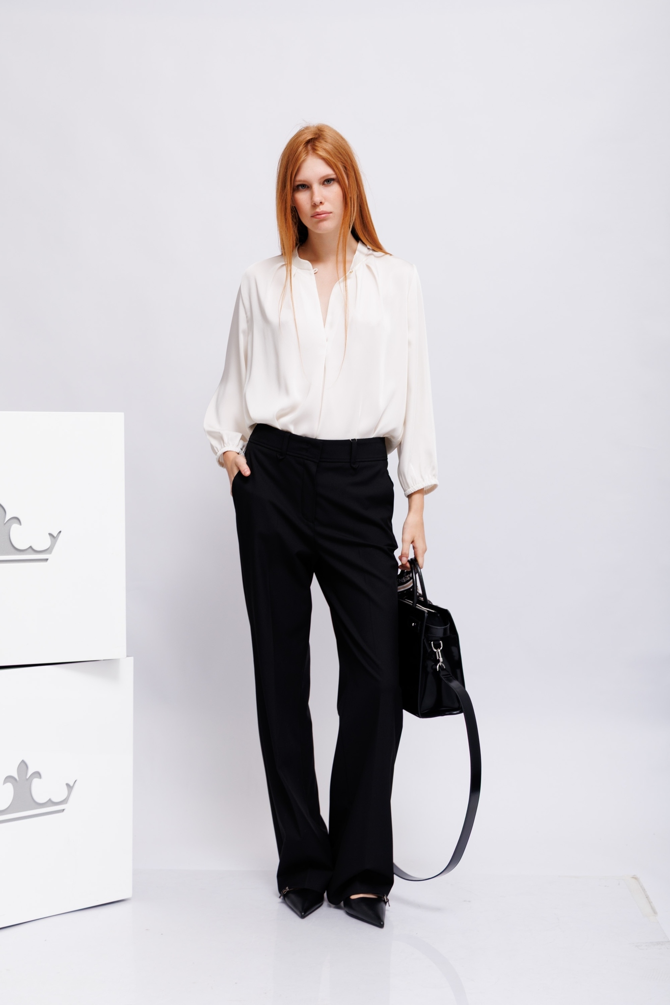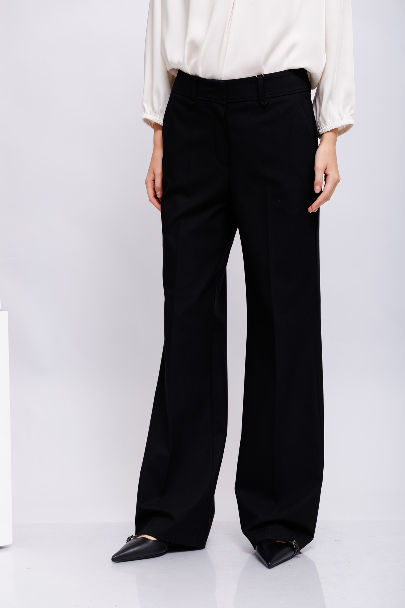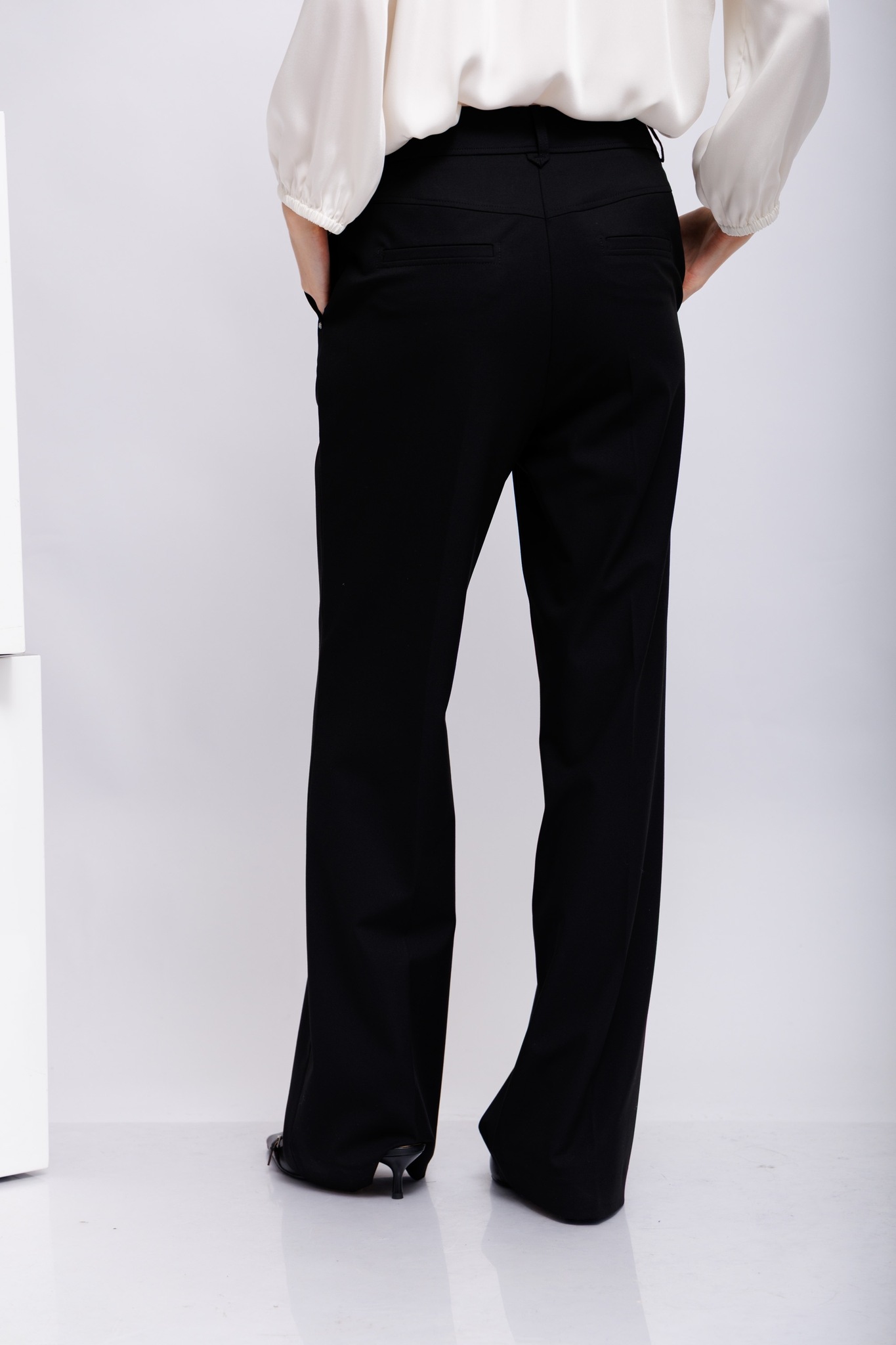 Брюки черныеГульфик на молнии и металлическом крючкеПосадка средней высотыКосые боковые карманыСзади- карманы- листочки и кокеткаРасклешенный кройДлина полноценна
