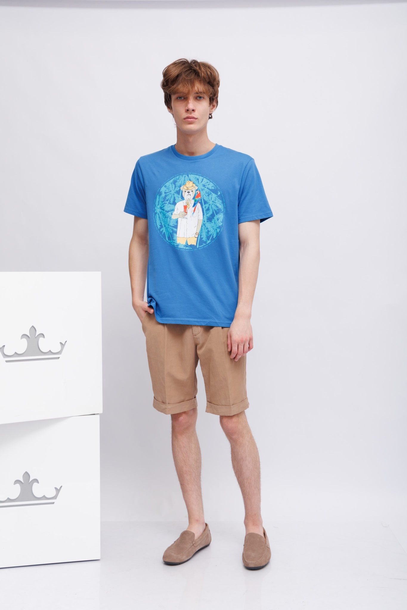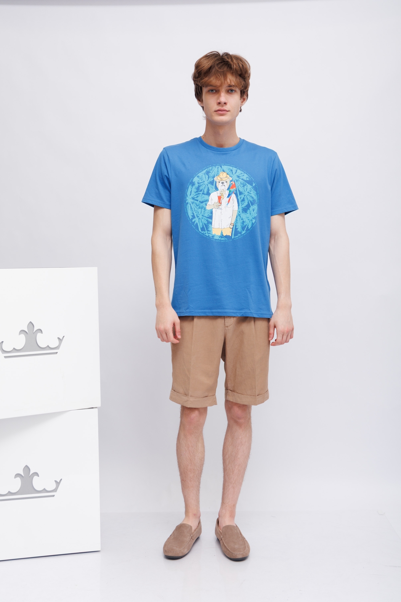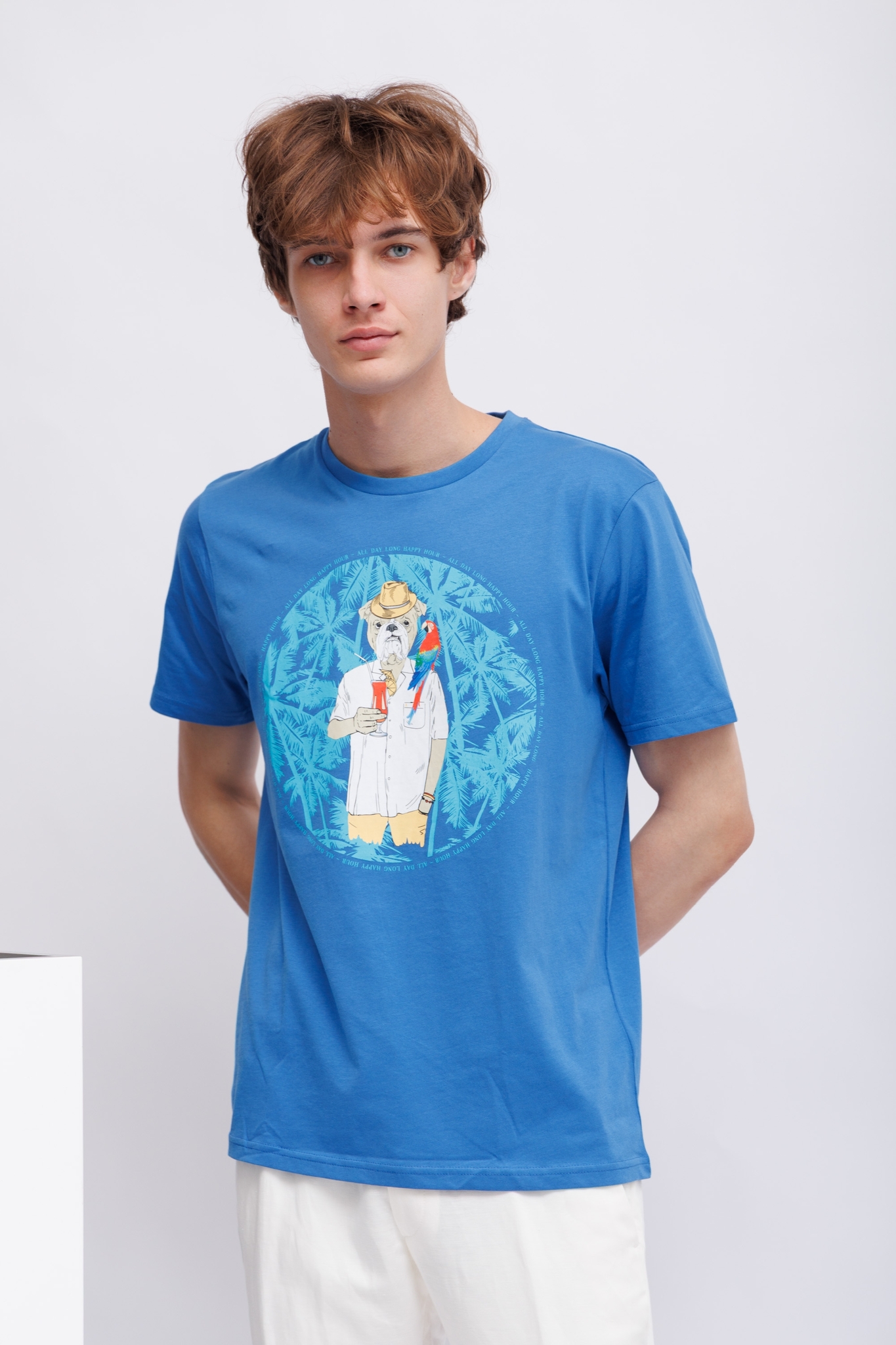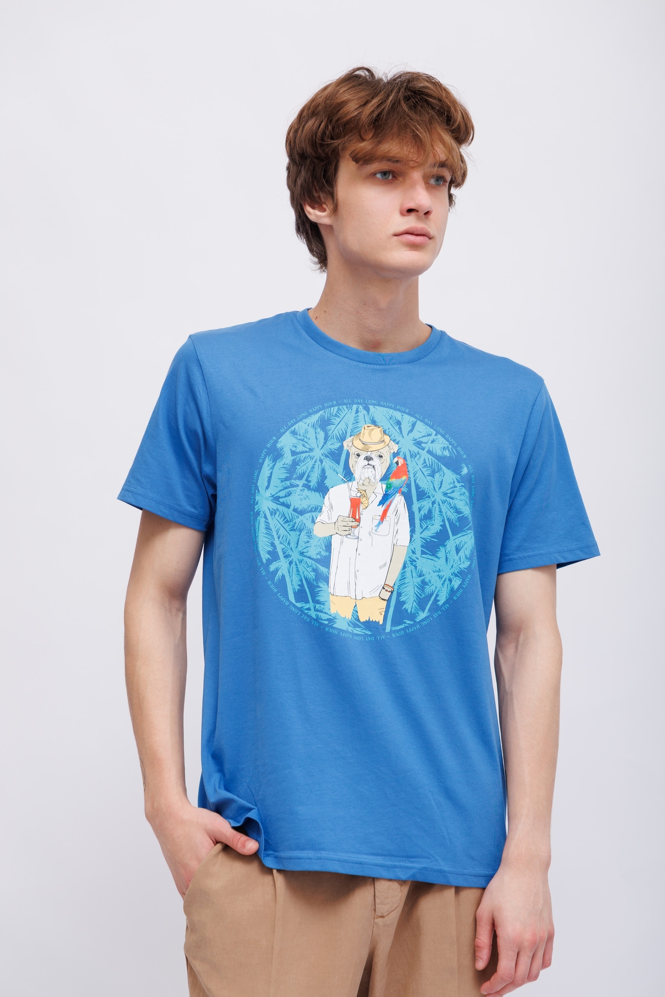 Футболка ярко-синяя с бульдогом-символом марки- на отдыхеКруглый вырезКороткие рукаваПрямой крой