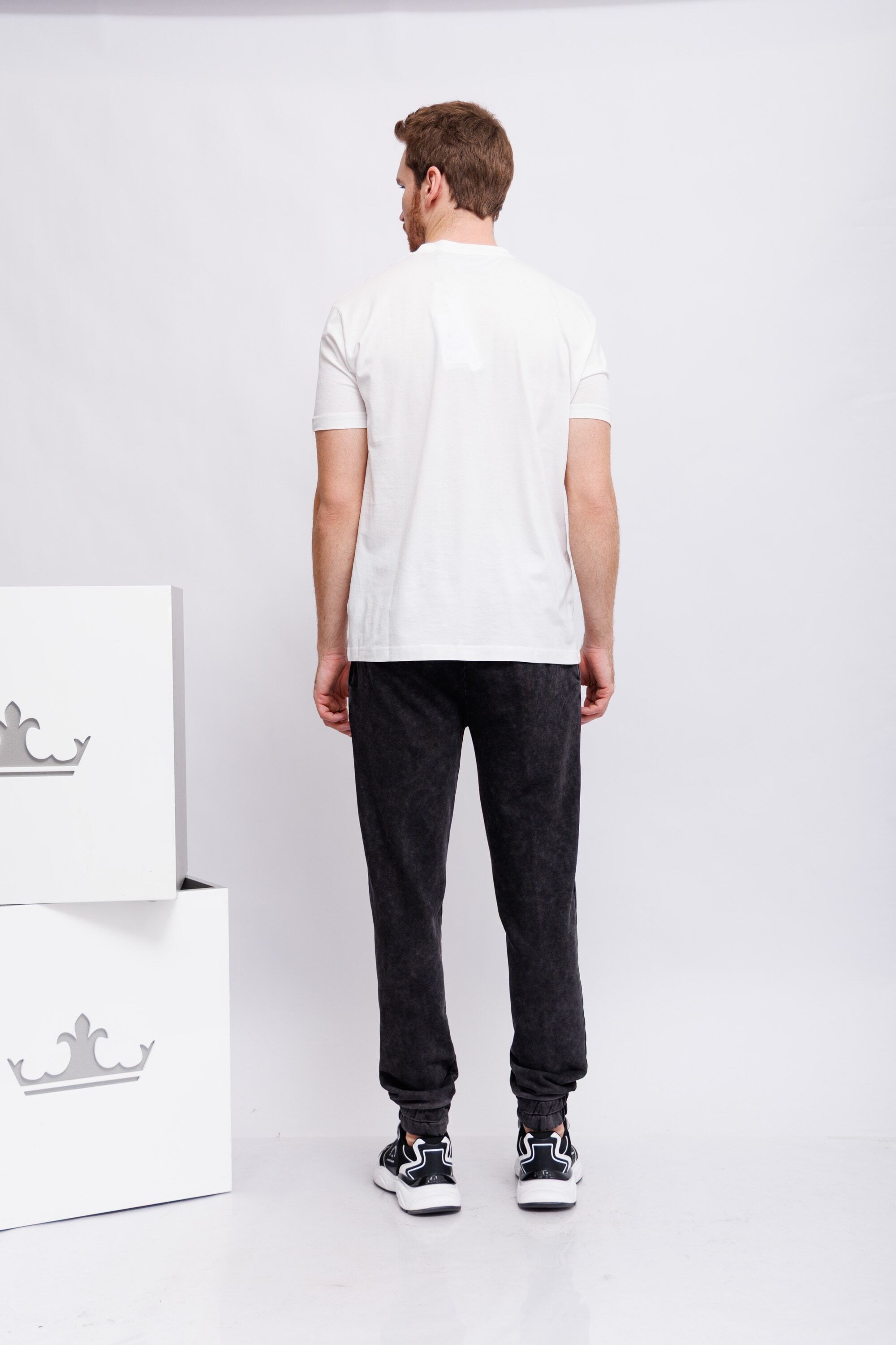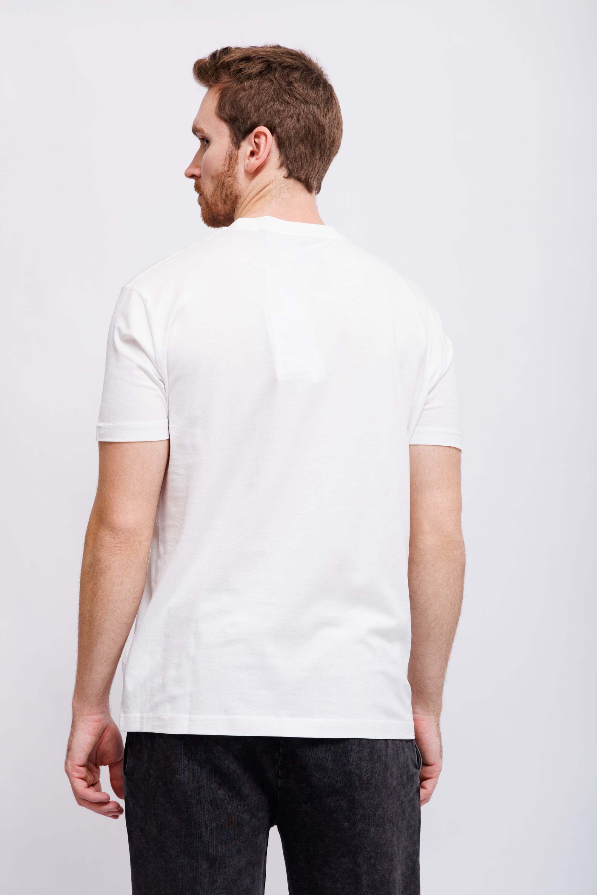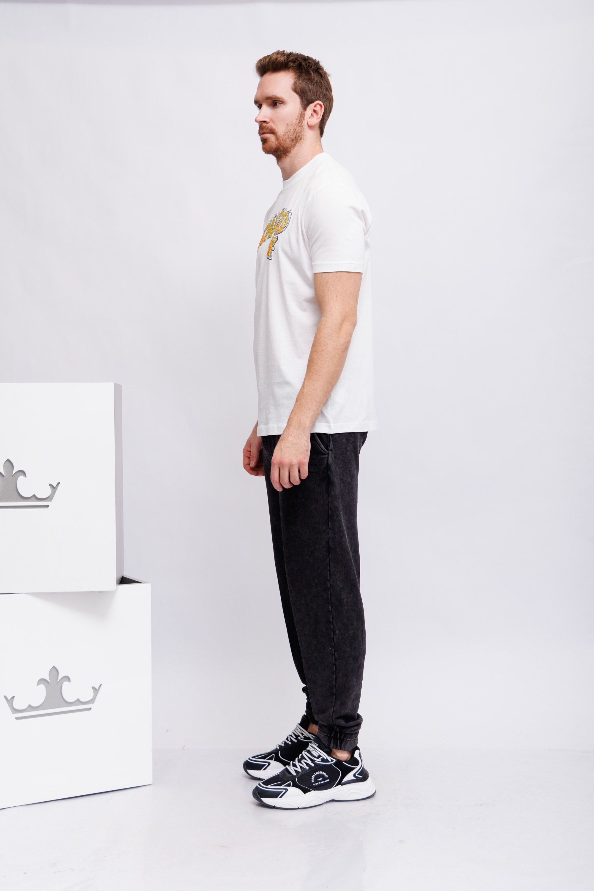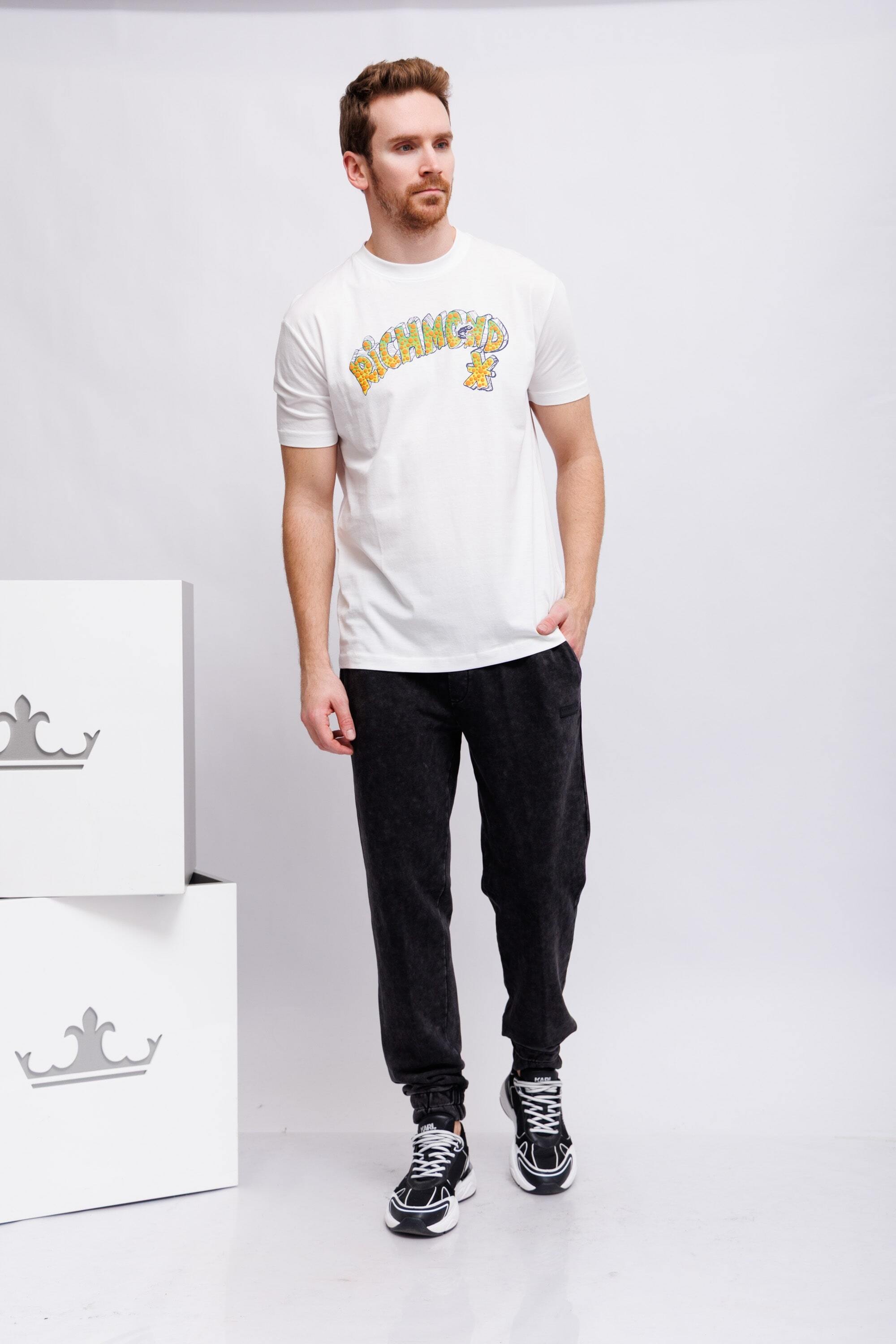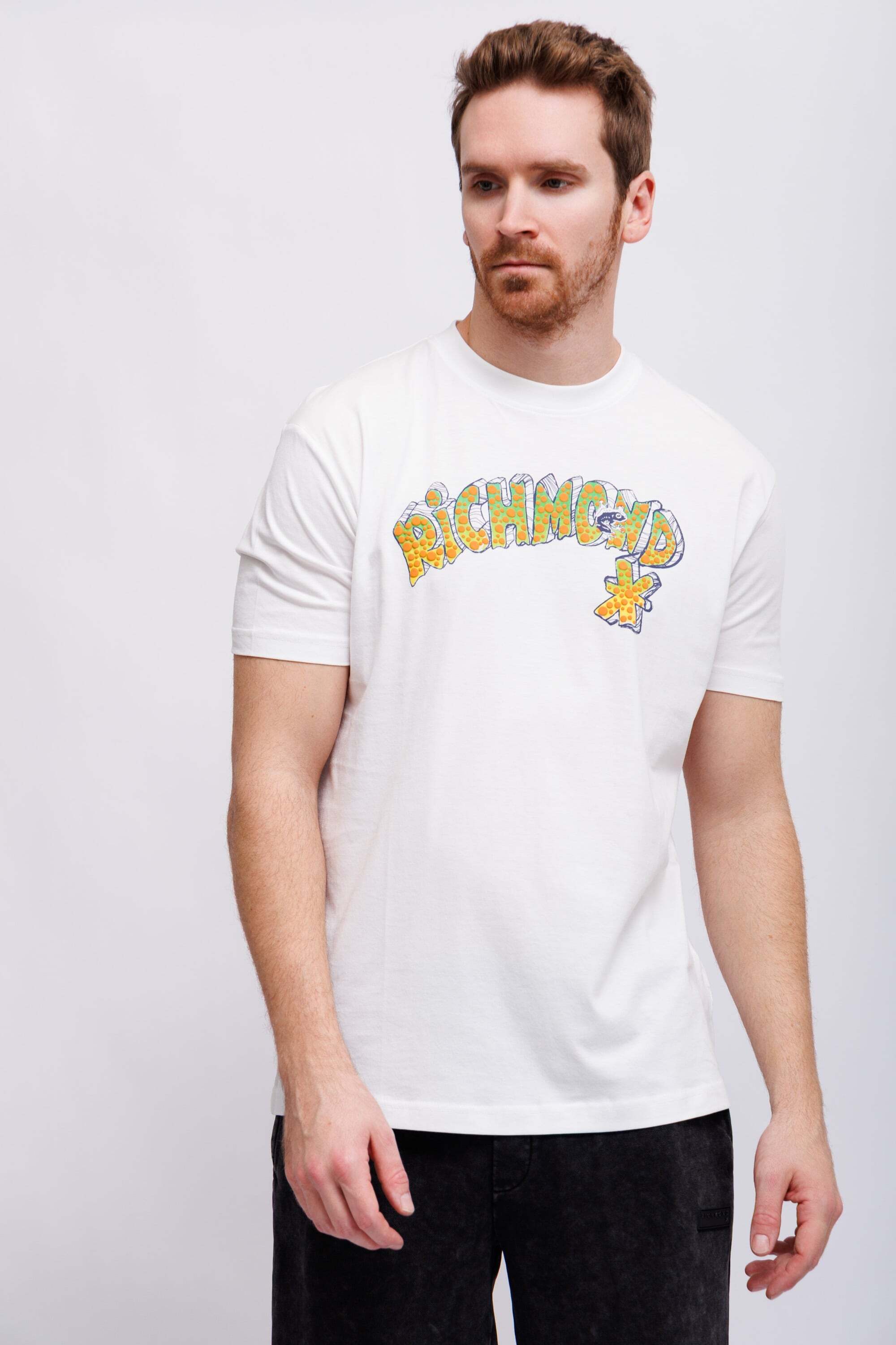 Футболка белая хлопковаяНа груди-контрастный логотип в мультяшном стилеКруглый вырезКороткие рукаваПрямой крой