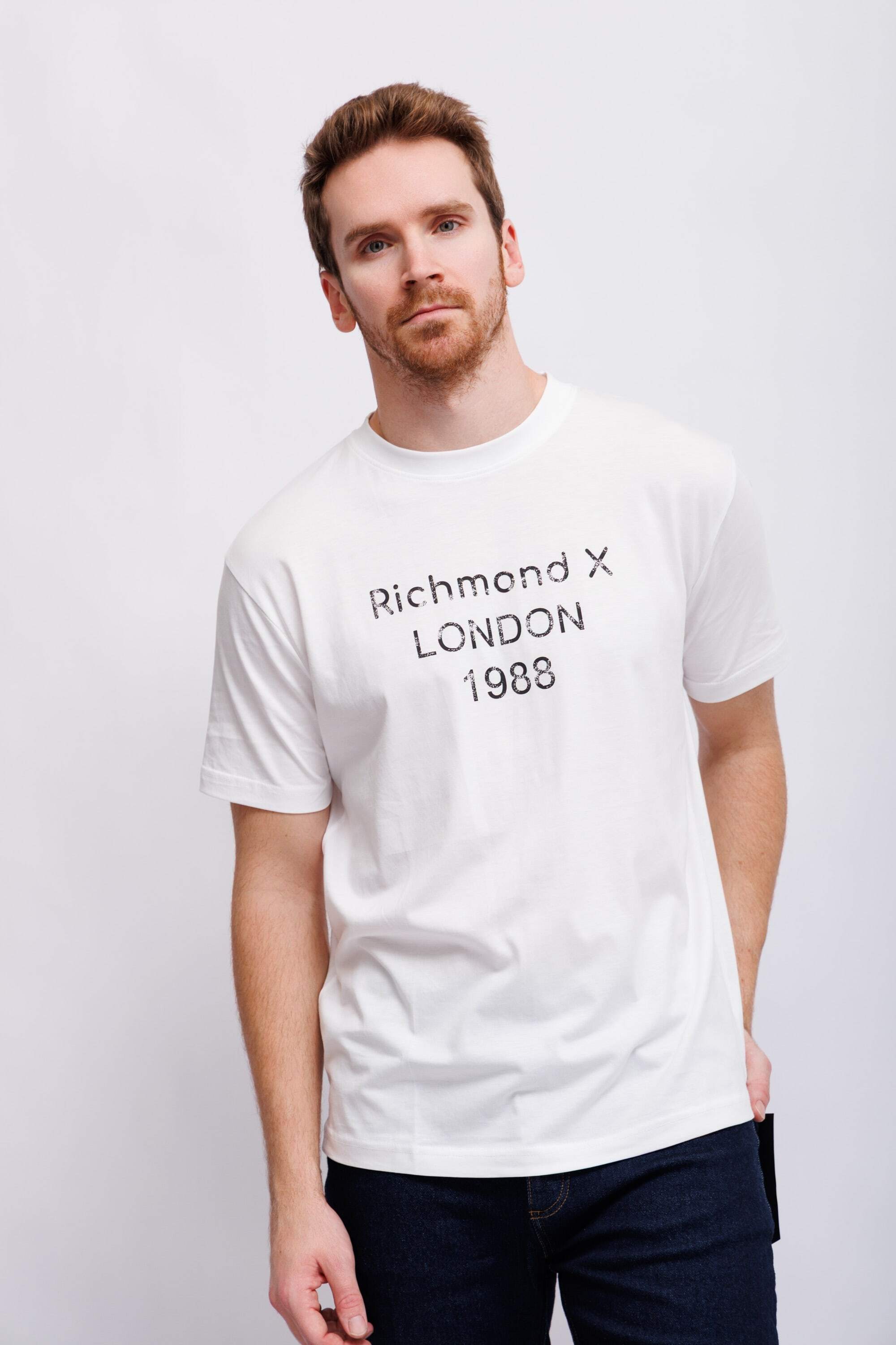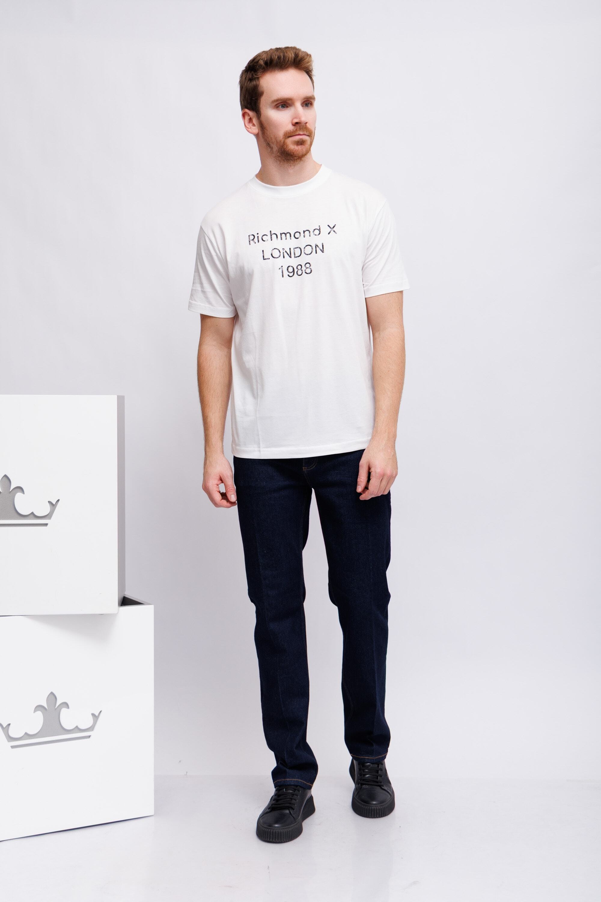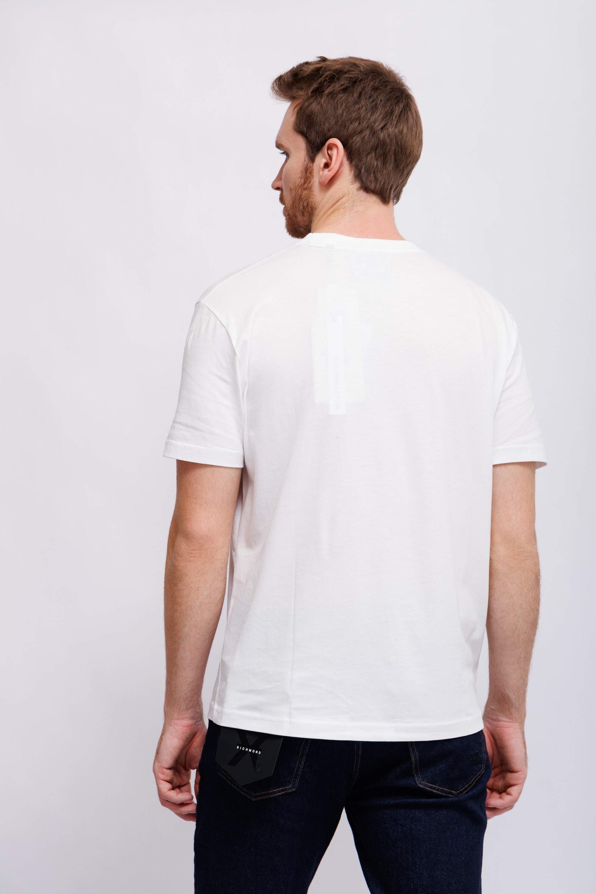 Футболка белая хлопковаяС эффектом меланжНа груди- логотип в тонКруглый вырезКороткие рукаваПрямой крой